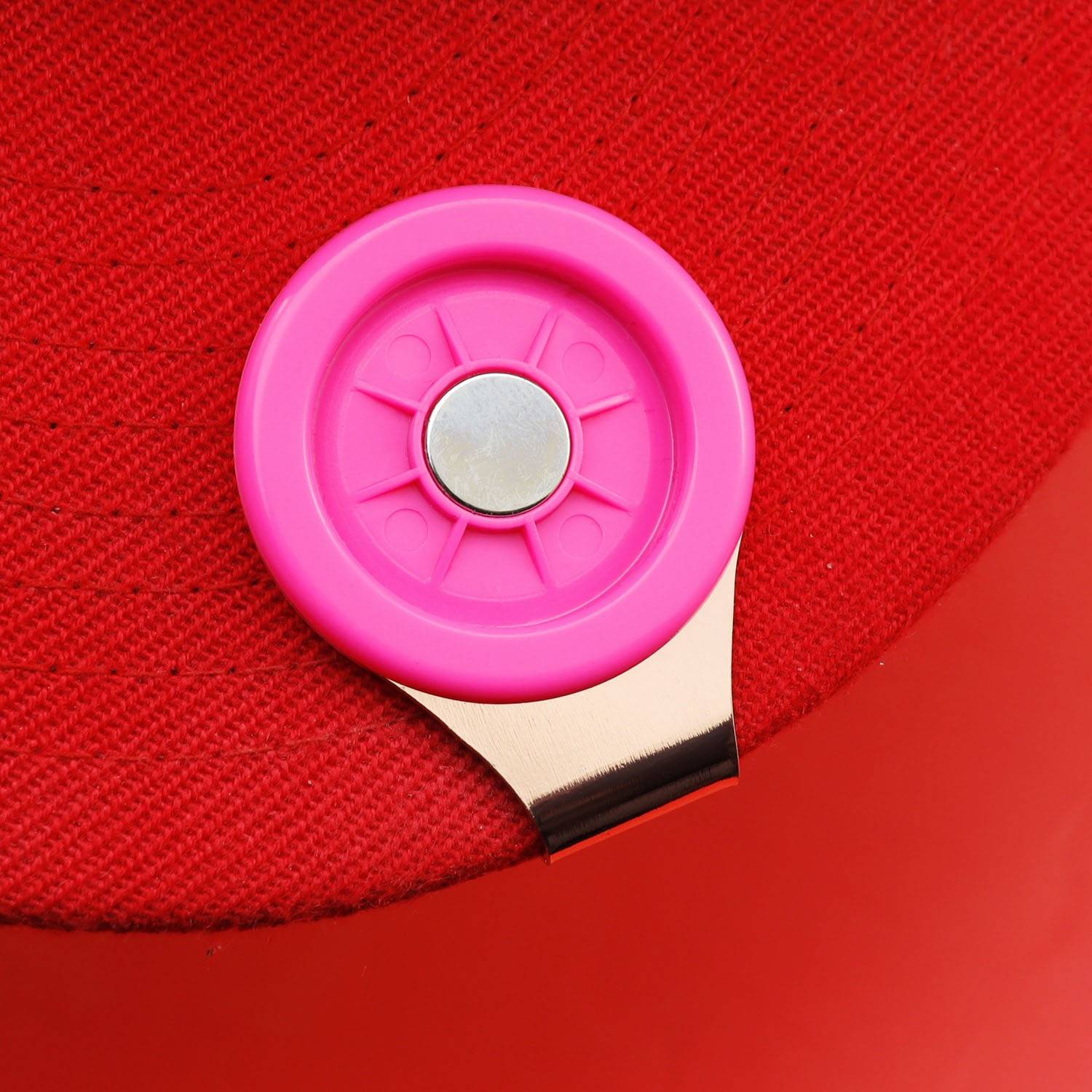 This golf cap clip attaches securely to hats with its sturdy metal spring mechanism. Includes an iron ball marker featuring vivid multicolor choices: black, white, red, pink, green, yellow, blue. Plastic elements enhance lightweight portability. Clip holds firmly during swings or wind while marker provides clear ball position identification on greens. Designed for course use, driving ranges, or golf tournaments. Both items resist weather for lasting performance.