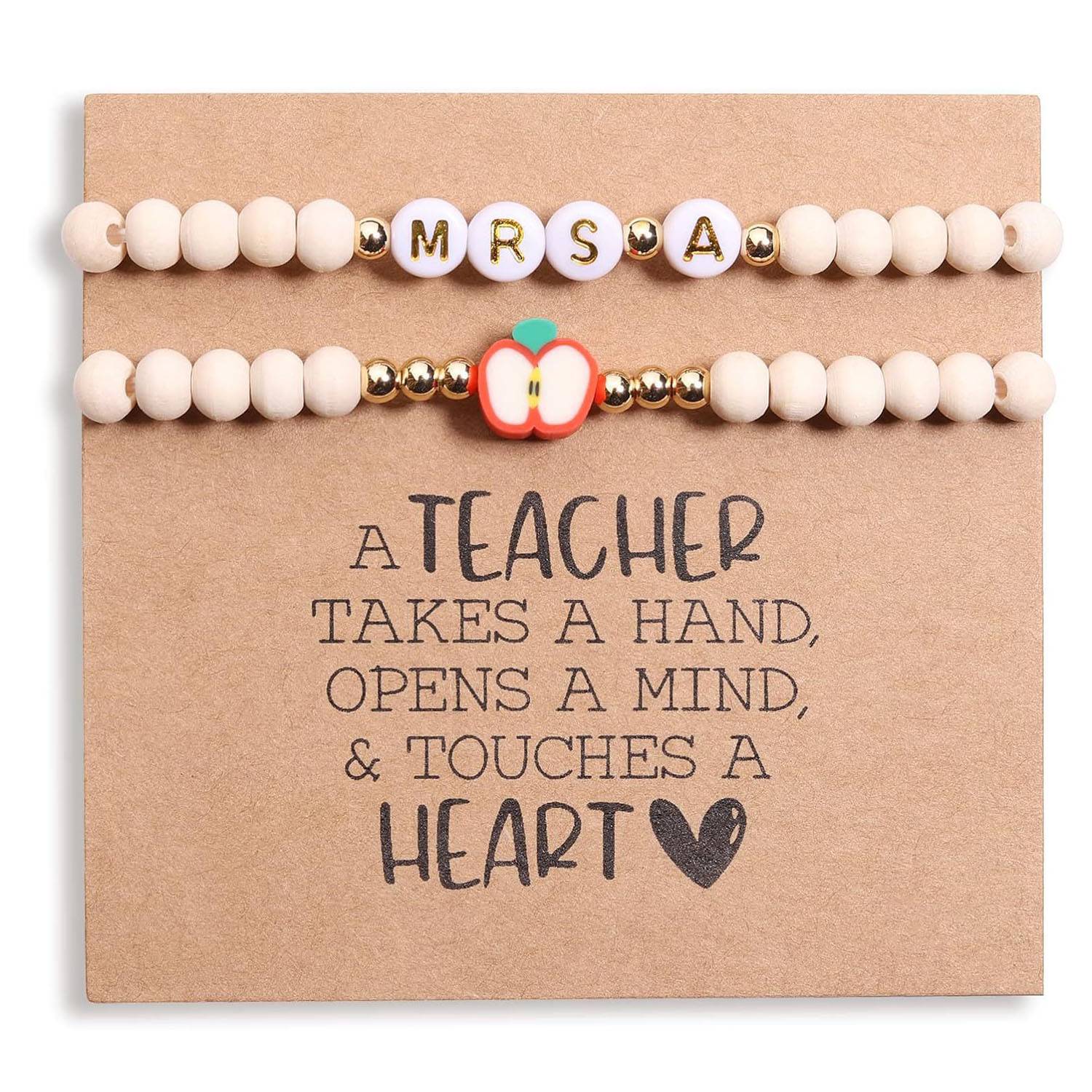 This personalized teacher bracelet set includes one with “MRS” and an initial, and another with a red apple charm. Made from wood and soft clay, each handmade bracelet is durable, skin-friendly, and unique—perfect for sensitive skin. Designed with a strong stretch cord, it fits most wrists comfortably. Customize with Miss, Mrs, or Ms for a thoughtful gift. Ideal for birthdays, holidays, teacher appreciation, or daily wear, it adds meaning and charm to any outfit.