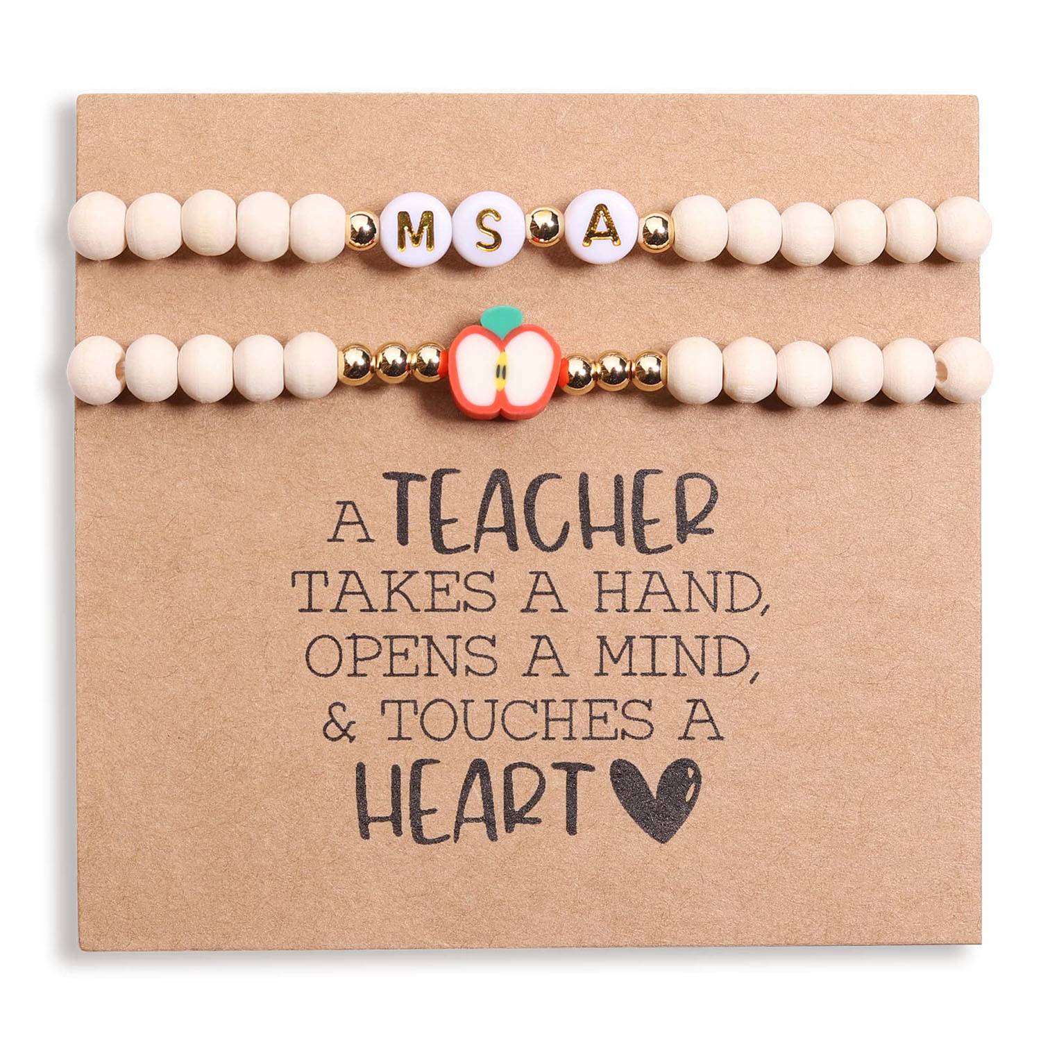 Handmade teacher bracelets made of wood and soft clay, hypoallergenic, stretchy, customizable, ideal for gifts, and celebrations.