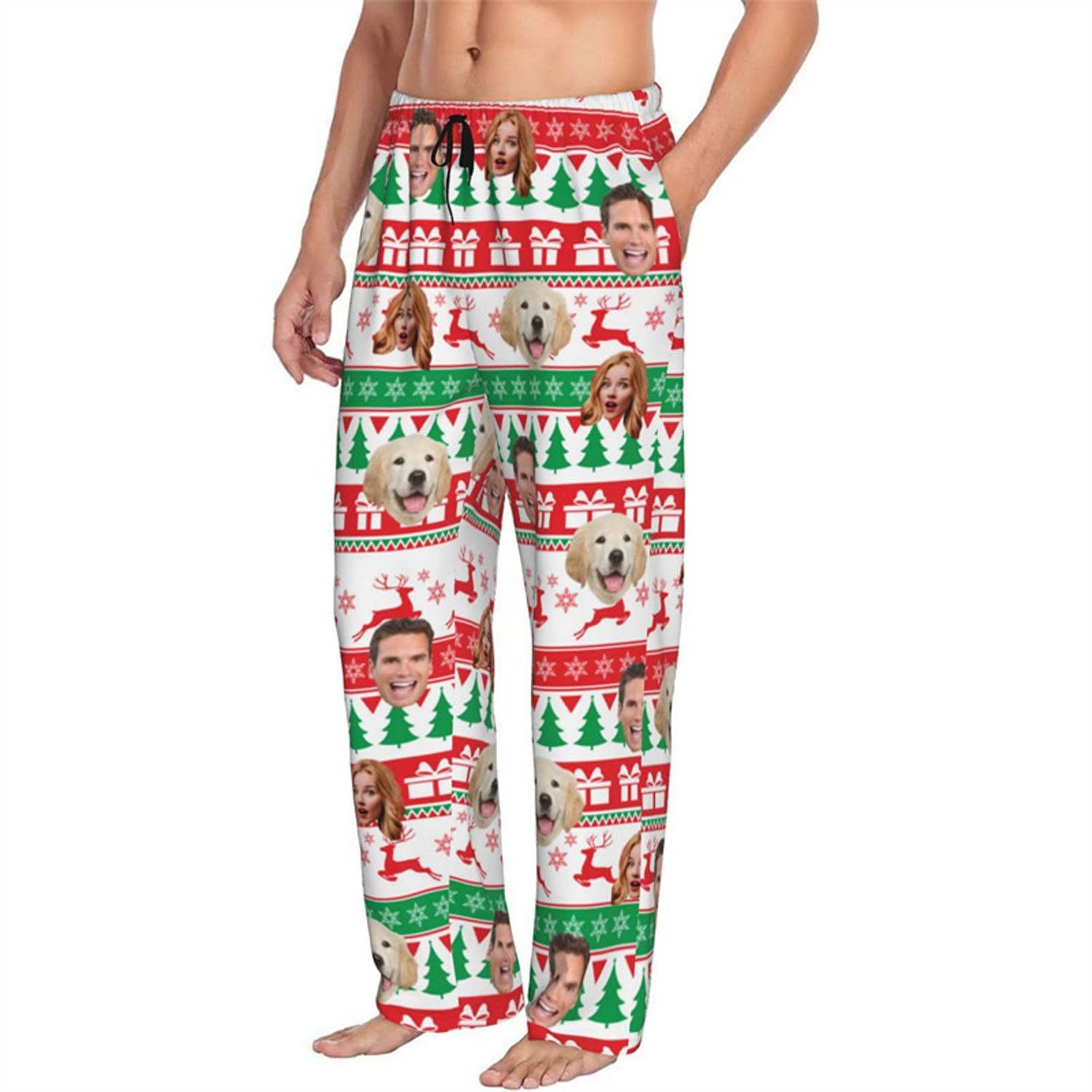 Custom polyester pajama pants with photo/name, soft, elastic, perfect for sleep, lounging, yoga, or festive gift occasions.