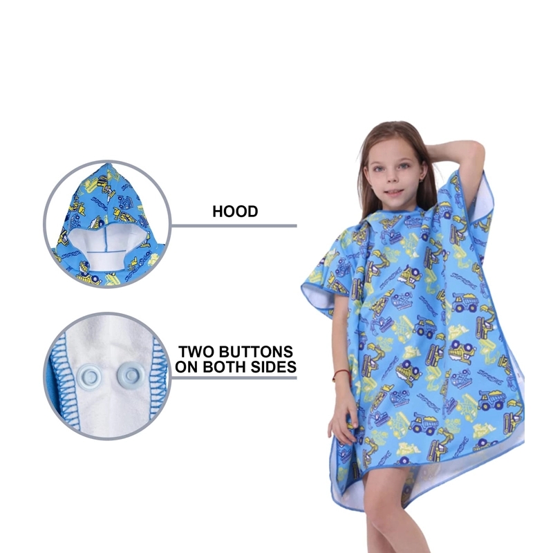 Children’s changing poncho towel is made of microfiber polyester, which has fast drying, soft, good water absorption and light weight feature.The length from shoulder to bottom is 80 cm (31.5 inches), width is 70cm(27.6in), and has buttons on both sides, which has plenty of room for kids to change clothes, suitable for the height of about 3.6-5.1ft(110-155cm) children. Adopt sublimation process, the logo color is bright and does not fade, welcome to customize logo.