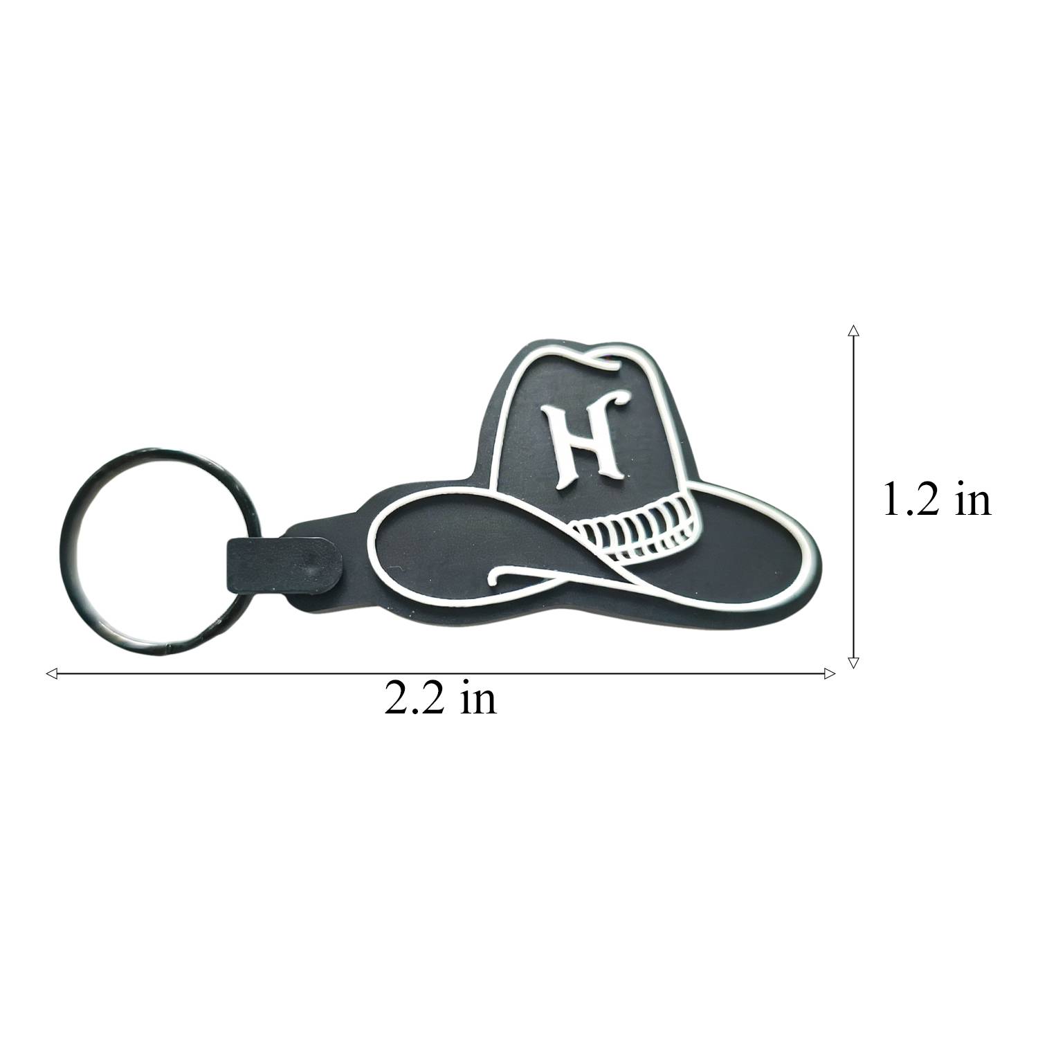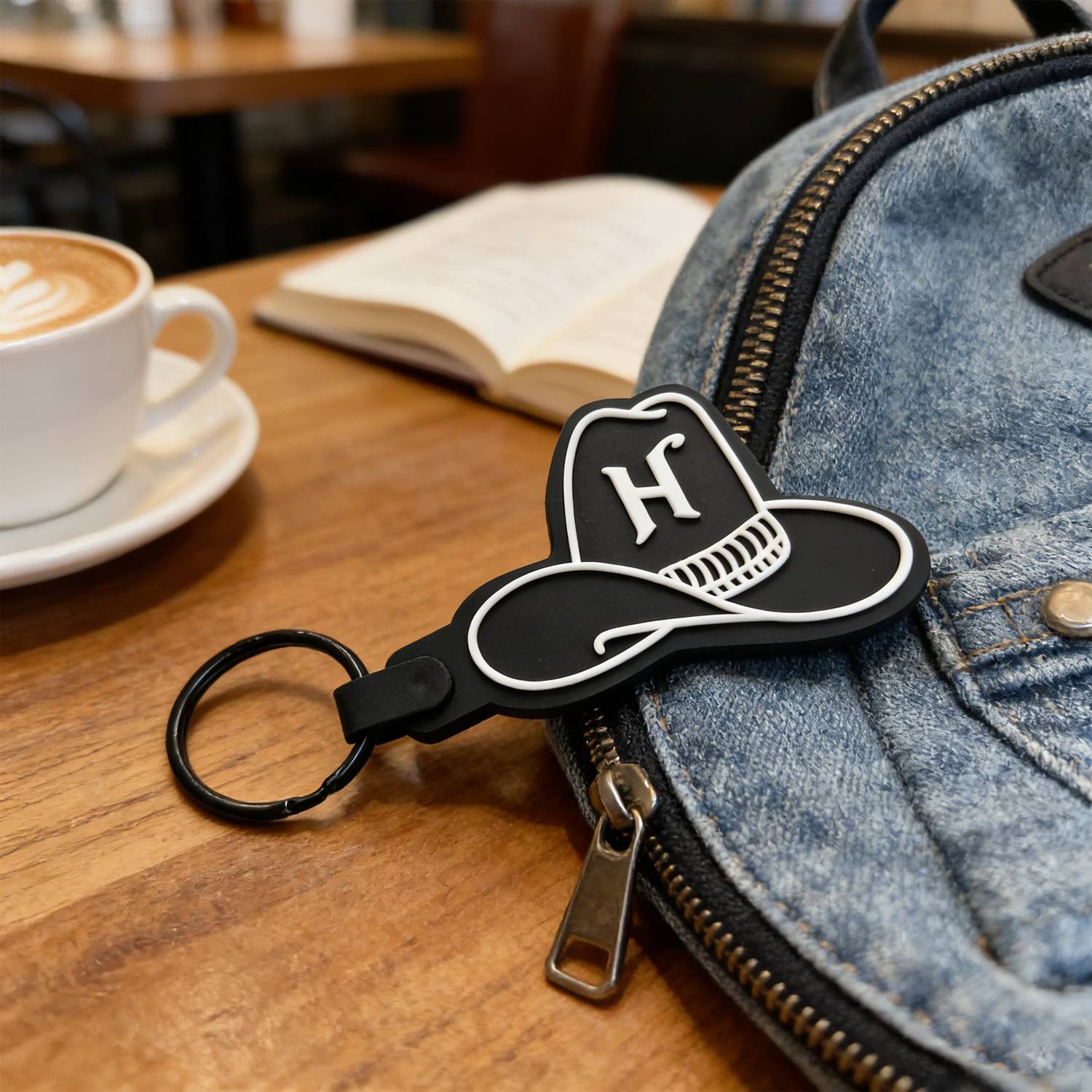 Flexible PVC soft rubber Western hat keychain, detailed cowboy design for keys, bags, or gifts. Durable and lightweight.