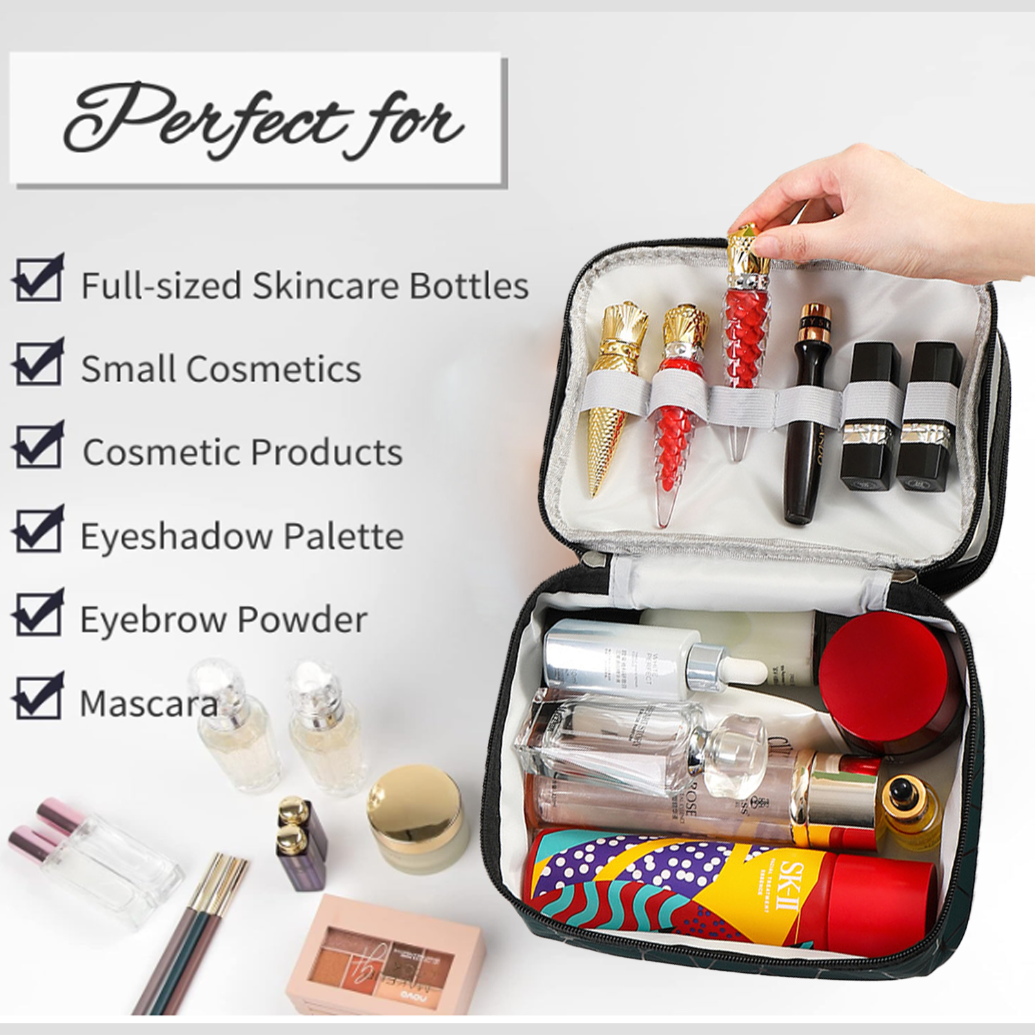 This 6.3×6.7×9.1″ makeup bag features a top handle for easy portability. Its PU leather fabric is soft, lightweight, waterproof, and durable. The bag has upper and lower compartments: a makeup partition for eye shadow and brushes, and an upper layer with two small pockets for lipstick, earrings, etc. Suitable for travel or daily use, it can be used as a cosmetic, wash, or toiletry bag. Elegant and practical, it’s a perfect gift for birthdays, Christmas, and other special occasions.