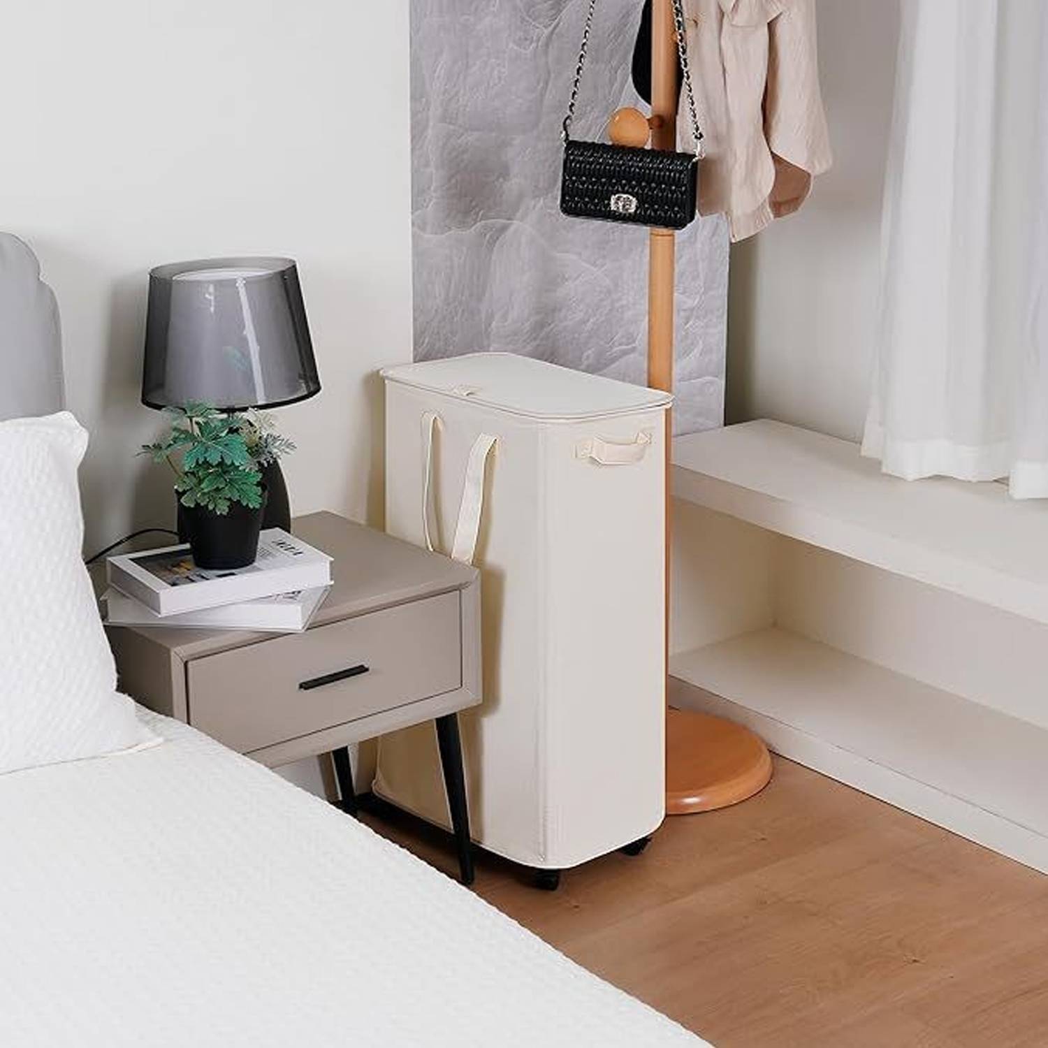 This foldable cloth basket with wheels features closure and fiber rods, perfect for easy transport and dust protection.