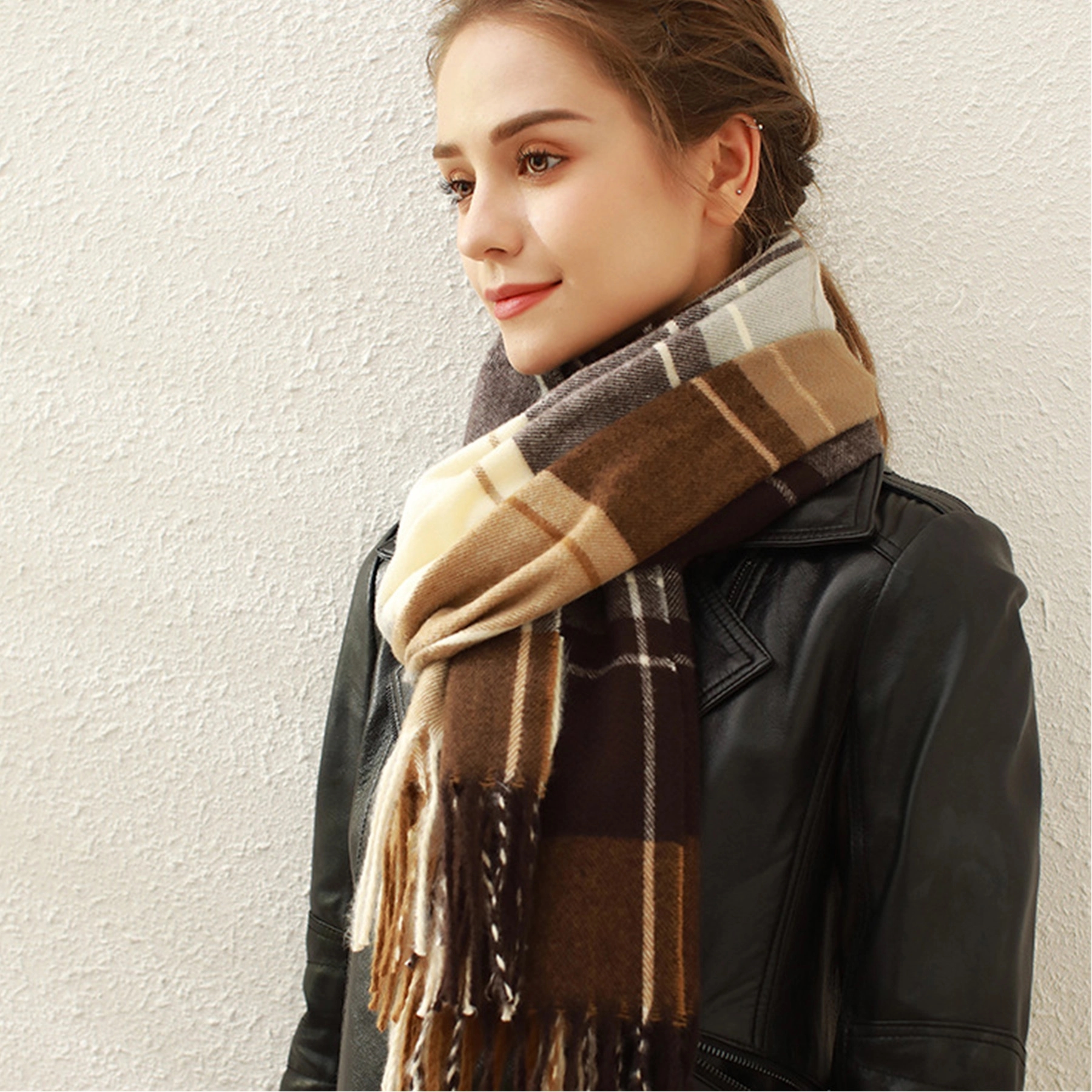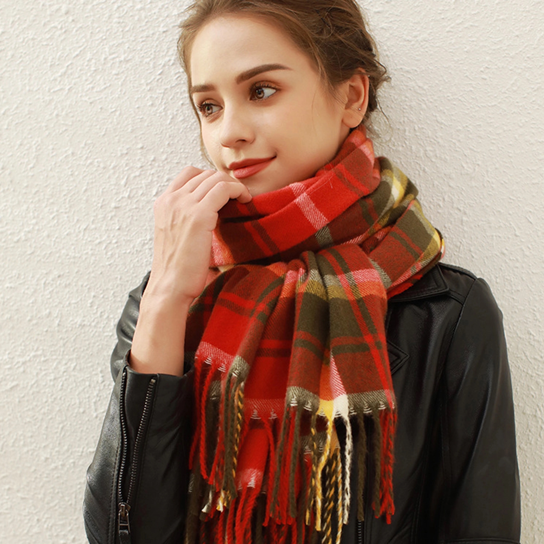 The fringed plaid scarf is made of polyester. Soft, comfortable and stylish. Widely suitable for women of all ages, beautiful and generous. Dimension:17″ x 71″