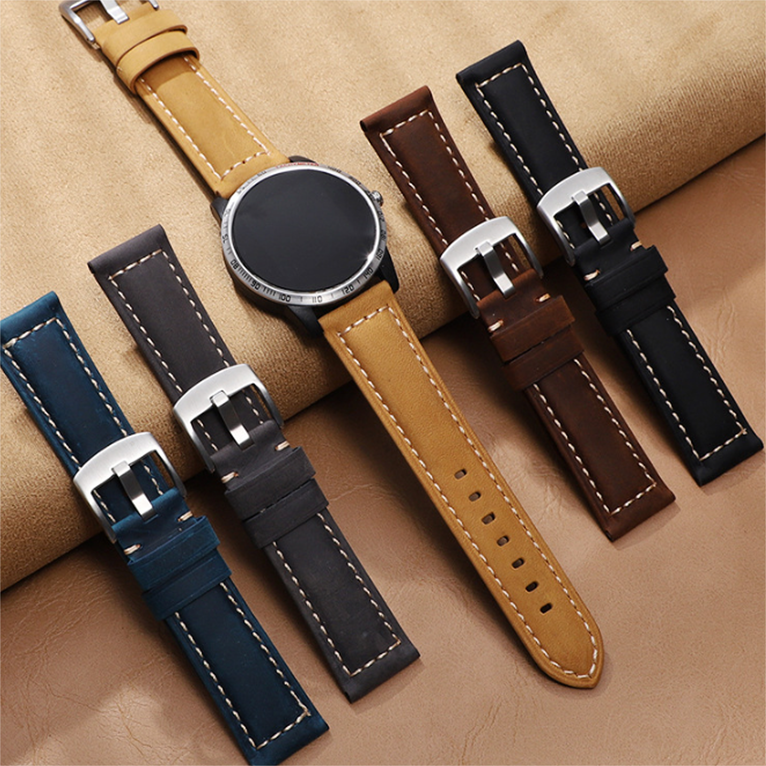 This smart watch band is made from genuine leather for lasting performance. The matte finish provides a subtle look that resists visible scratches. It is designed to be compatible with various popular smartwatch models. The band features a standard buckle closure for secure fastening on the wrist. Leather material offers flexibility and develops a unique patina over time. It is breathable for comfort during all day wear. The band is easy to install and remove for cleaning or switching styles.