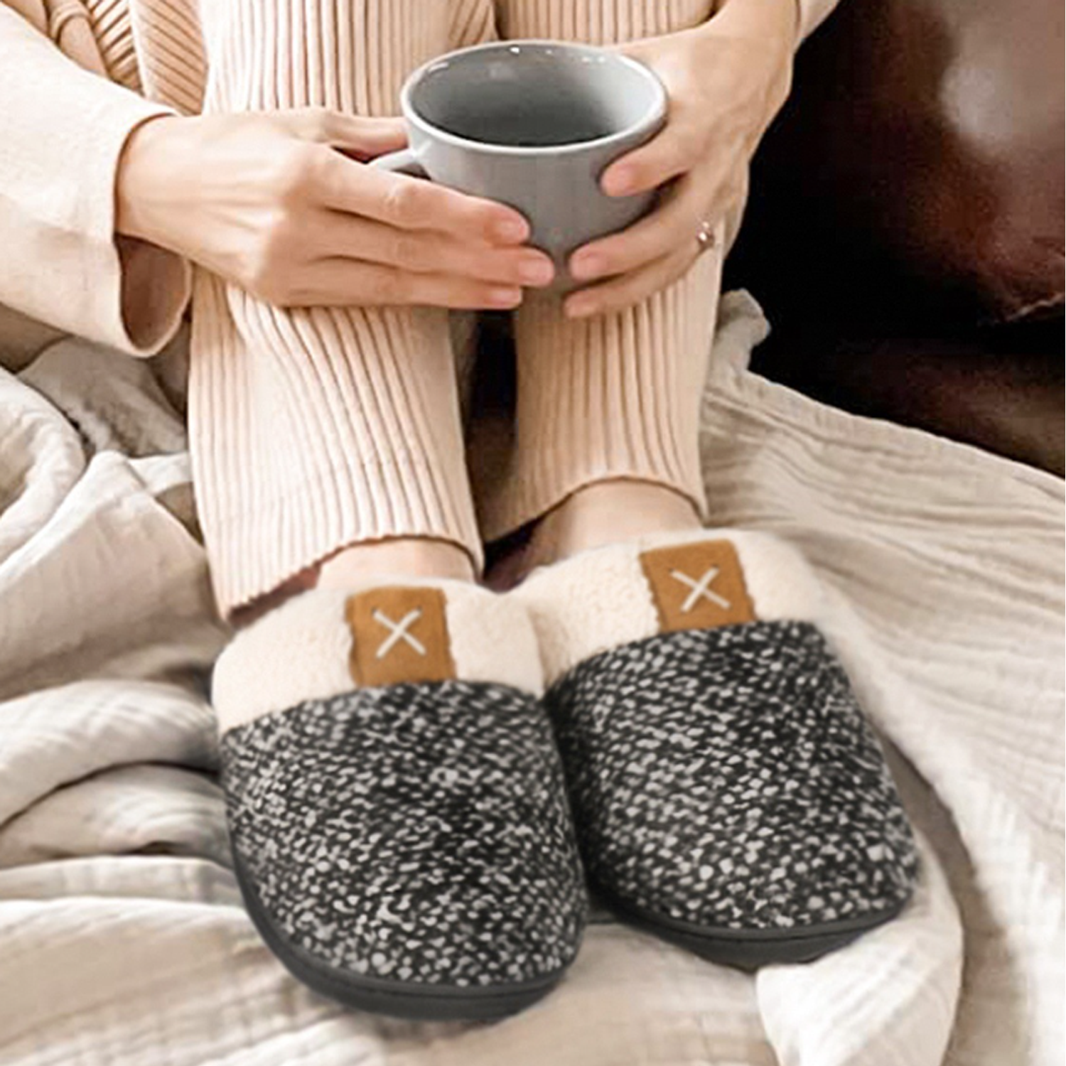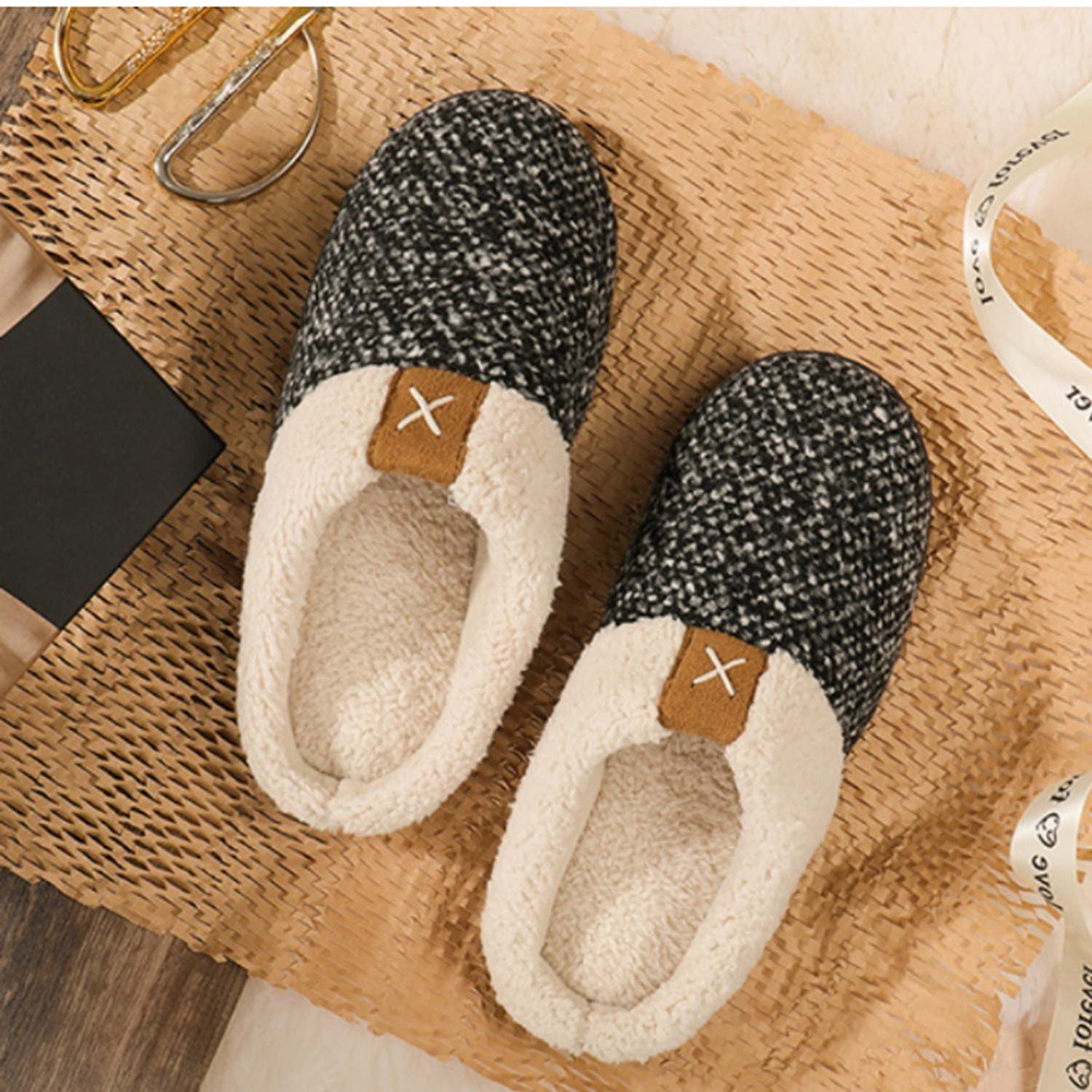 The luxurious slippers feature a thick, soft sole that offers superior grip and anti-skid protection. Its midsole, crafted from high-density foam, ensures heel stability and optimal cushioning. A cozy flannel lining guarantees warmth and comfort. The breathable fabric upper, paired with a waffle design, ensures feet remain dry and odor-free. The slippers’ edge is crafted with a unique seam process, ensuring durability and machine washability.
