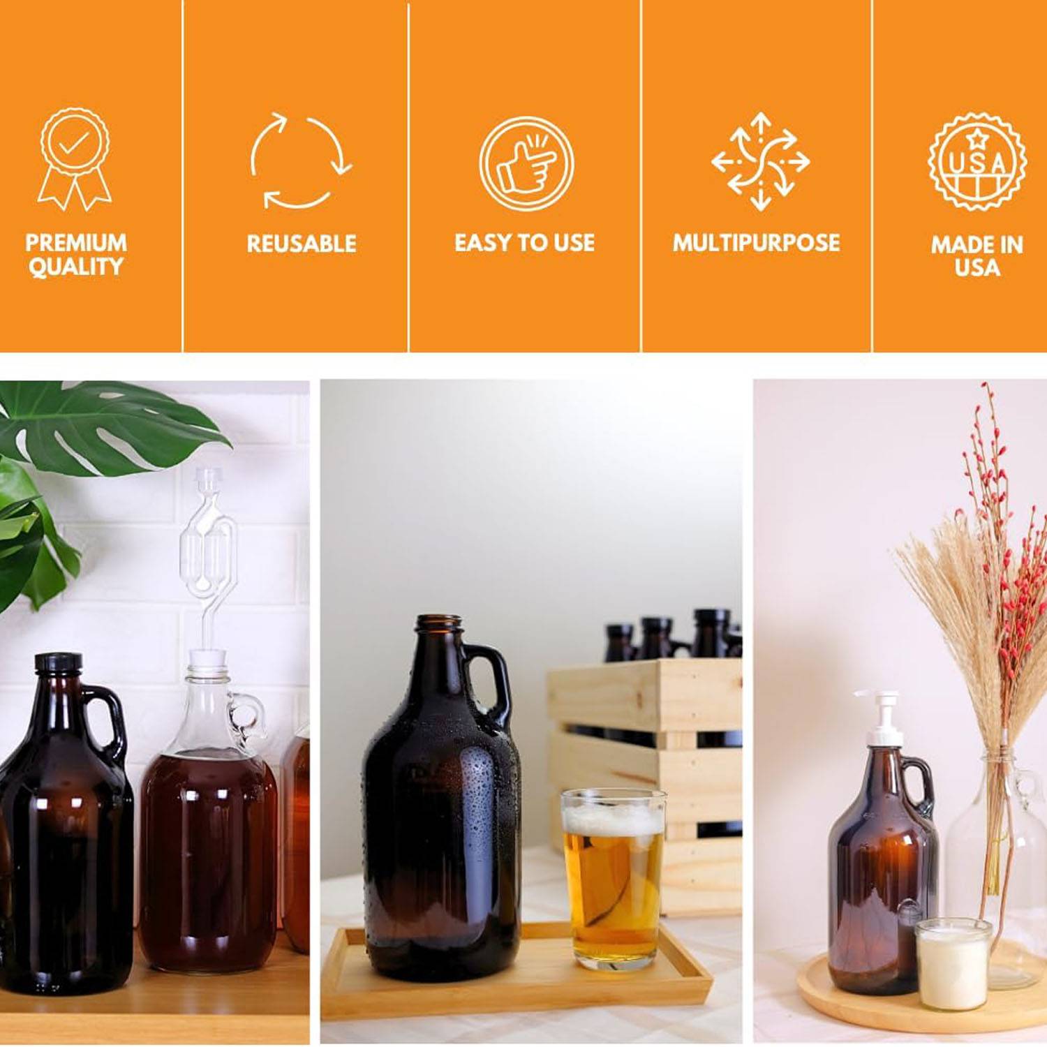 This item is a half-gallon (64 oz, 1.89 liter) container. It is a perfect home brew bottle that can be used as a beer growler, wine growler, kombucha growler, or even as a half-gallon cider jug or distilled water jug. Made from new, high-quality materials, these are unused, empty large glass growlers, not plastic ones. You can expect durability and consistent quality over a long period of usage with our beer growlers. We guarantee you’ll have a great experience. You can customize your logo.