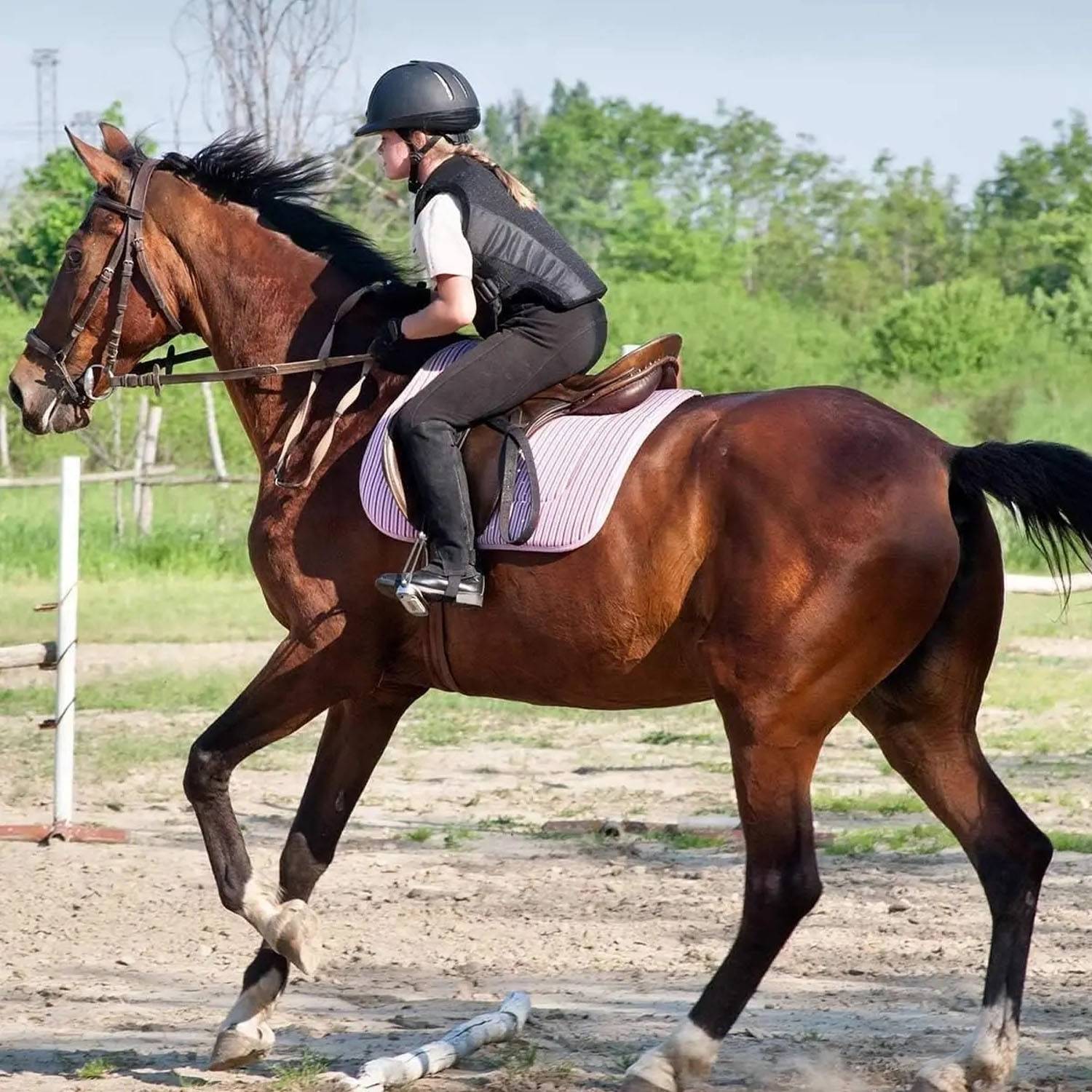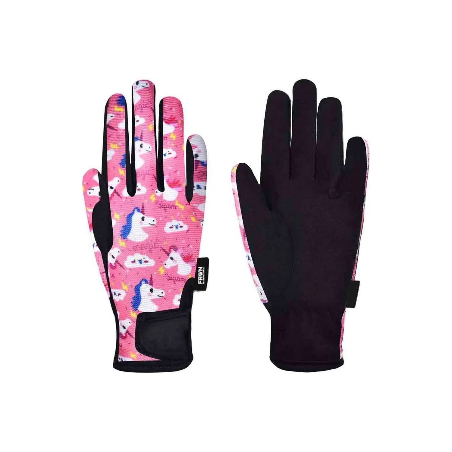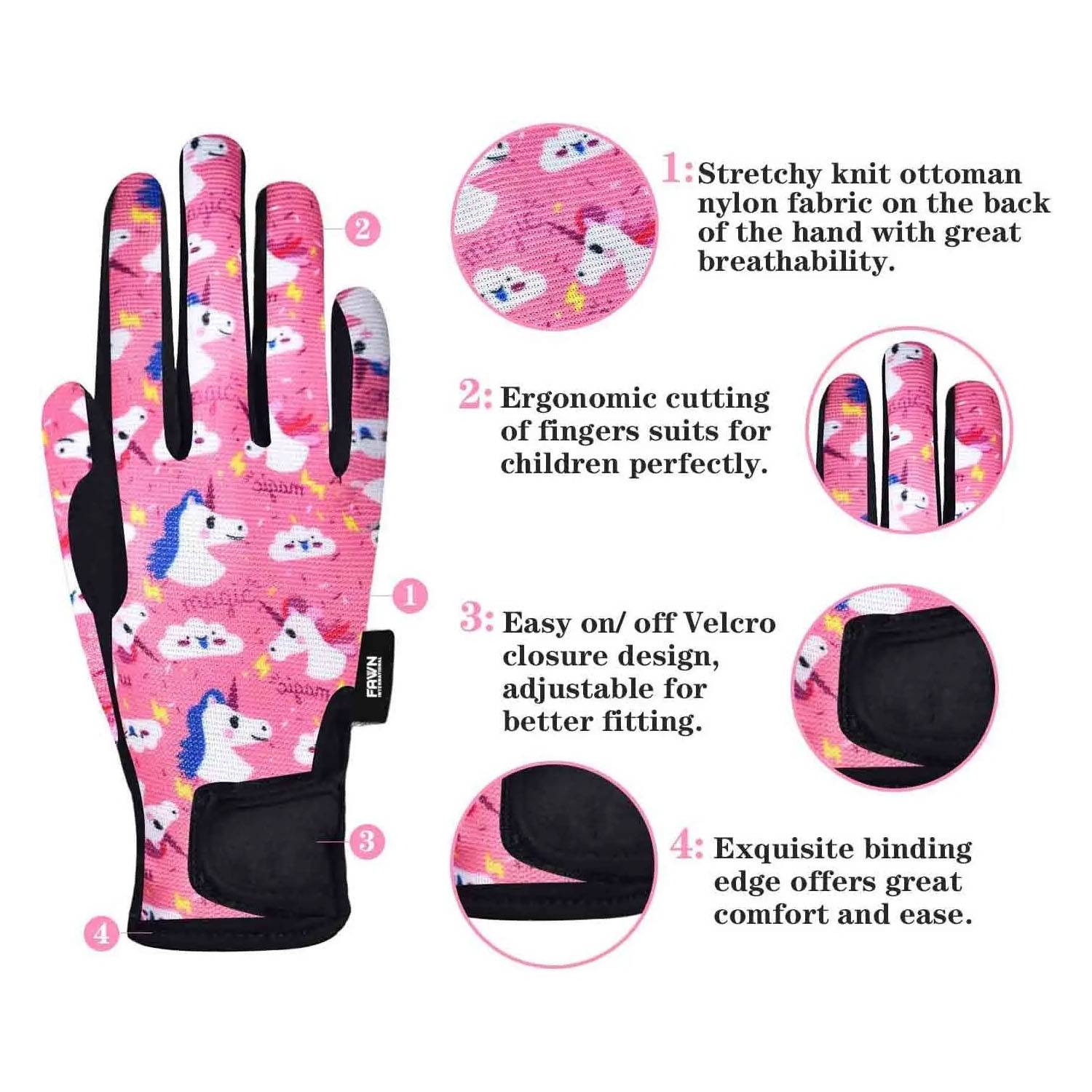 These kids’ riding gloves feature microfiber material for cold weather protection. The gloves come in cute patterns and a variety of colors, and are reinforced at the index finger and thumb for a secure grip. Adjustable hook-and-loop straps and an elastic wrist strap ensure an easy fit. The breathable, stretchy fabric allows for freedom of movement, making them suitable for all seasons and outdoor activities such as horseback riding, cycling, and gardening.