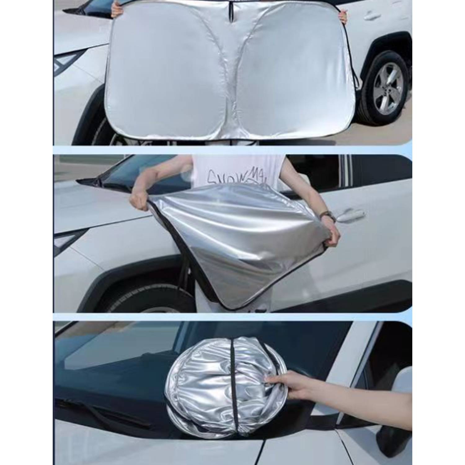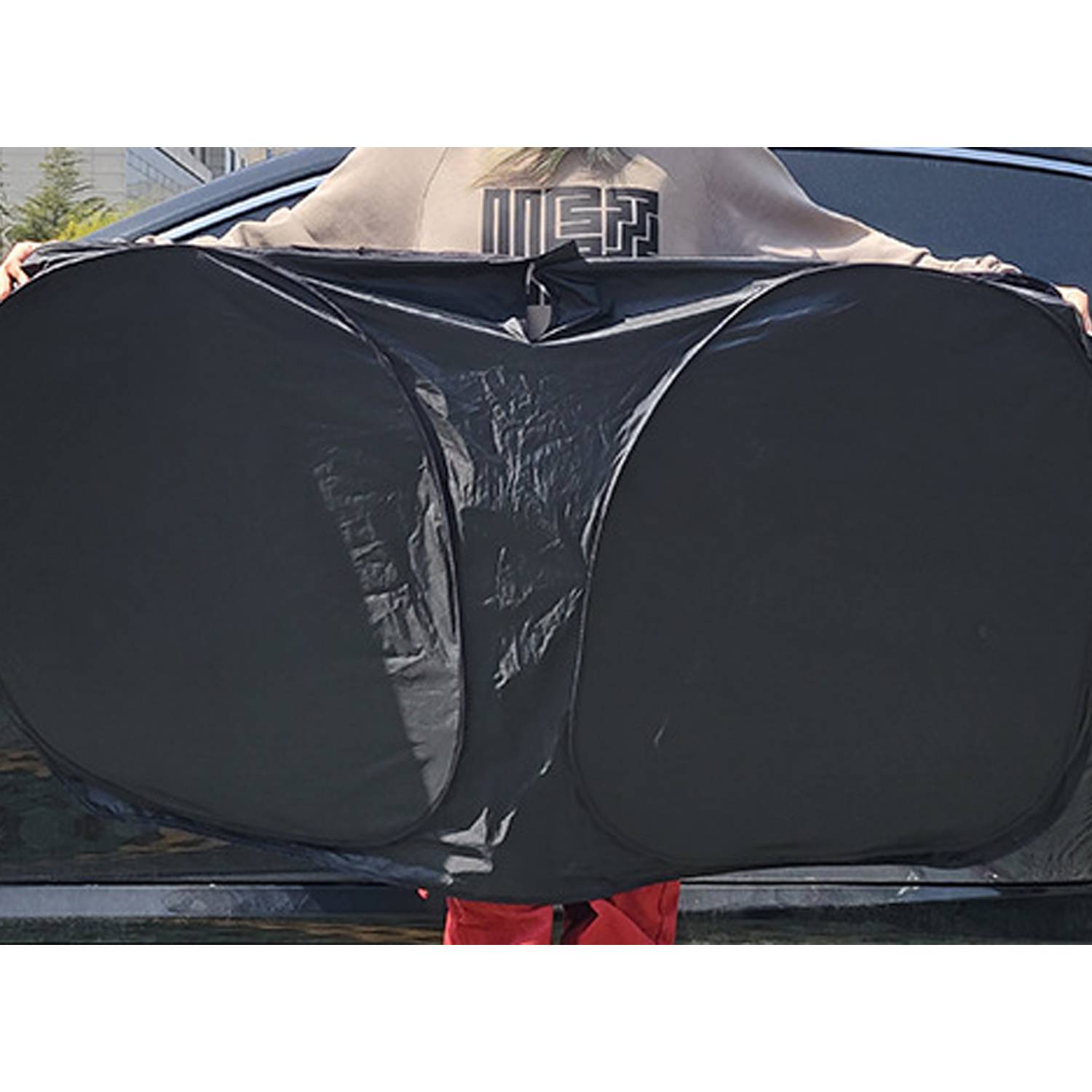 This is an automotive sunshade screen specifically designed to provide superior sun protection and heat insulation for your vehicle’s windshield. The shape of this sunshade resembles an inverted V, allowing it to fit most standard car windshields perfectly. The slightly raised edges help ensure that the shade sits securely in place and covers the entire windshield, providing maximum protection from harmful UV rays and reducing the interior temperature of your vehicle.