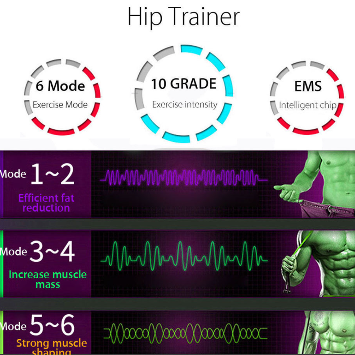 With the latest EMS Tech, simply place the pads on your body to send signals directly to muscles, promoting movement. This hip trainer tones and tightens hips and buttocks for body shaping. While you relax or watch TV, EMS Trainer works to improve your buttocks and thighs, relieving muscle pain through rhythmic contractions. EMS’s micro current safely strengthens muscle fibers without harming the body.