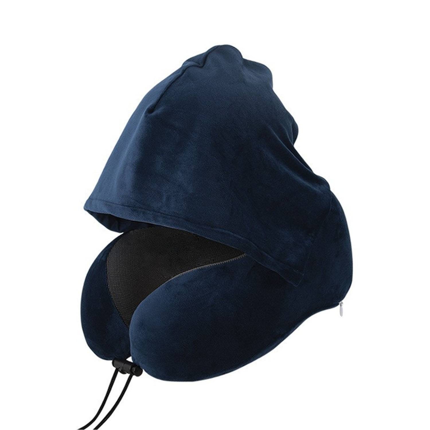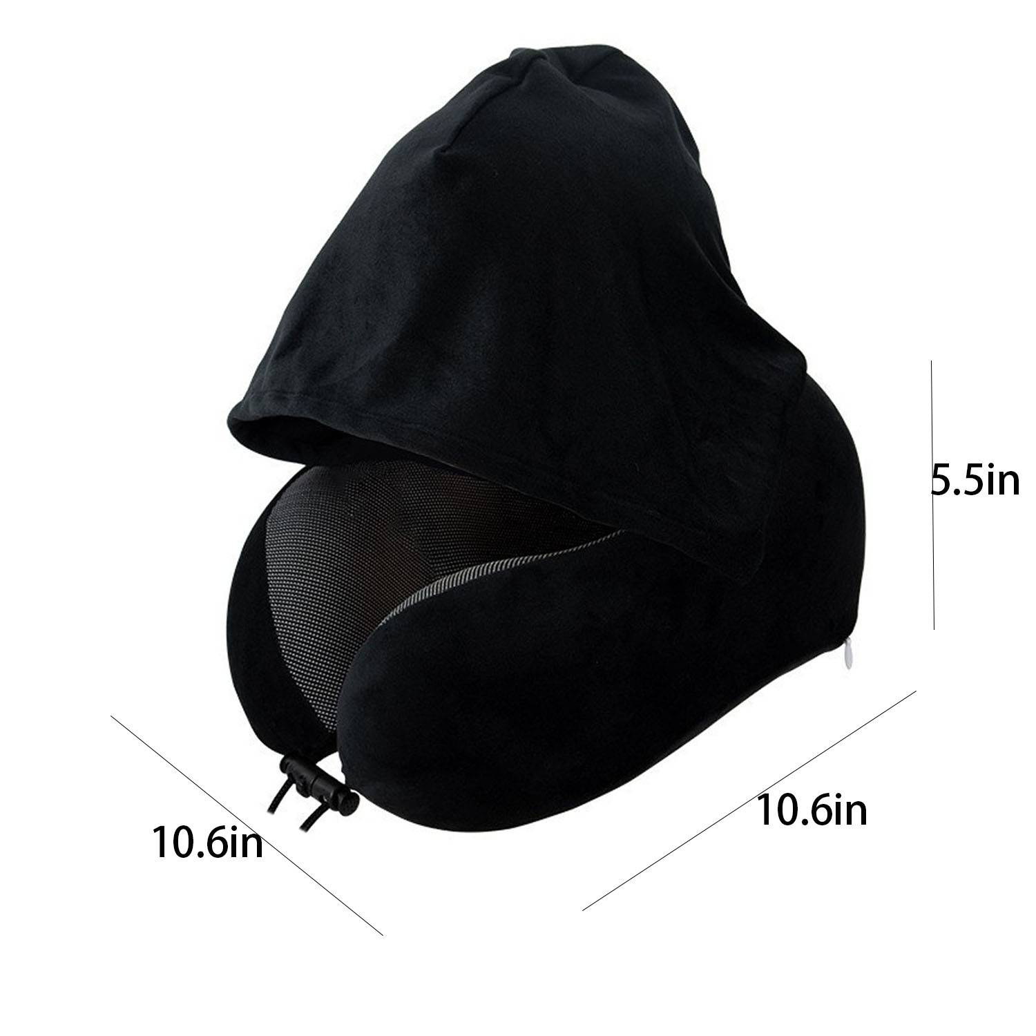 This hooded U-shaped memory foam neck pillow with ergonomic design relieves pressure, blocks light, hypoallergenic, lightweight.