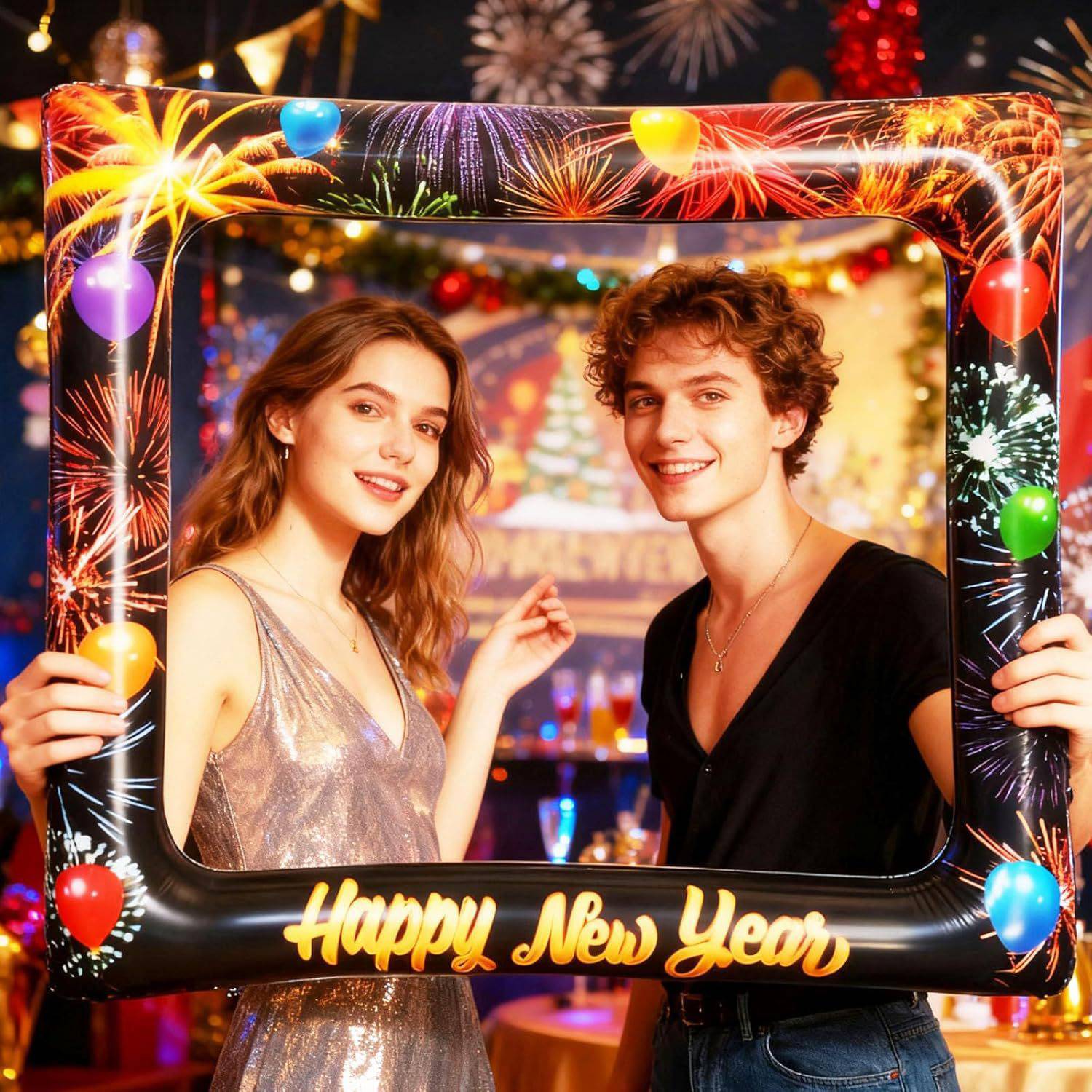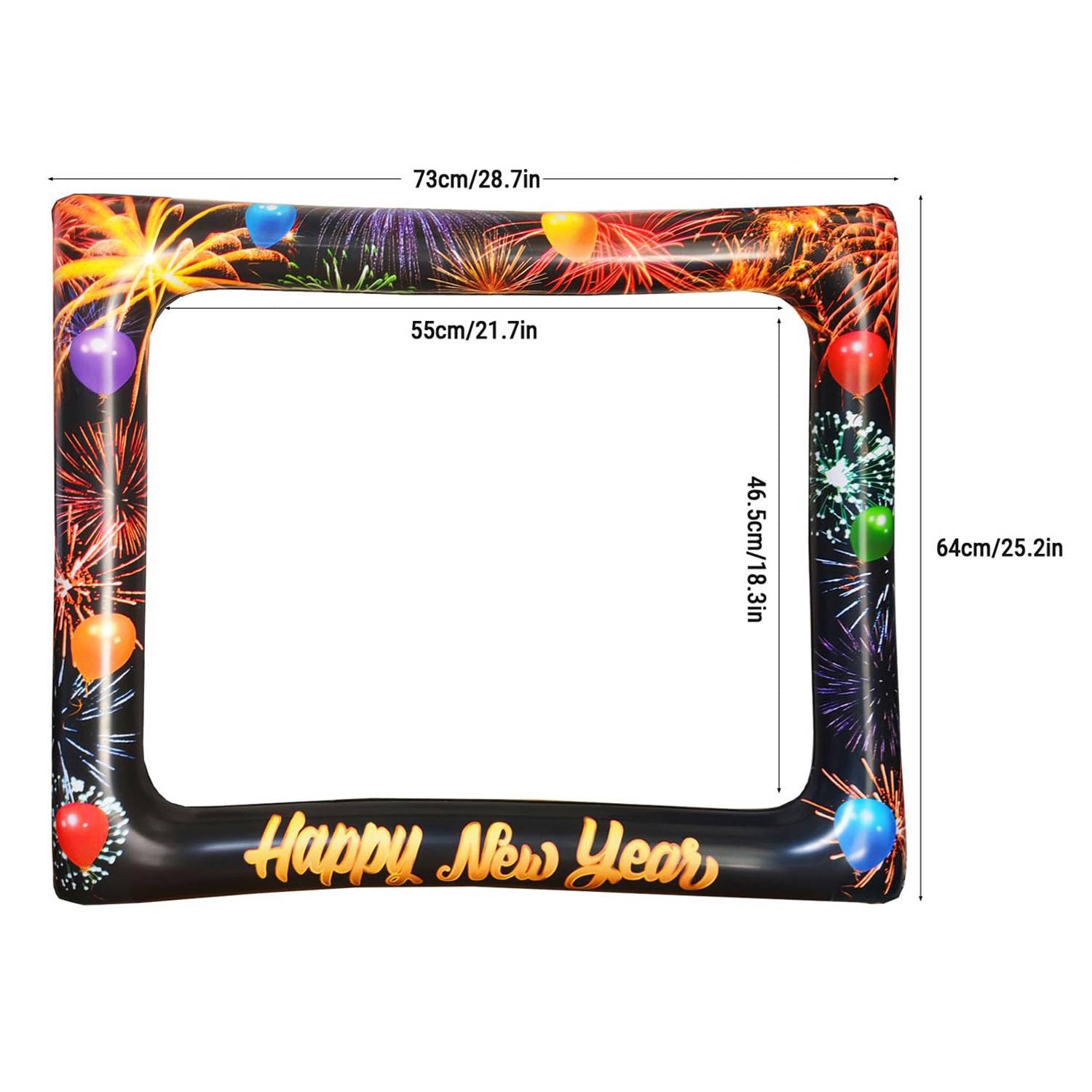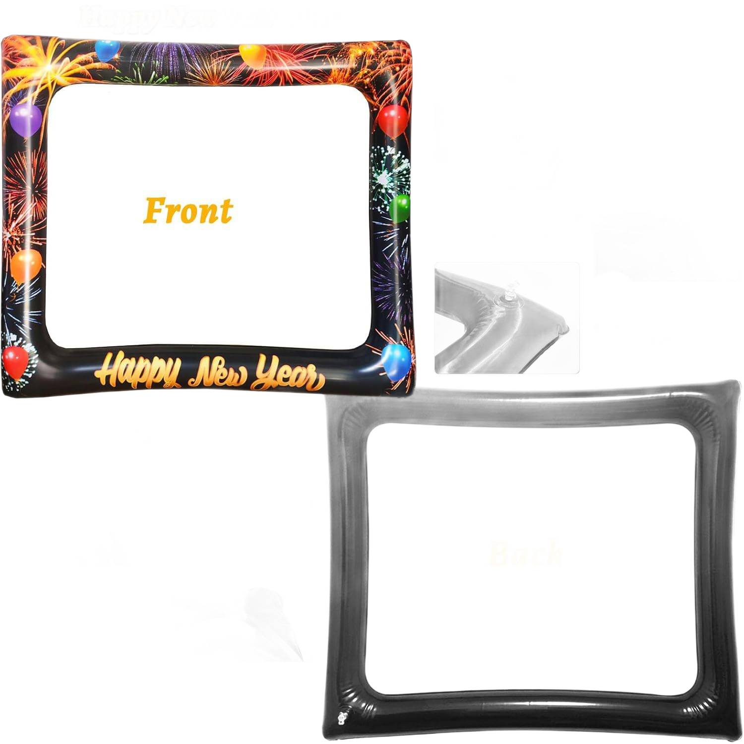 This inflatable New Year photo frame is made of premium PVC, providing durability, waterproofing, and safety for children. Featuring colorful fireworks and “Happy New Year” text, it adds festive charm to any photo. Lightweight and easy to inflate or deflate, it offers a three-dimensional, reusable design. Perfect for selfies or group photos at parties, family gatherings, weddings, school events, and holiday celebrations, creating fun and memorable moments.