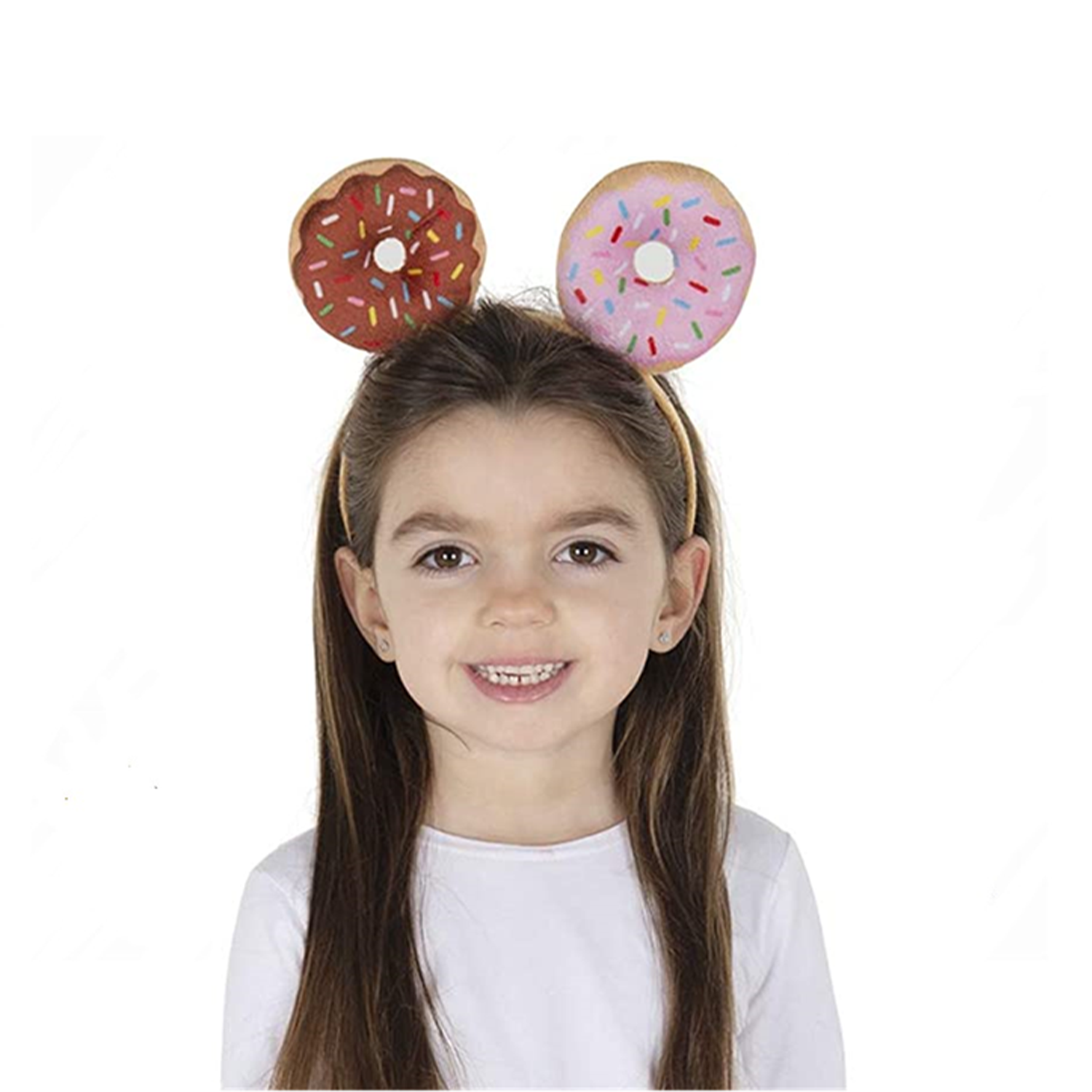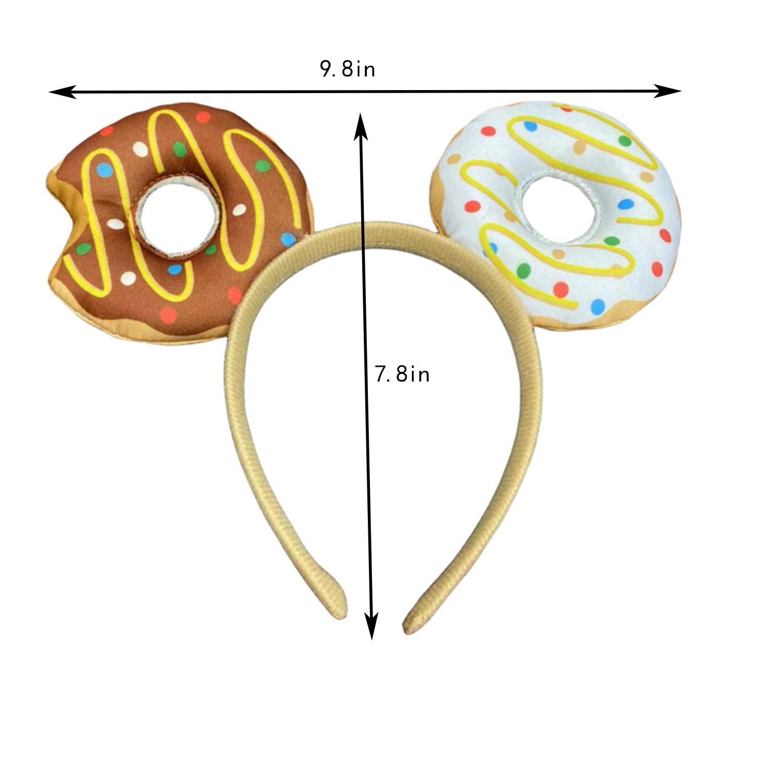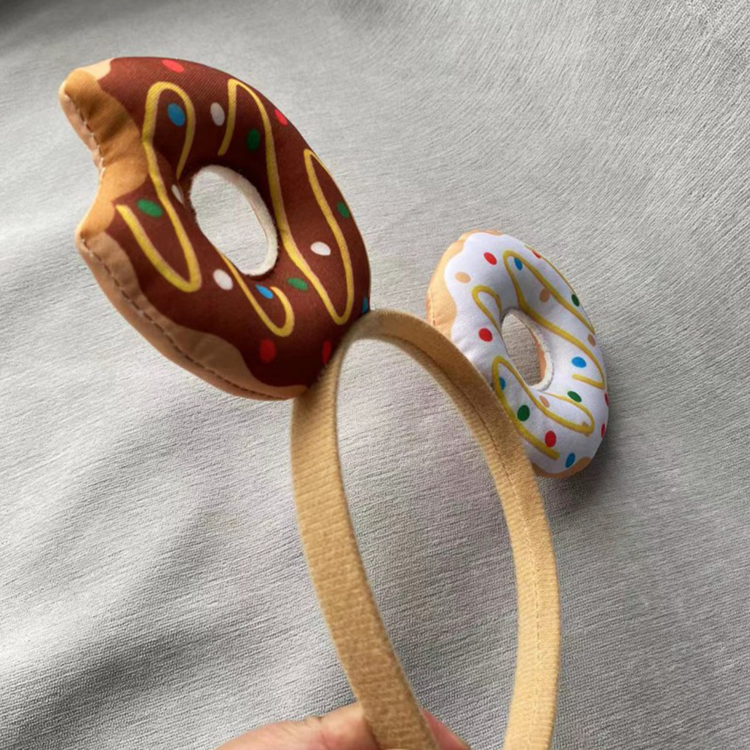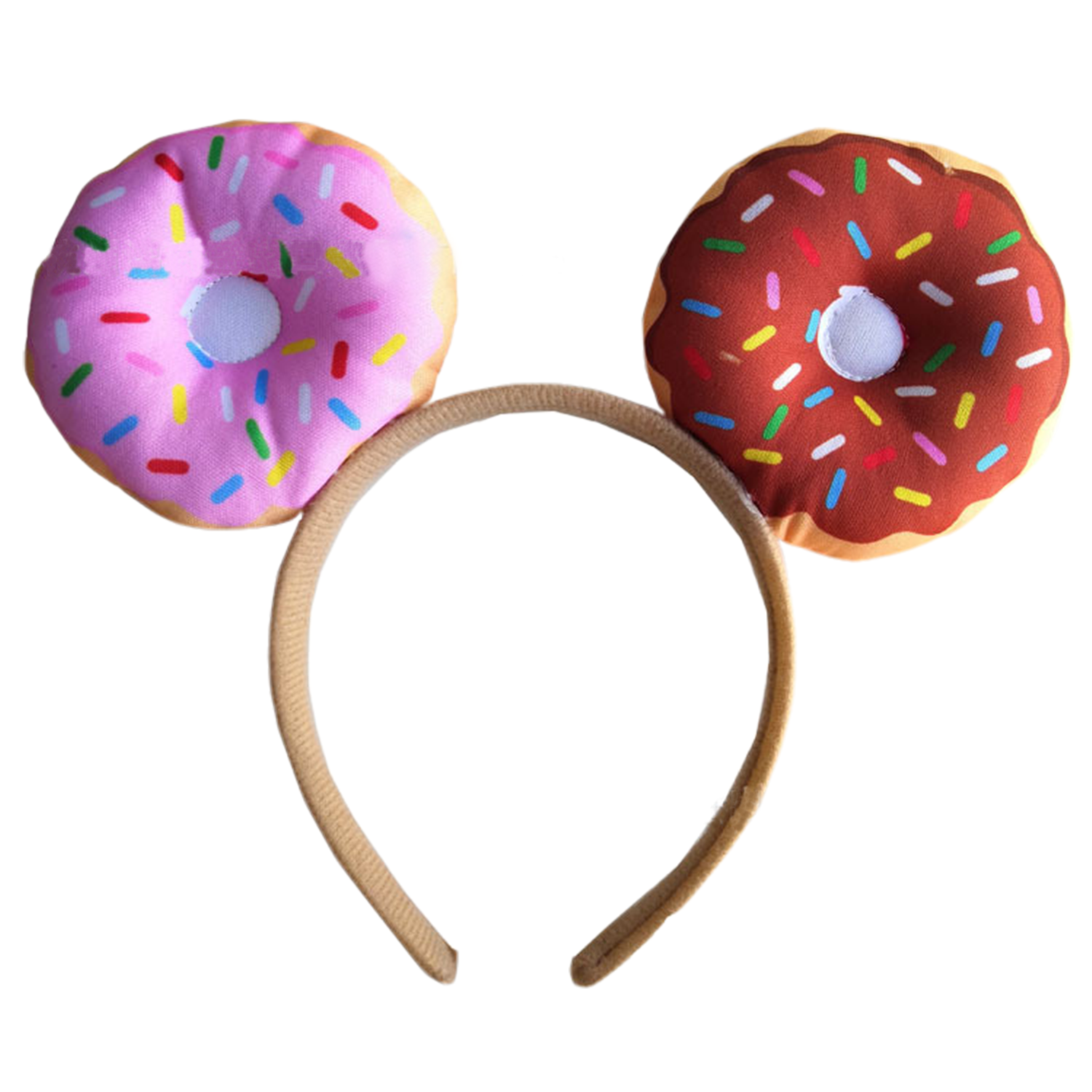 Fabric donut headband w/ sprinkles. Stretch fit secure wear. Party costume accessory for events.