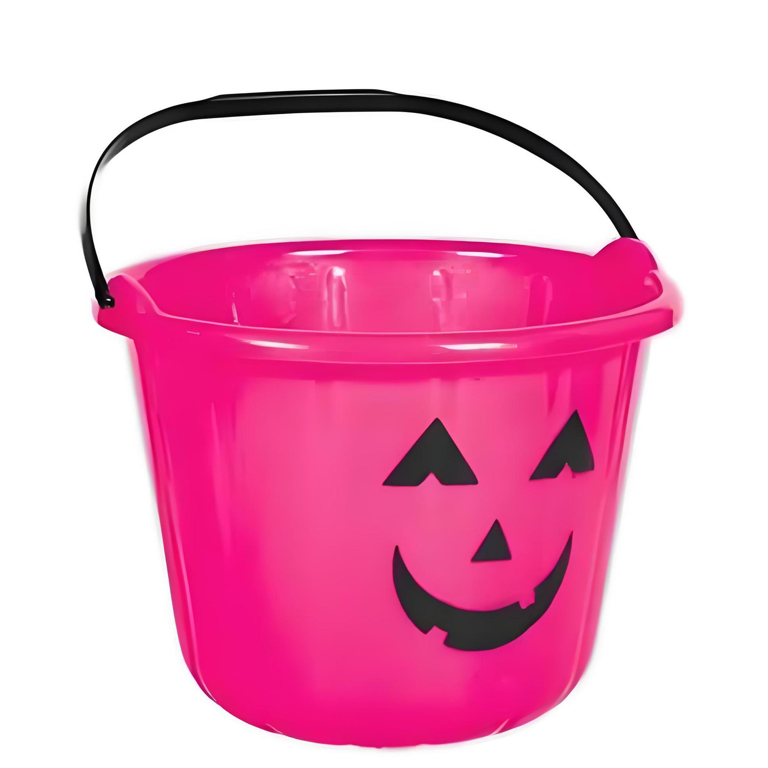 Classic pumpkin-shaped plastic bucket for Halloween candy collection and festive decoration. Lightweight with sturdy handle.