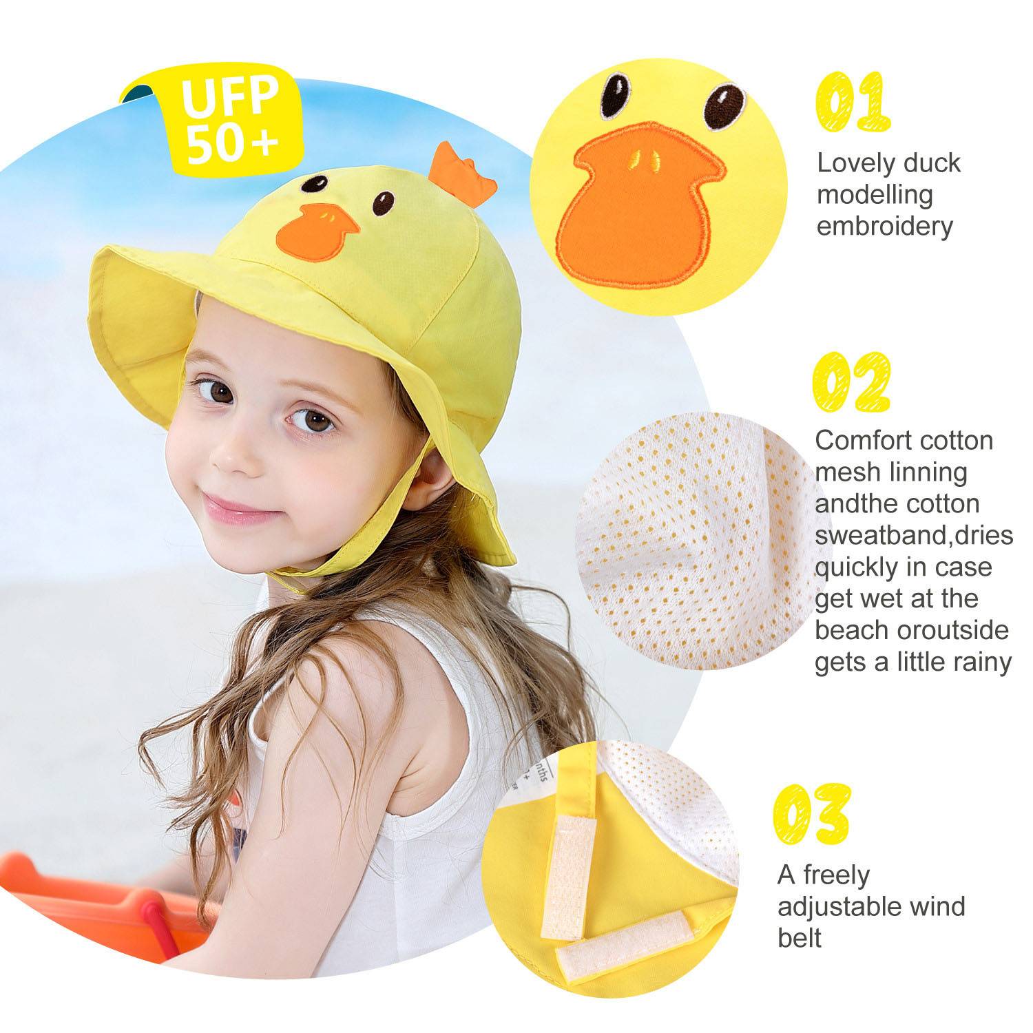 Lightweight kids’ hat with UPF 50+, breathable mesh, adjustable strap, and fun themes. Ideal for sunny days.