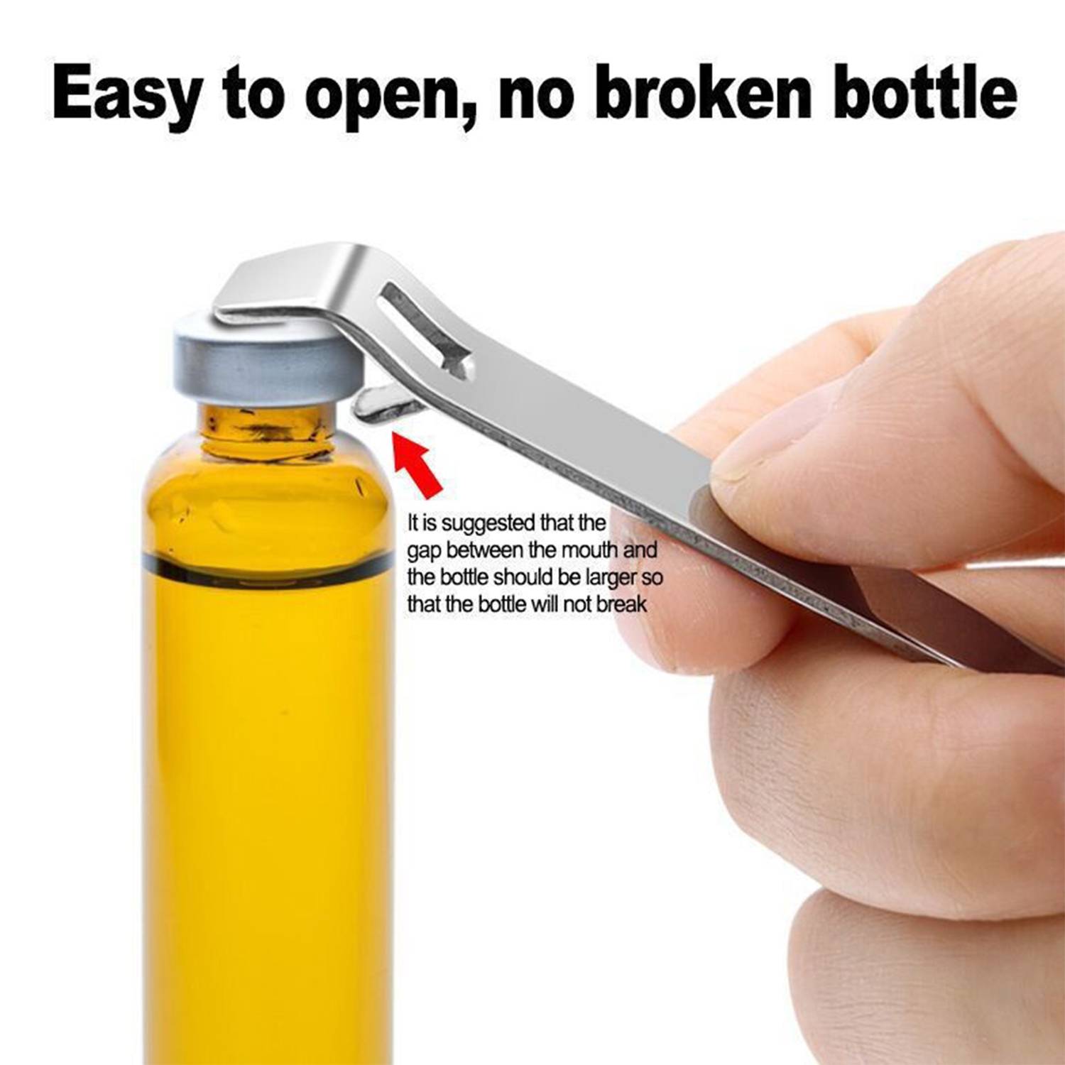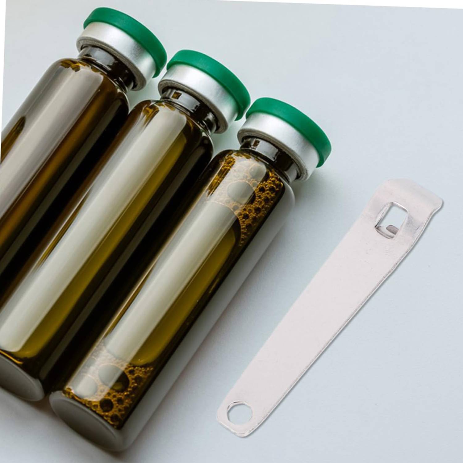 Stainless steel manual vial opener, portable, durable, secure grip, ideal for lab, pharmacy, home, or travel use.