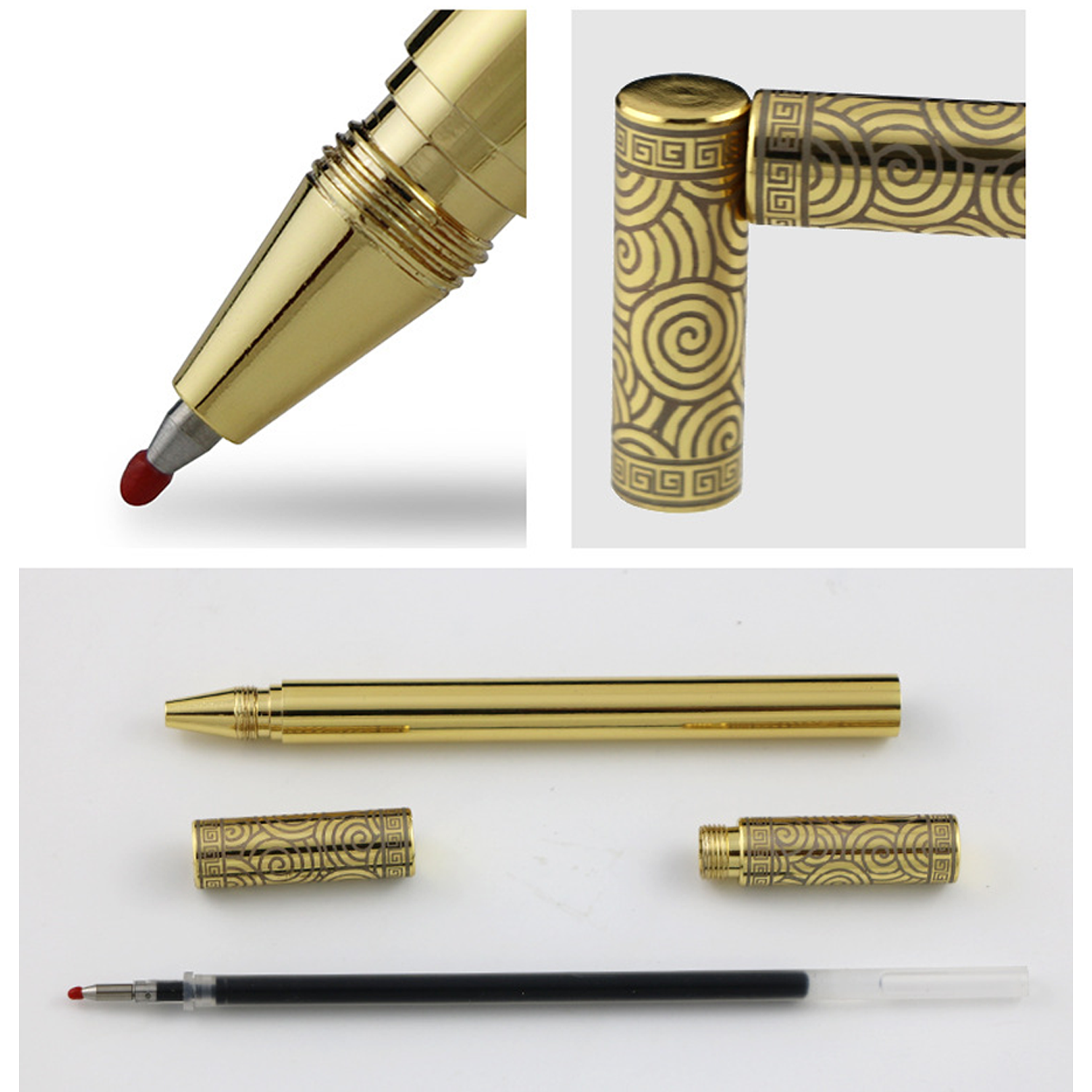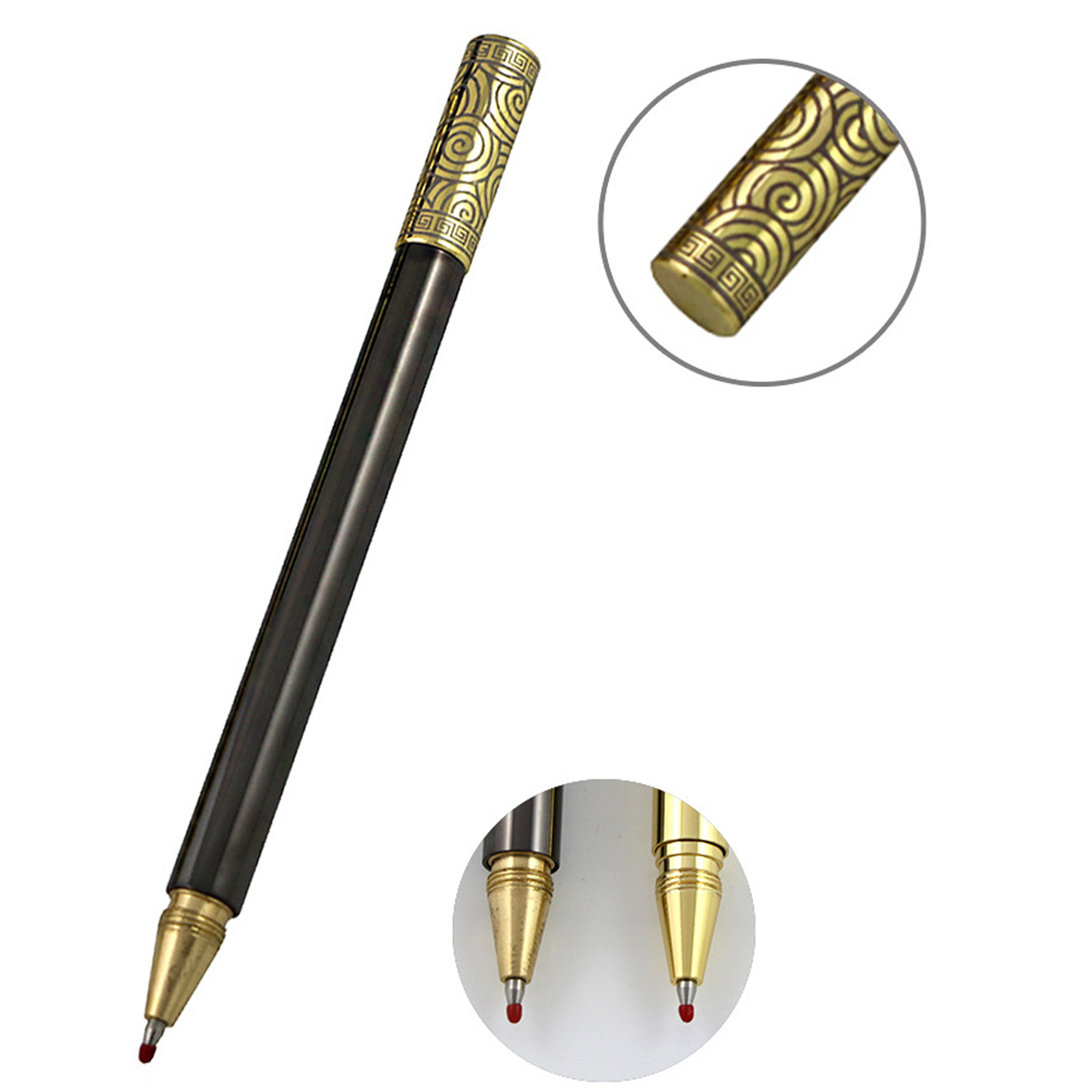 This elegant golden cudgel style brass pen (5.7″) combines artistry with functionality. The yellow metal barrel features intricate silver cloud patterns at both ends, with black or yellow finish options. Its 0.02″ fine-point black refill ensures precise writing, while the magnetic tip allows easy attachment to metal surfaces. Blending traditional Chinese motifs with modern utility, it’s perfect for professional use or as a collector’s piece.