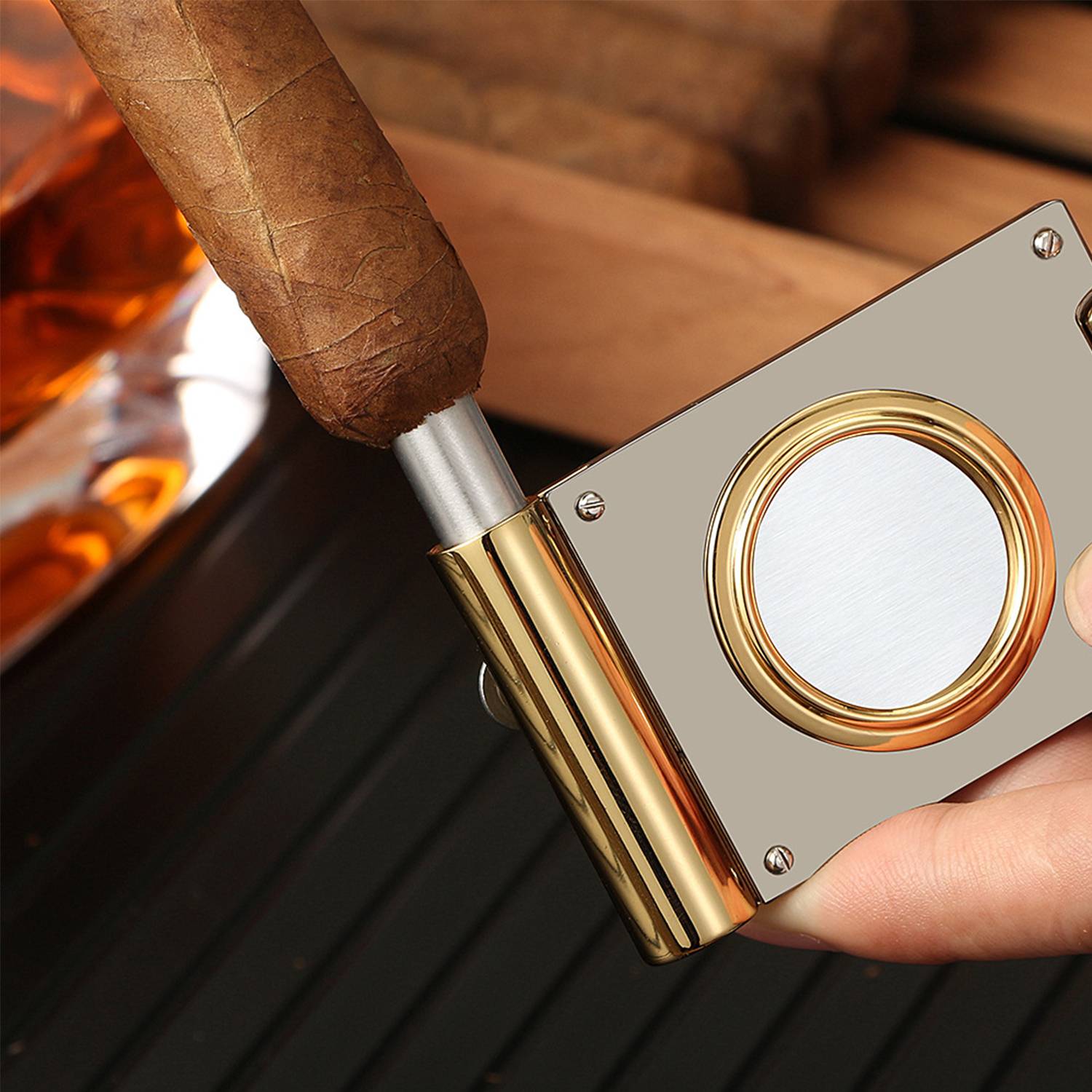 Our cigar cutter made of alloy and stainless steel, sturdy and durable, Comfortable to the Touch.Lightweight material, easy to carry. 0.9in (23mm) Hole Diameter for cigar cutting.Suitable for all sizes up to 60 ring gauges.Equipped with dual guillotine blades, it will give you the sharpest cut.Perfect and easy to cut cigars. High quality and classic design for cigar cutter.You can take it with you without worrying about it going out of style.