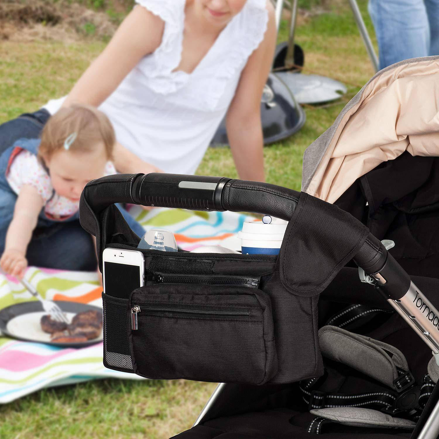 You can carry this stroller caddy attachment bag around as a shoulder bag or tote bag when you go out. When you attach the stroller organizer bag to the stroller, you can take it off and put it in your pocket.