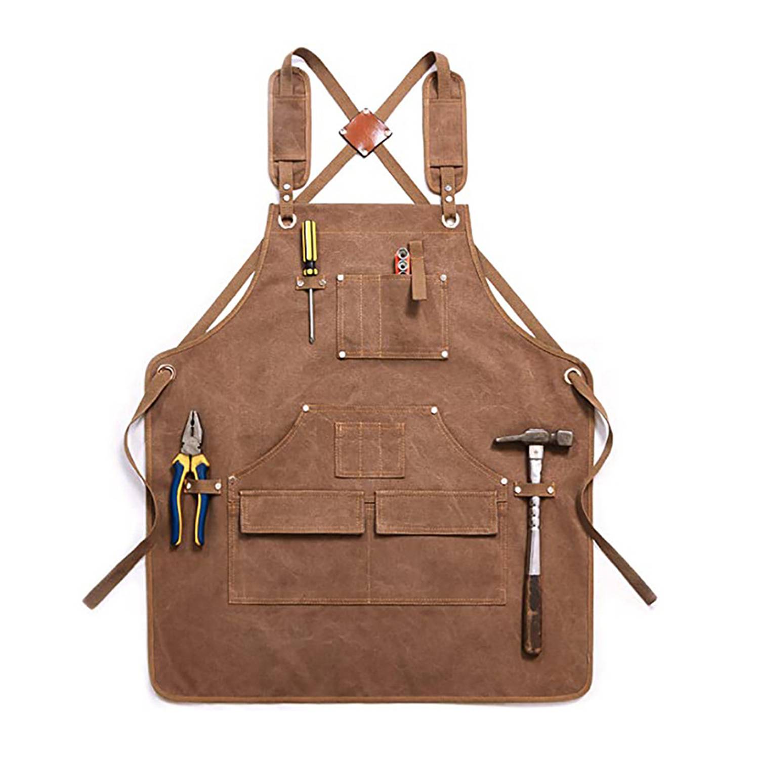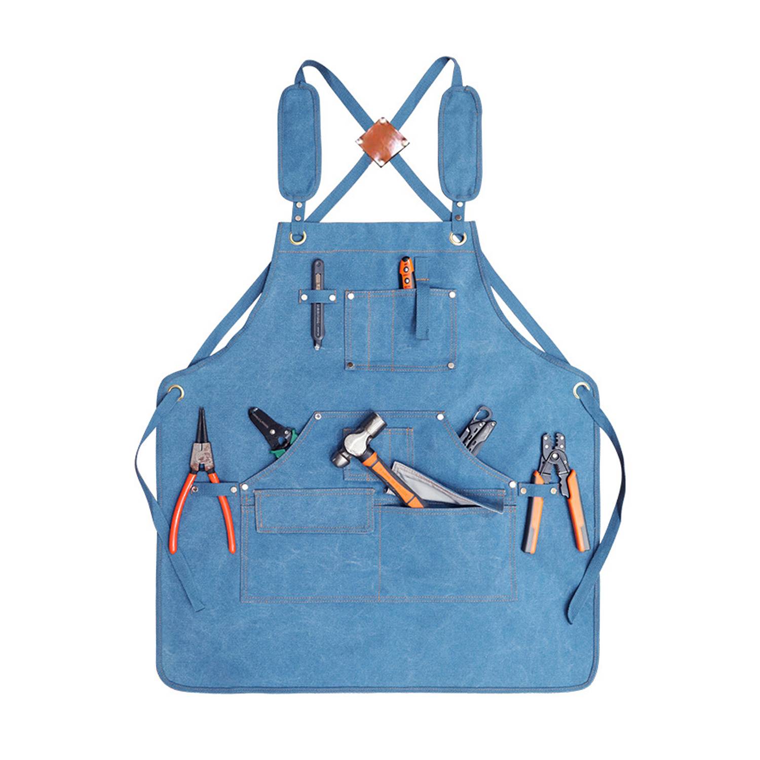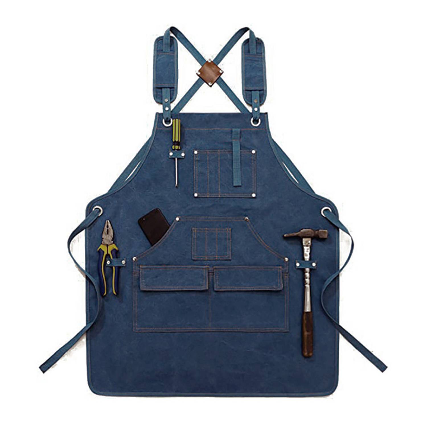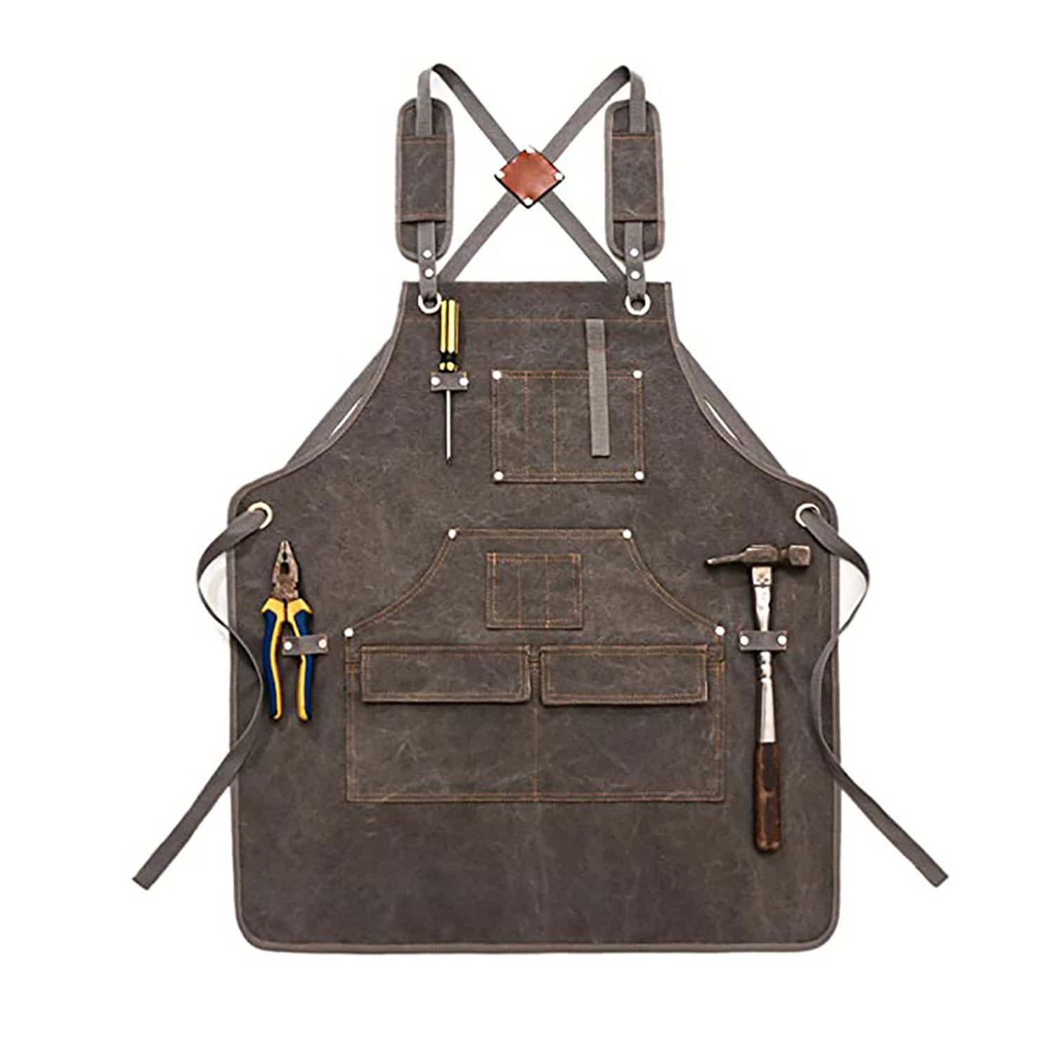 Durable canvas apron with multiple pockets, cross-back straps, and comfort fit, ideal for woodworking, grilling, or crafting.