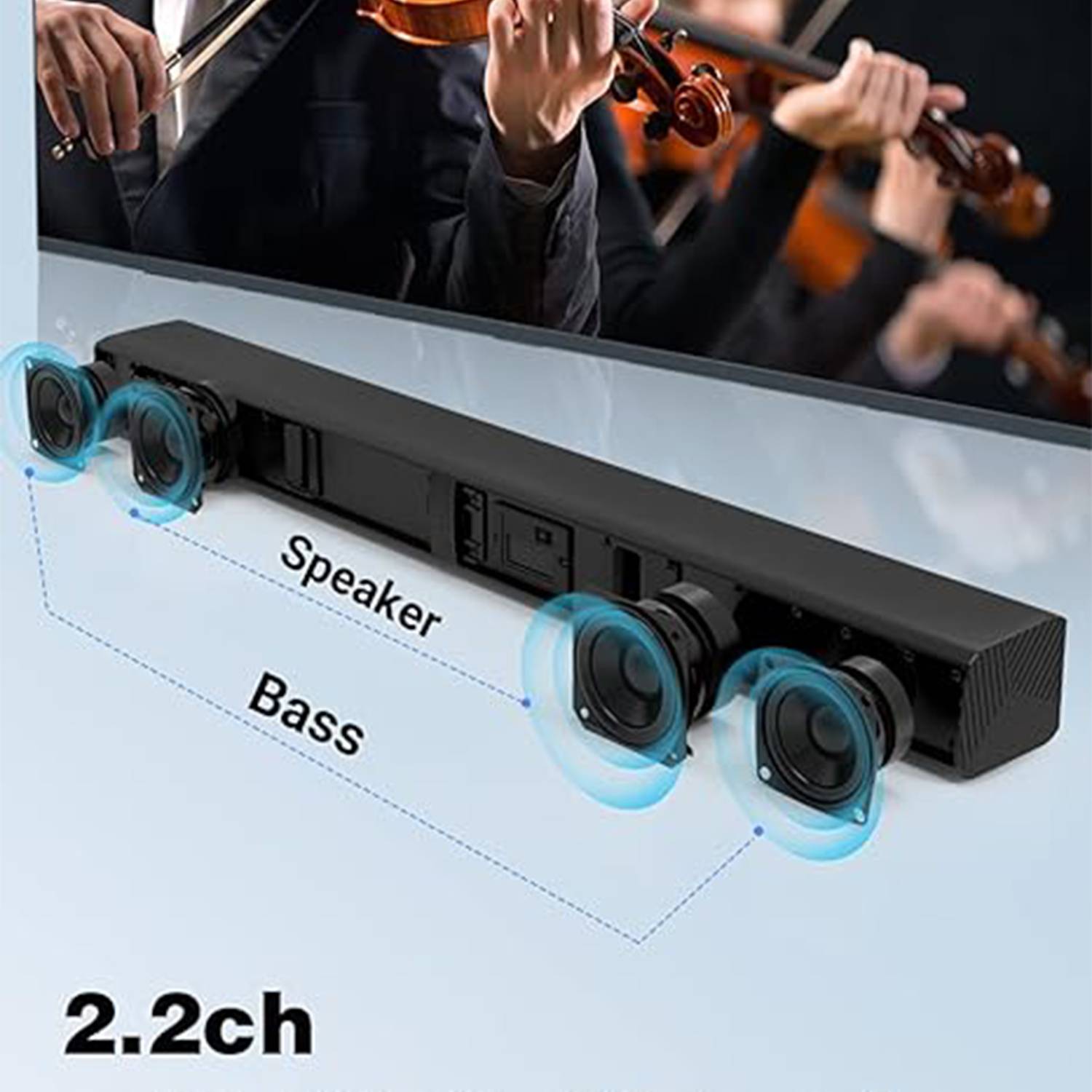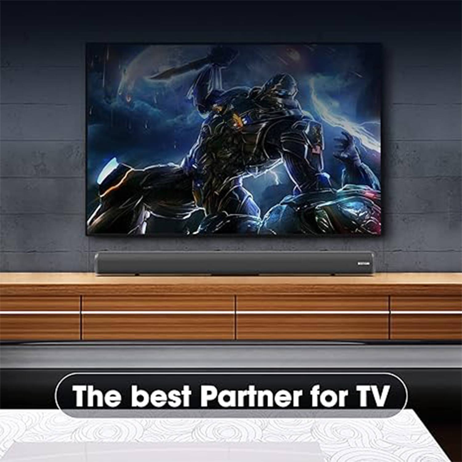 The TV soundbar is made of matte black, so that the whole tv speaker simple but high-end, using a large area of curved net cover mask, improve sound quality overall.The sound bar makes TV a pleasure with great sounding as well as great appearance, which looks aesthetically beautiful and so slim that never blocks the TV screen! You can control the sound bar with Remote laying in the coach or directly with buttons on it. The LED indicator shows the current mode you choose.