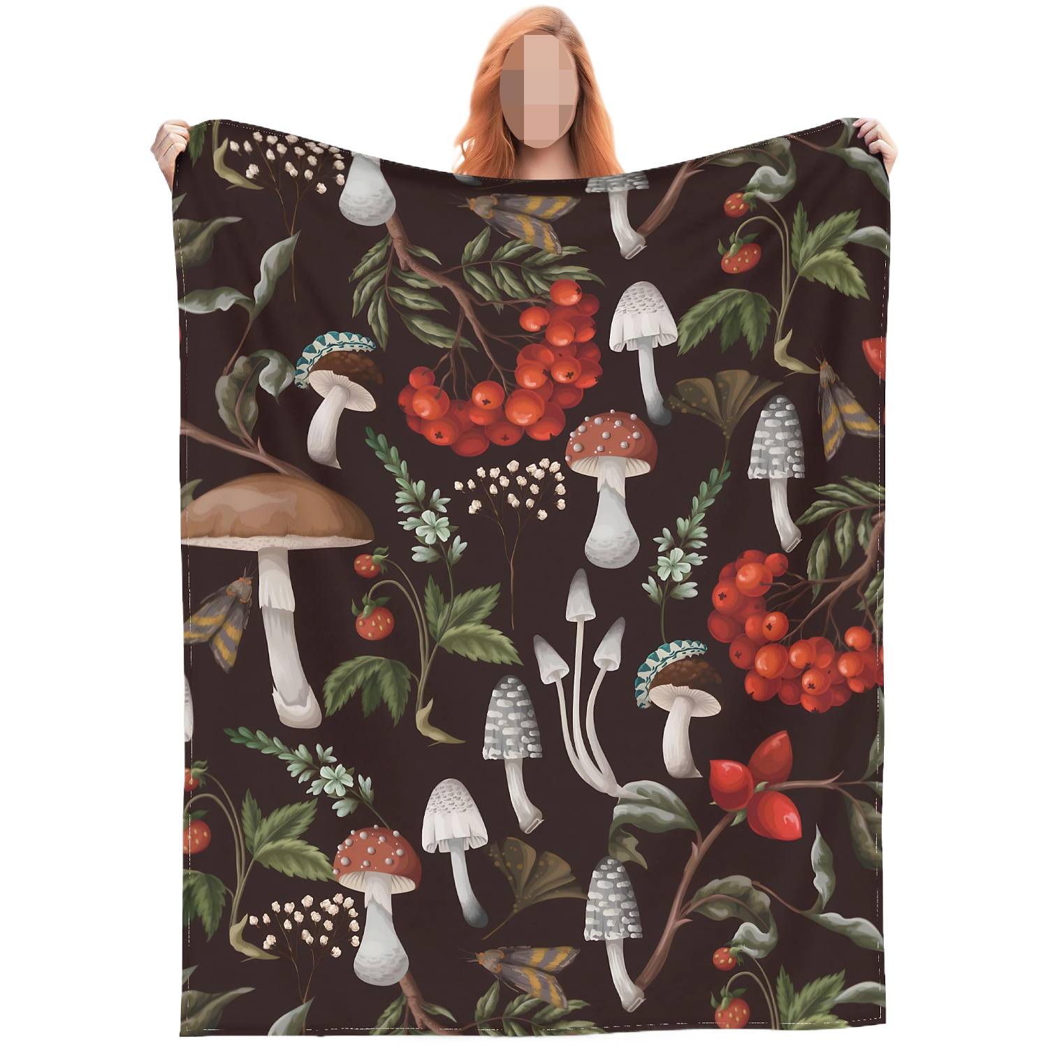 Mushroom print fleece blanket, soft and versatile for couch, bed, and travel use, providing cozy comfort for all.