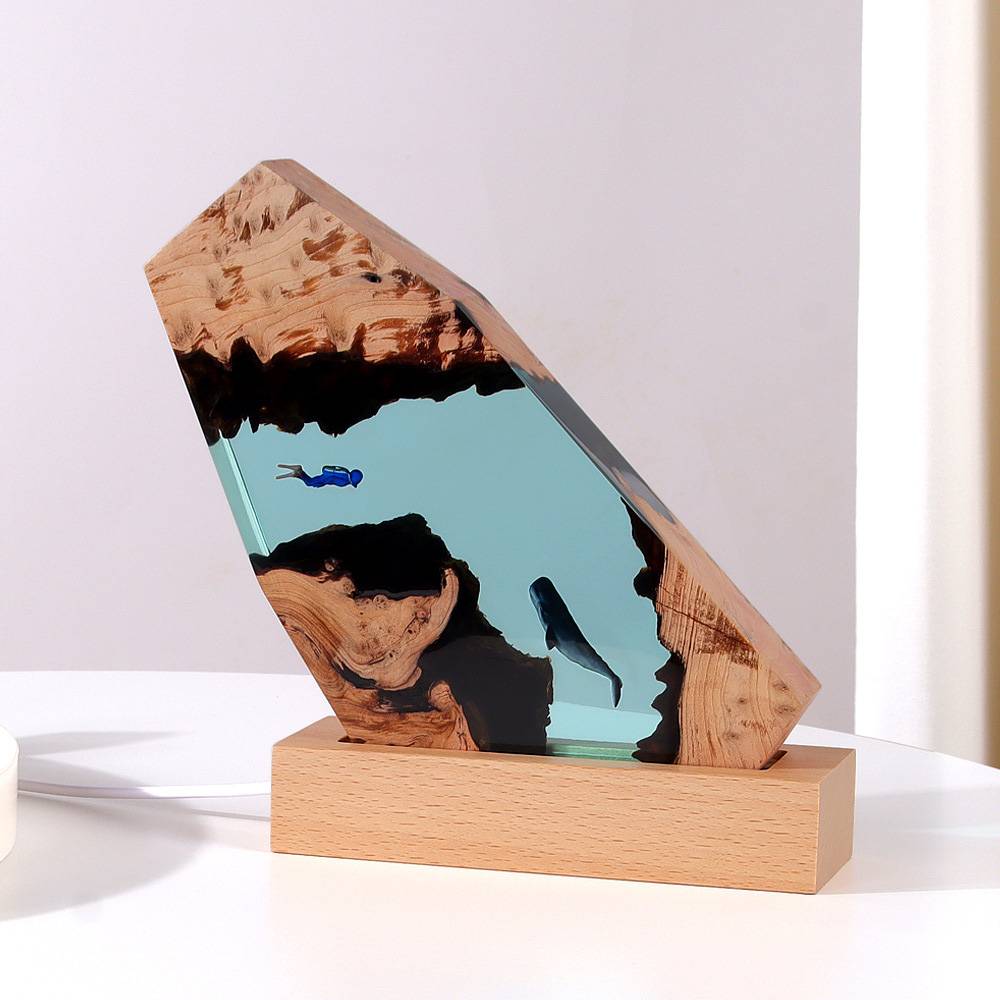 Made of Resin. Cave Whale Diver Desktop Decoration Marine Art Crafts Solid Wood Resin Lamp.The product comes with a light strip, which can be turned on to make it more beautiful. It is the best choice as a gift.