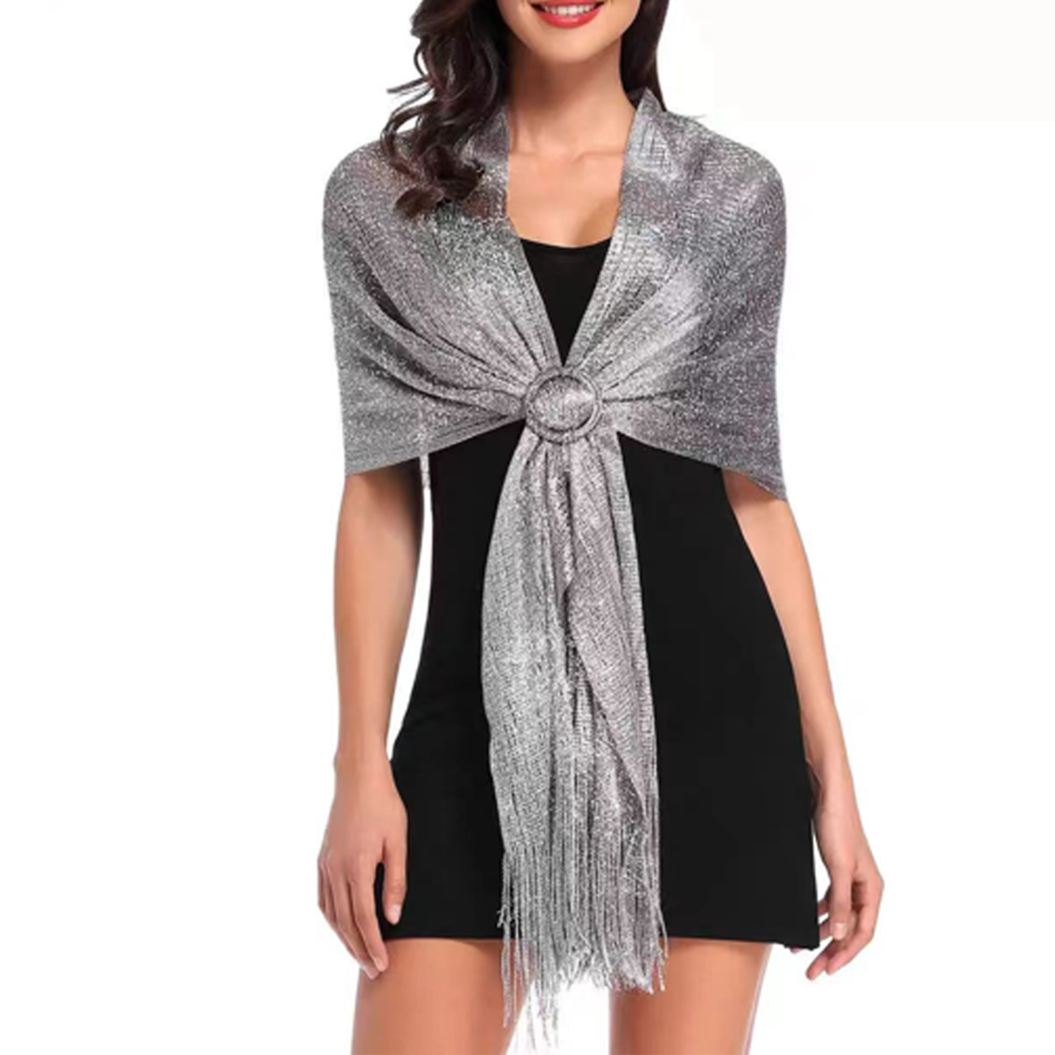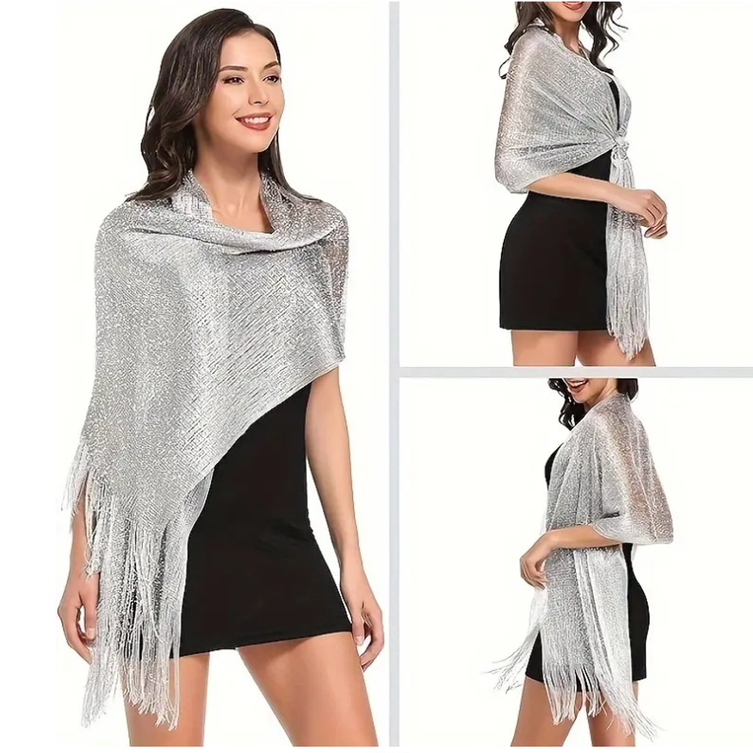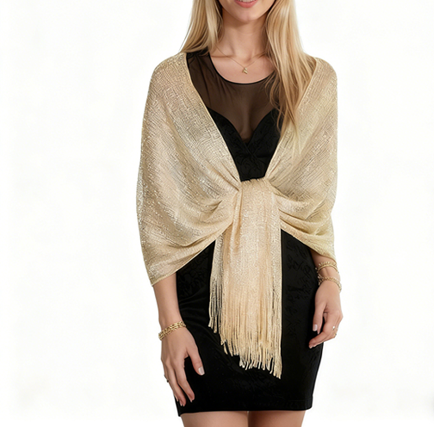 Elegant polyester fringed scarf with gold & silver threads, lightweight, soft, perfect for weddings, parties, formal events.
