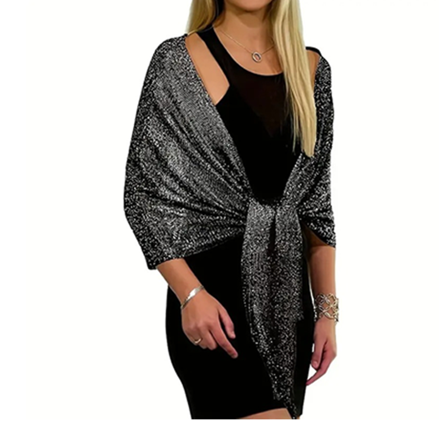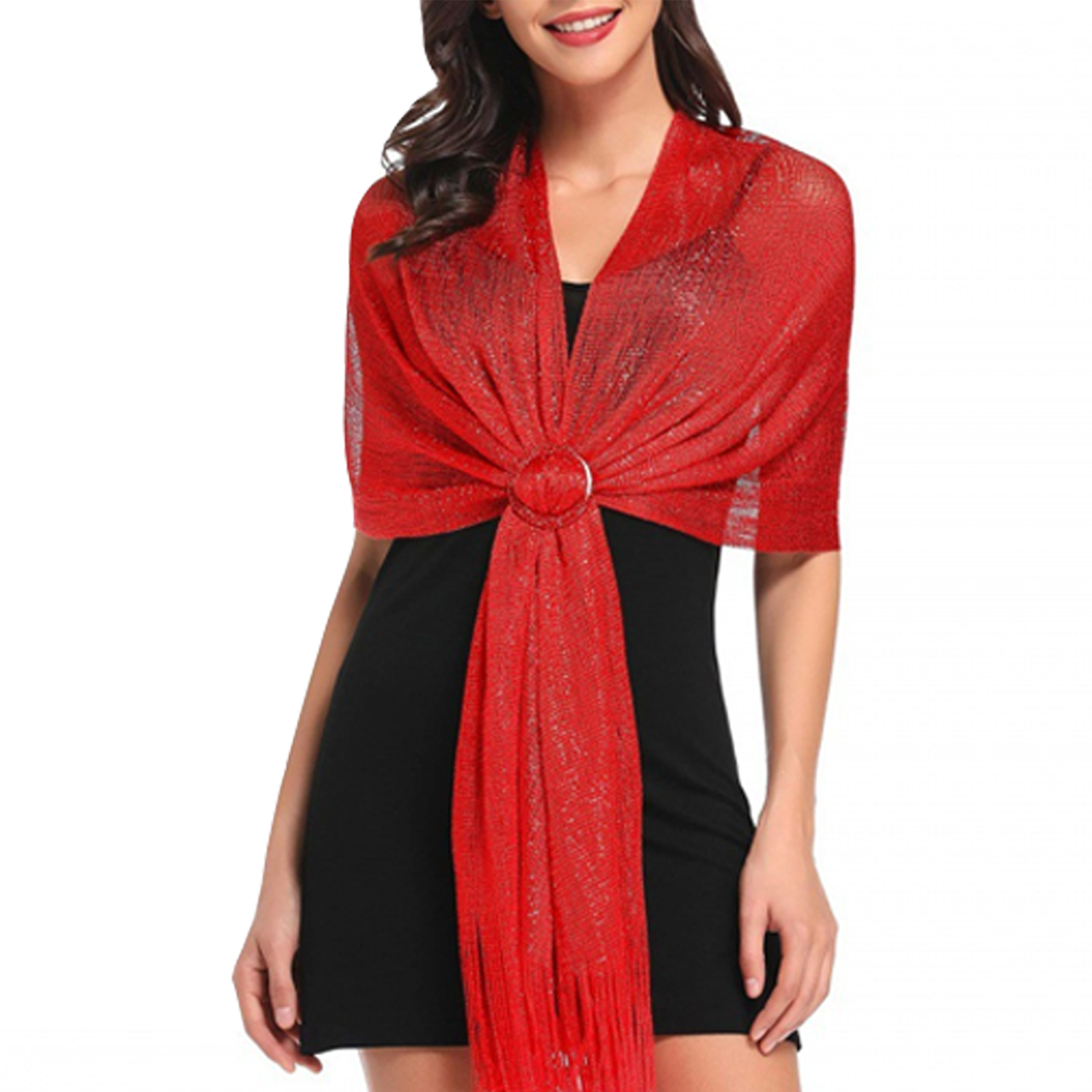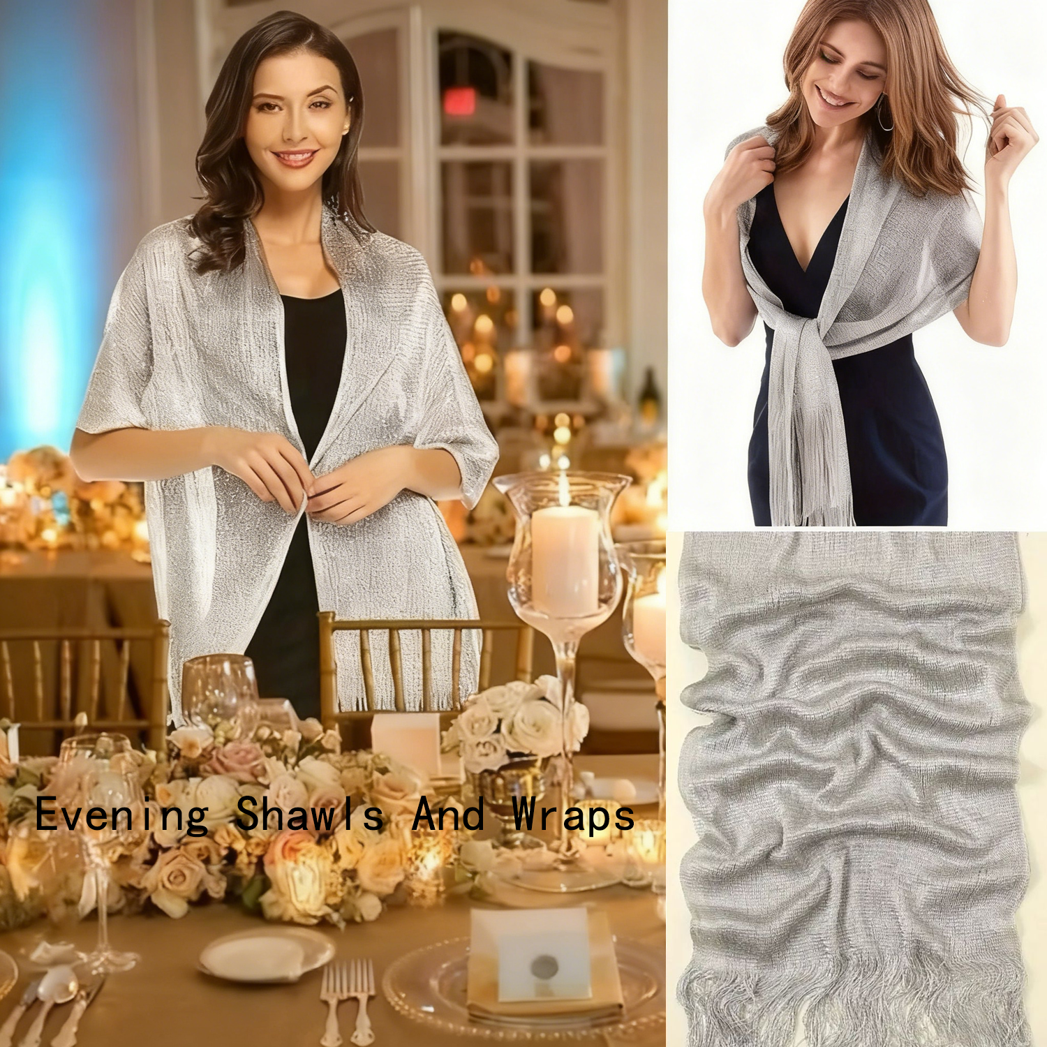 Elegant polyester fringed scarf with gold & silver threads, lightweight, soft, perfect for weddings, parties, formal events.
