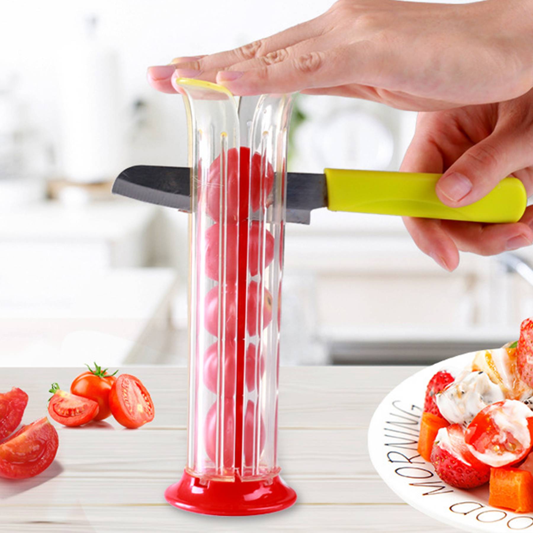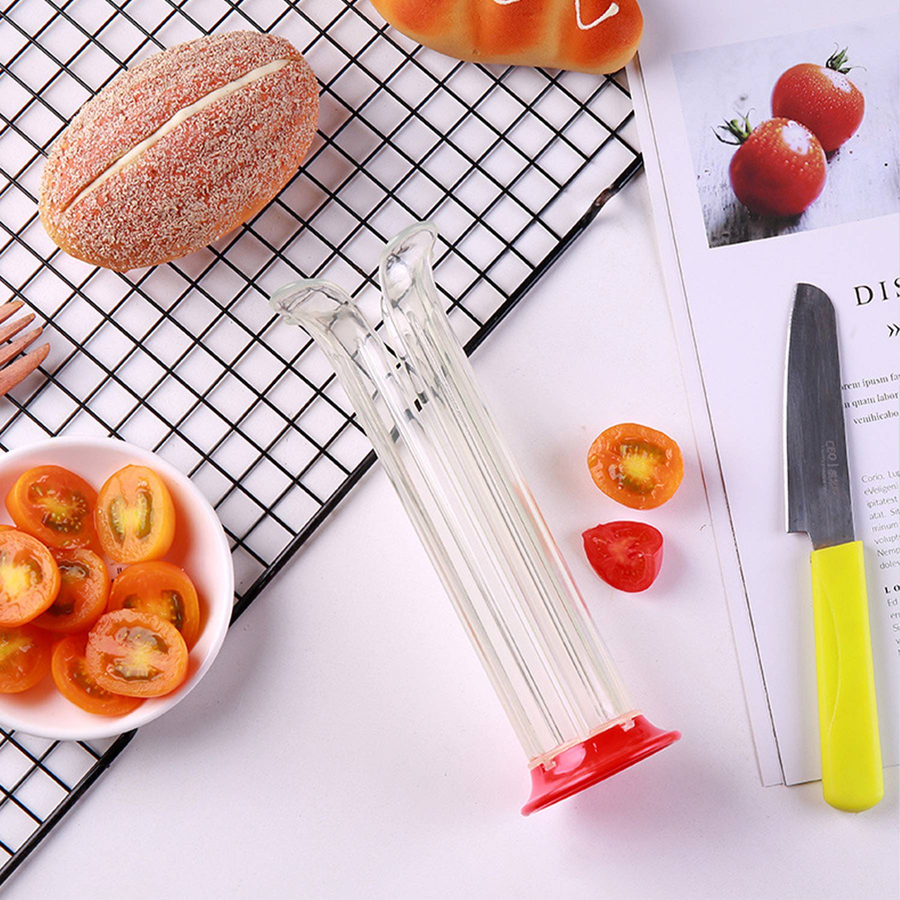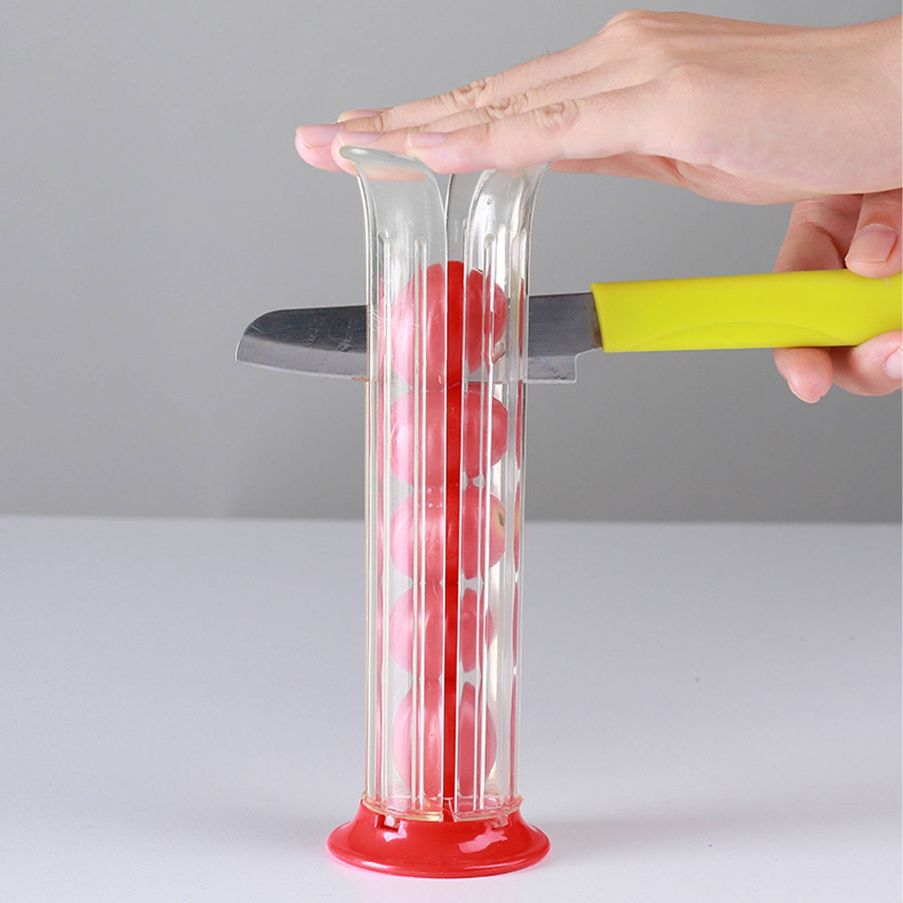 Made of stainless steel and plastic; Ideal for snacks, salads and pasta.Ergonomic design is comfortable to hold and slicing blade is concealed while in use.Safety does not hurt your hands,nor will the fruit juice flow on the table.After use, just rinse the slicer under running water and drain it.Since the tube is fixed, the gapes sizes are different. Please cut the fruit horizontally, with the incision facing up, and use gravity to evenly cut the fruit.
