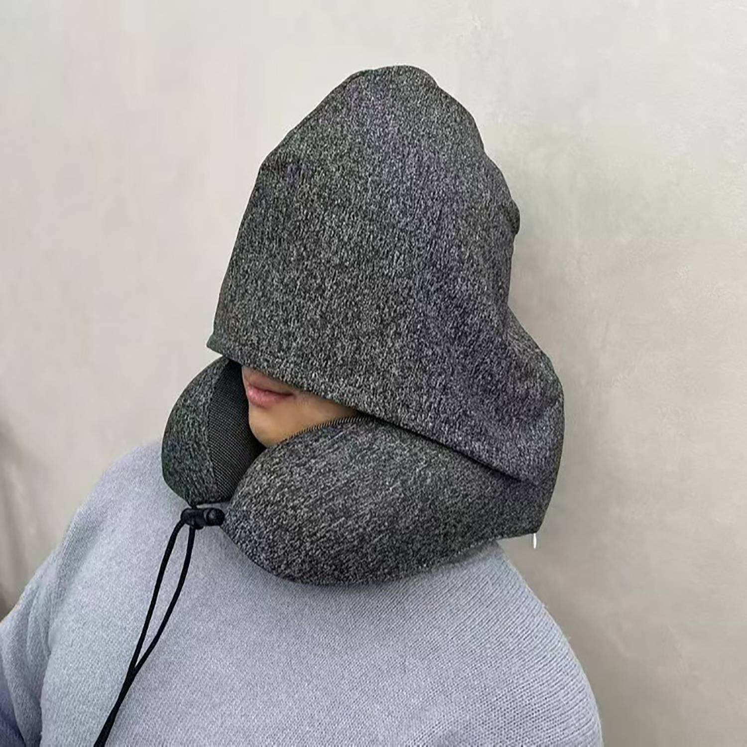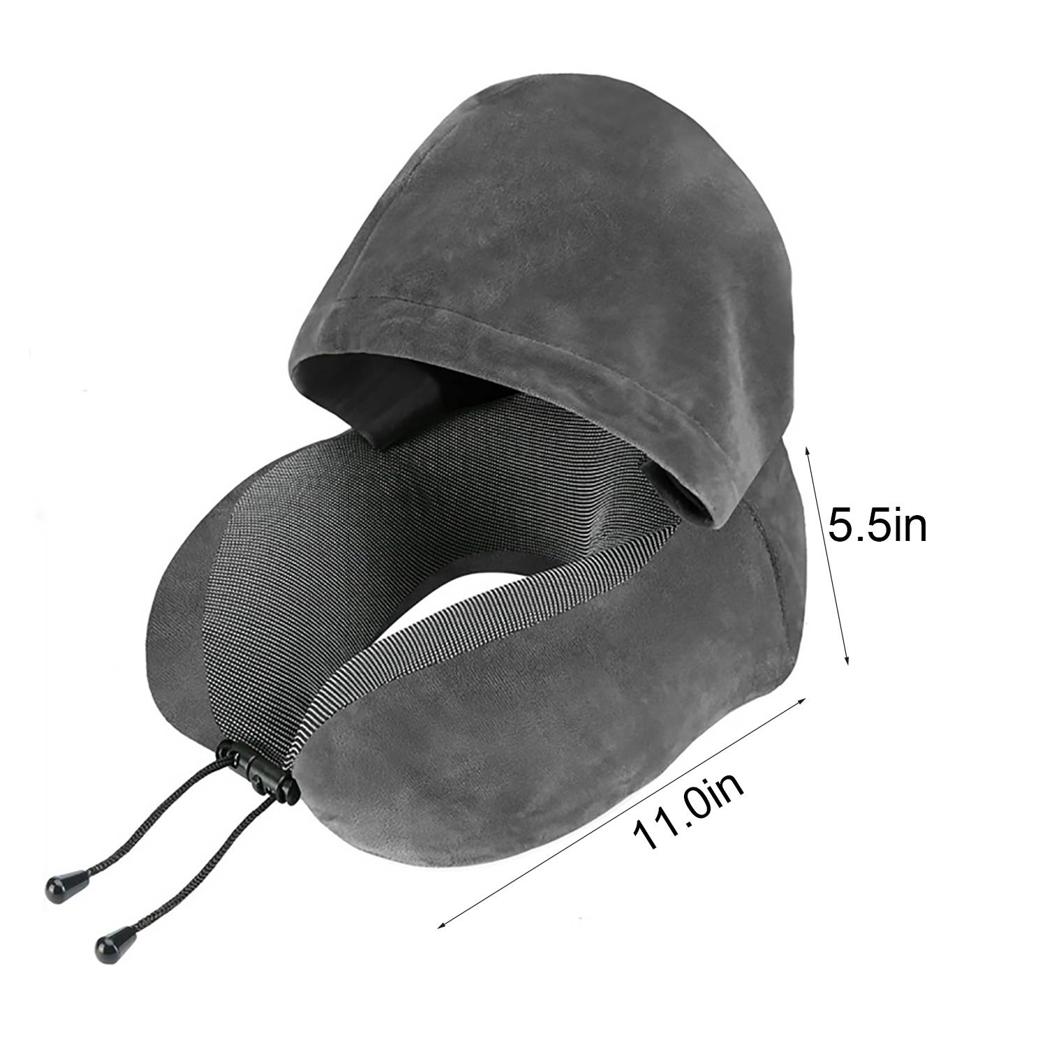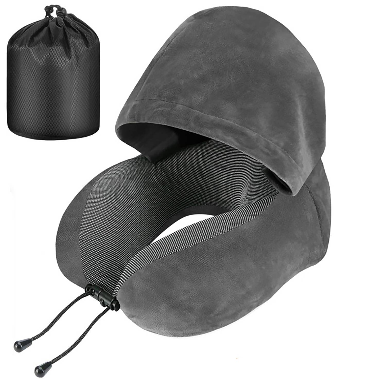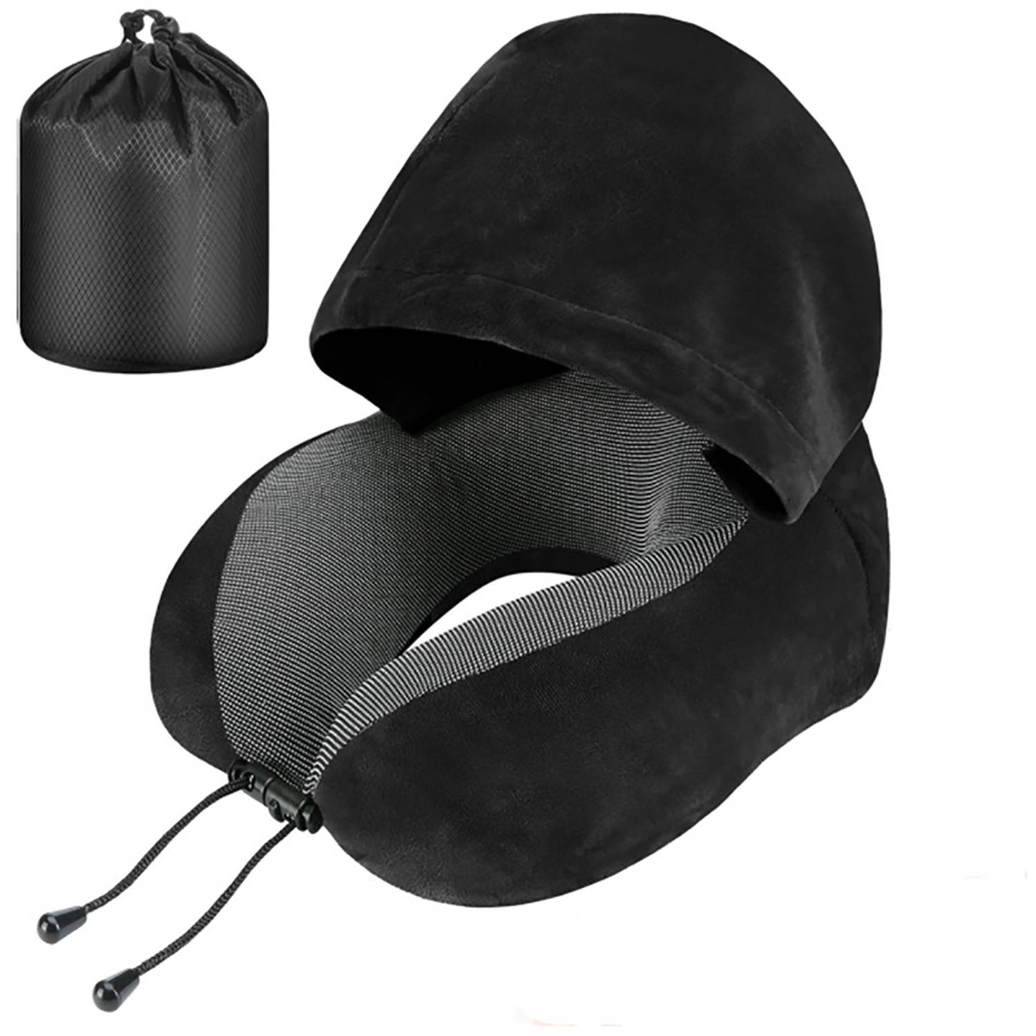 U-shaped pillow with hood for neck support, comfort, and privacy during travel. Includes a drawstring bag for easy storage.