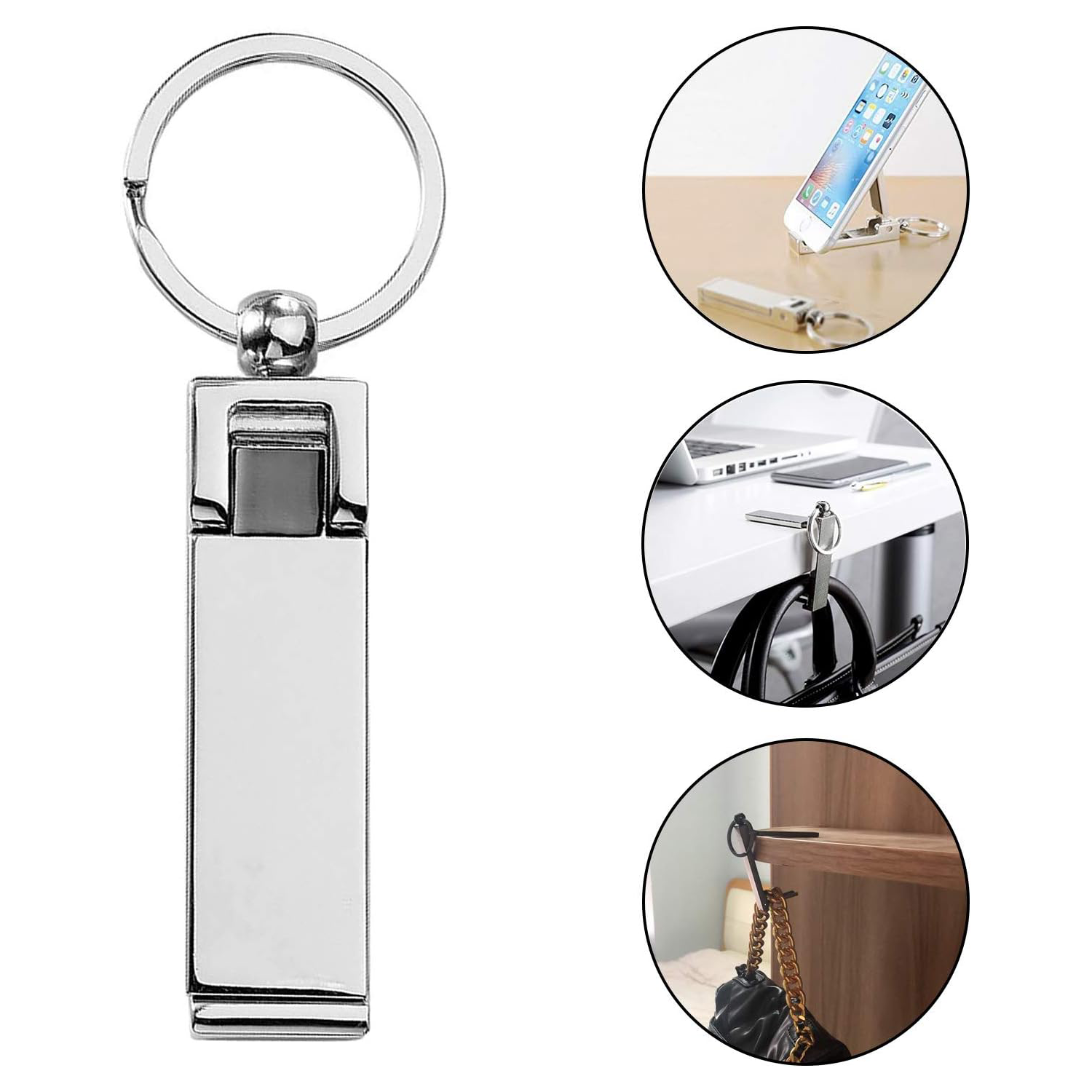 The KeySmart BagHang Plus is a multi-tool keychain that hooks bags securely to surfaces, saving space. It also holds phones.