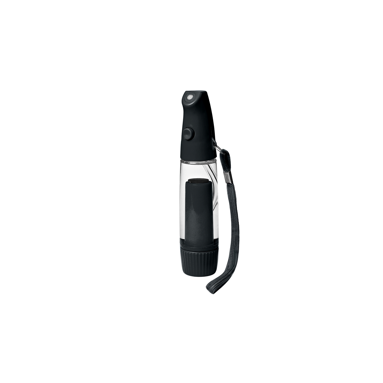 Made of ABS material. 1 oz of liquid. Easy to use. Wrist strap and mini size design. Portable and convenient. Push button technology, no need batteries. Ideal item for summer, outdoors using. 1 1/2″ D x 6″ H