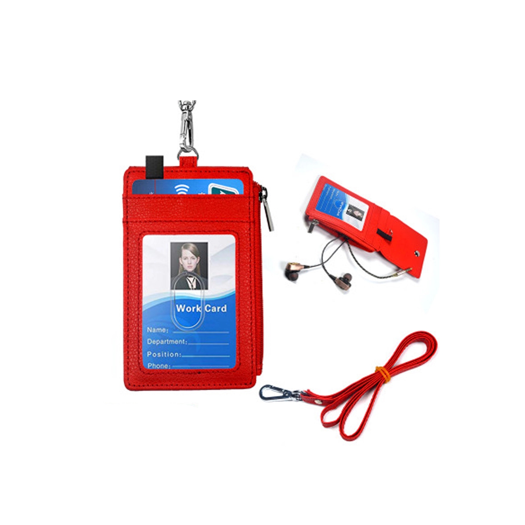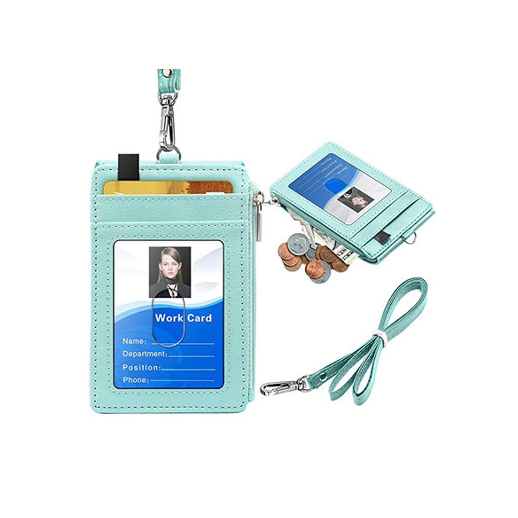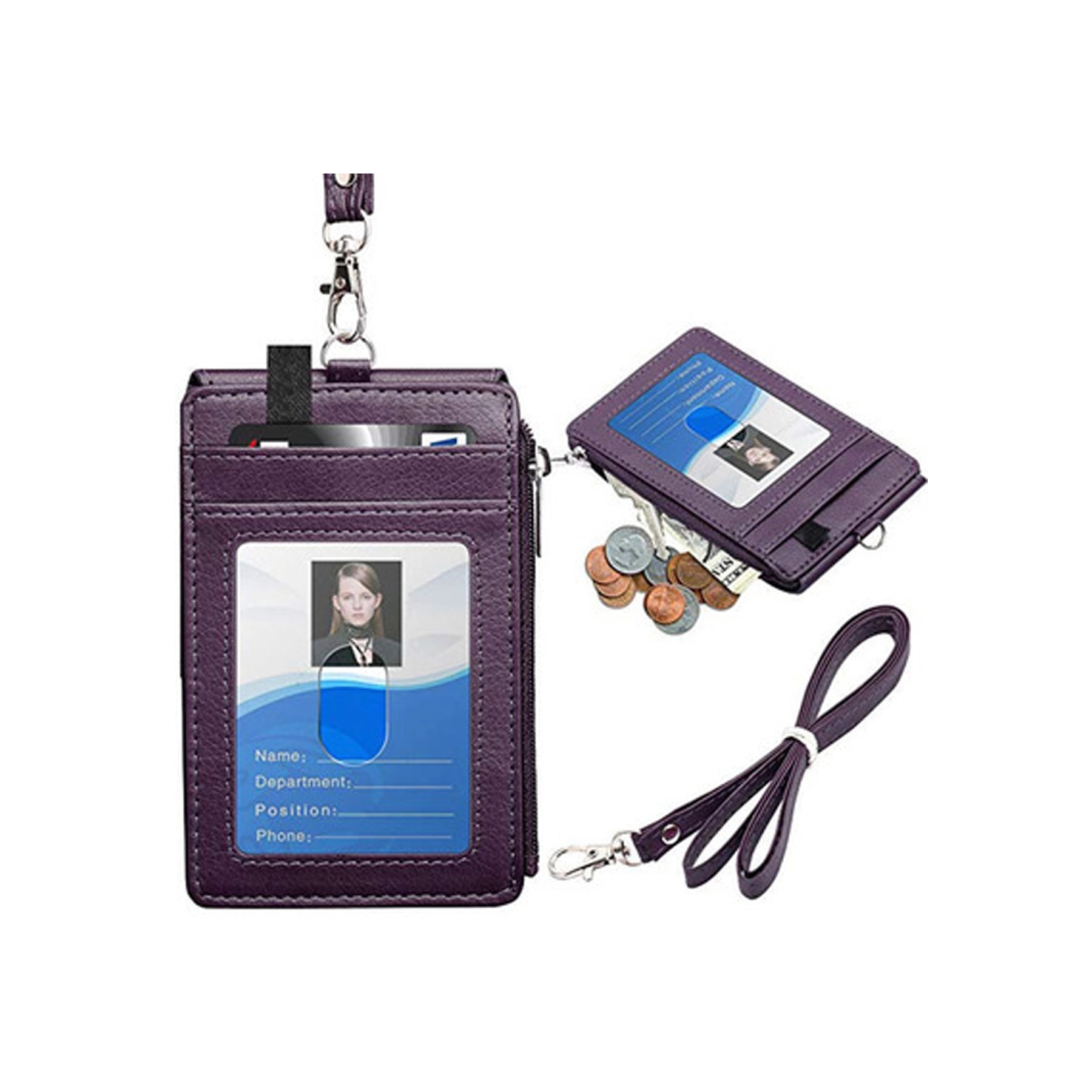 Made of PU leather and include 2 front and 3 back card slots, also a zippered pocket for storing keys, cash or coins. 19.6″ Leather neck lanyard on the top. This card holder can be used with work ID, bank card, elevator card, driver license, etc.Keep your card clean and tidy. Logo can be customized on the back.