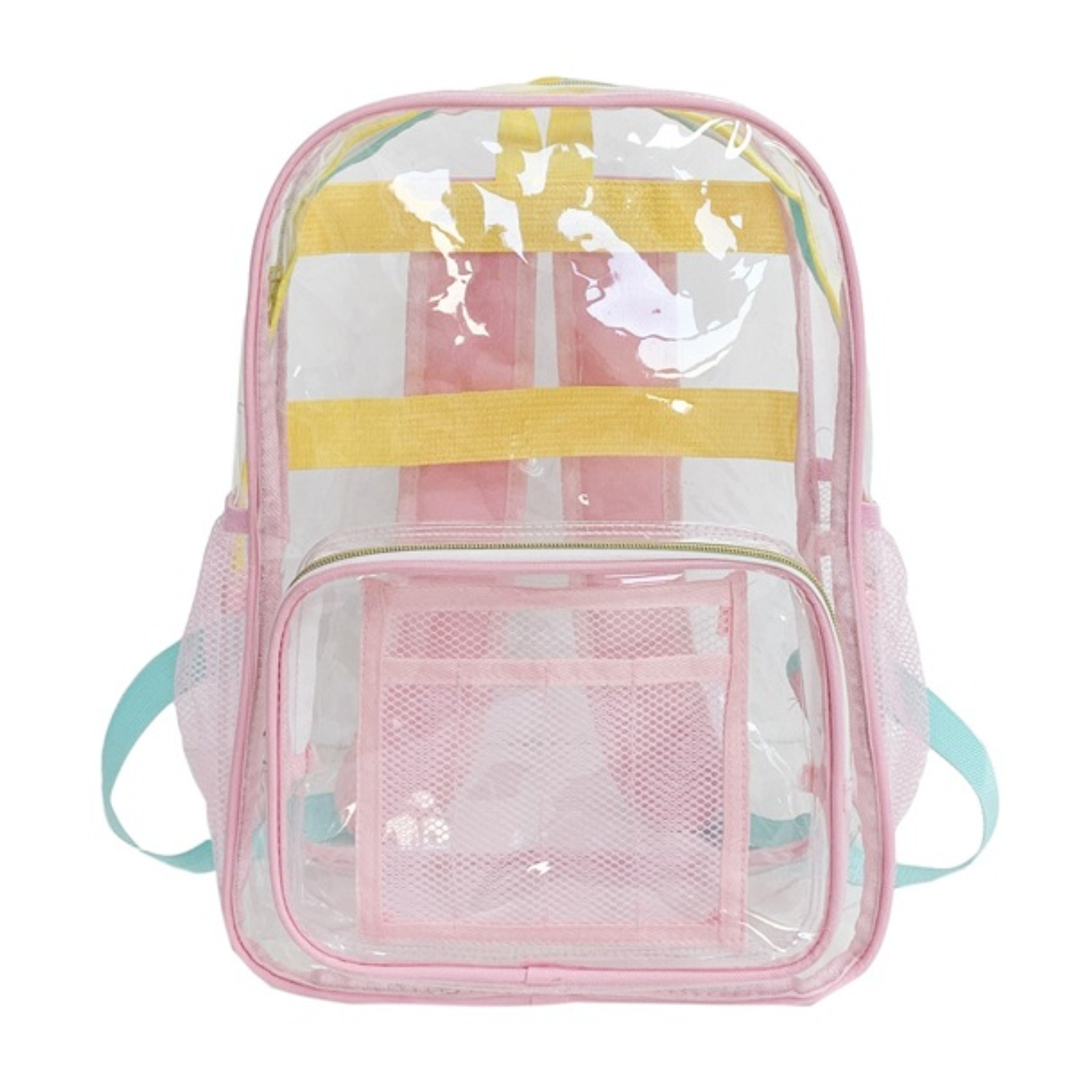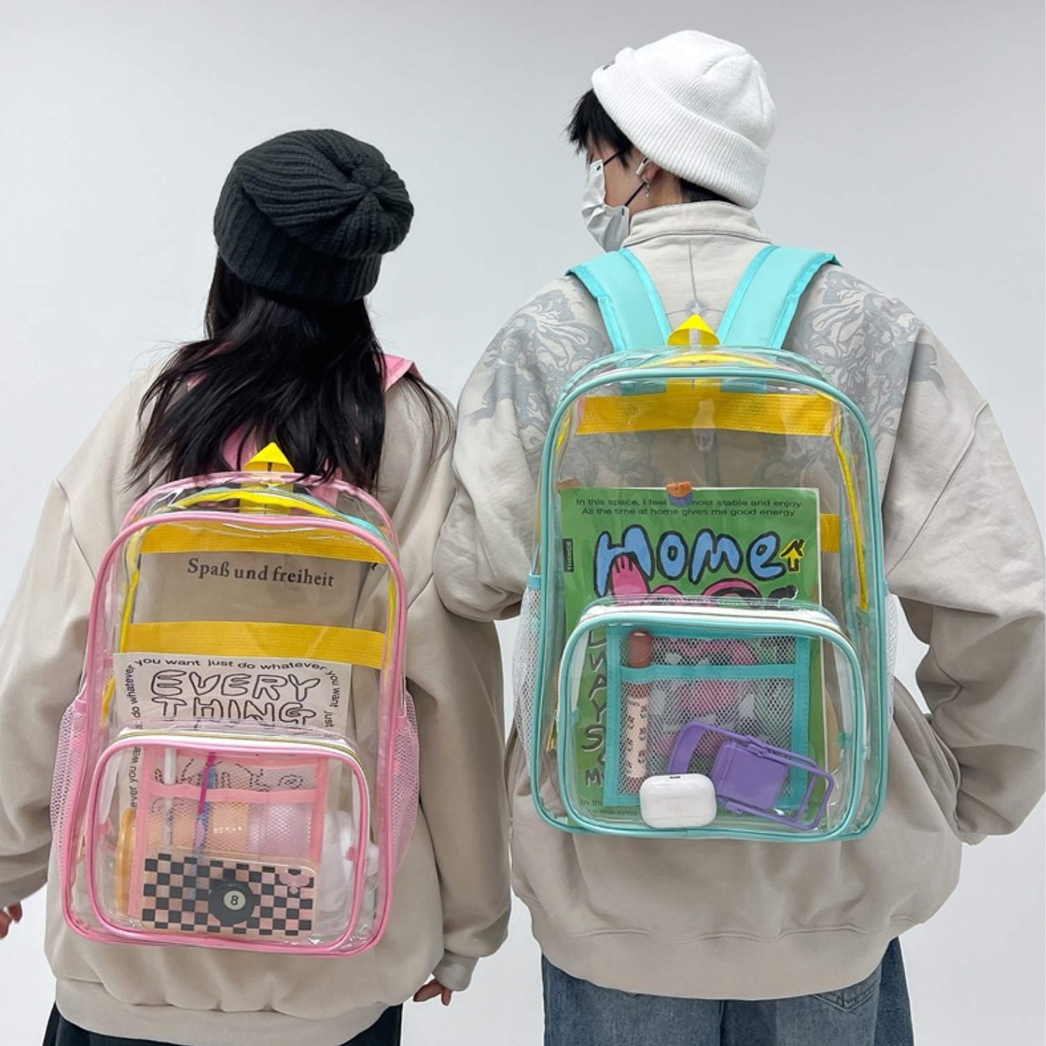 PVC Transparent Backpack: waterproof, fits laptops. Clear for security, organized pockets. Ideal for school/travel.