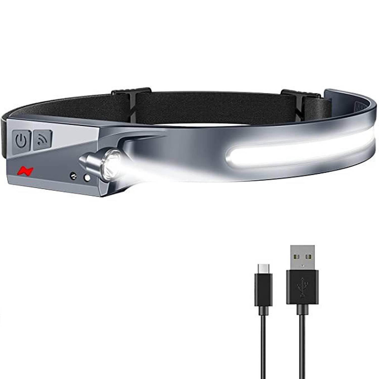 Wide beam COB headlamp with 230° view, XPE side lights, USB charging, long battery life, ideal for outdoor and night use.
