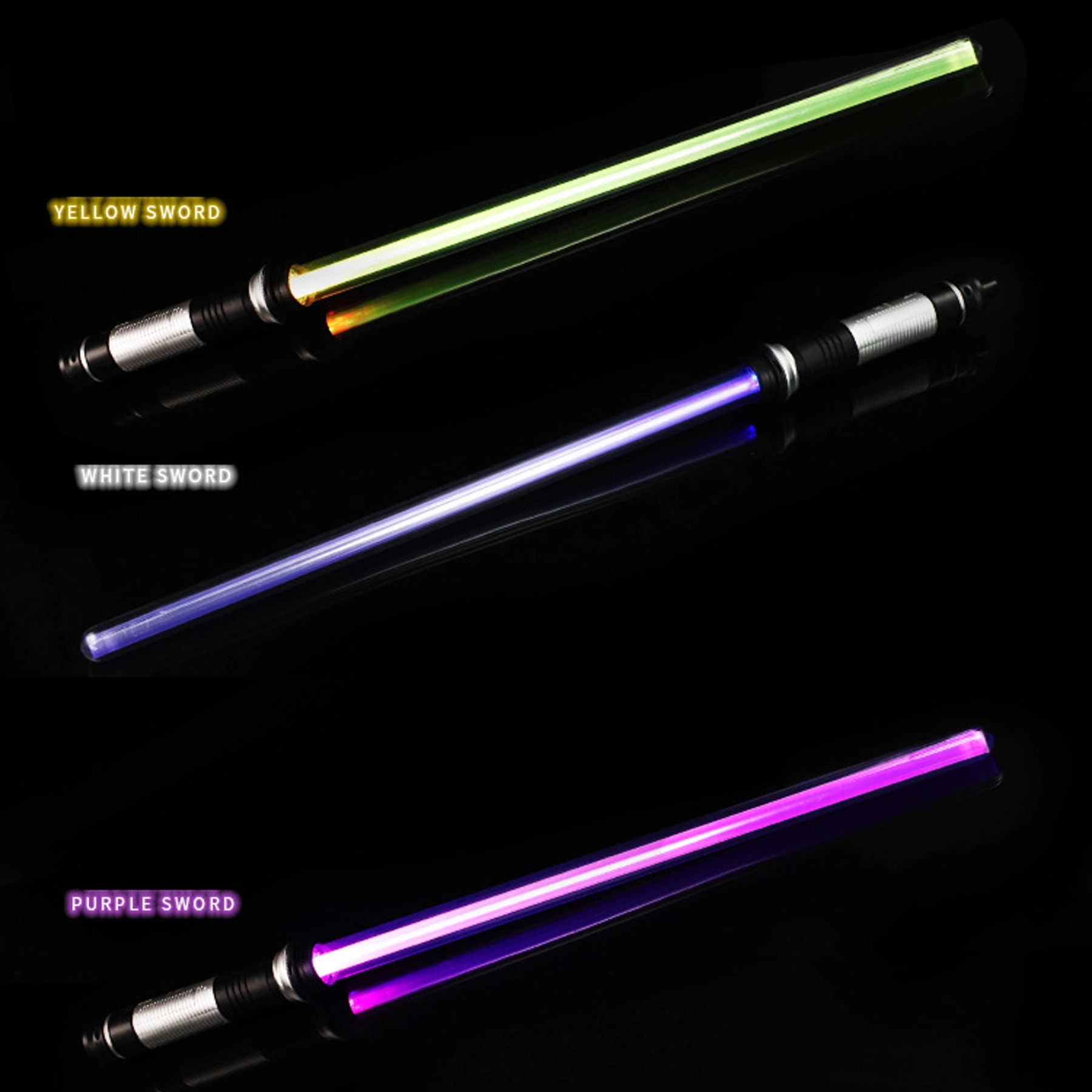 PC blade, supports real duels, Flashes and emits real sound effects when colliding. When you swing it, it is like a real lightsaber. exquisite craftsmanship, beautiful, sturdy, comfortable feel, bringing you a real fighting experience. There are 7 colors that can be switched at will, cool white, red, orange,yellow, green, blue, purple. (Batteries not included)