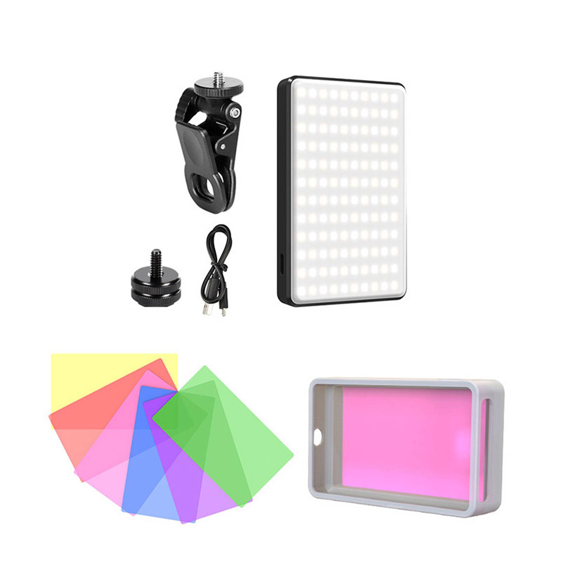 Set contents: 1 ×Pratable Fill Light, 1 × Front Clip, 1 × Triangle Bracket, 1 × Charging Cable, 1 × User Manual, 1 × Cold Shoe Screw, 6 × Color Card, 1 × Soft Shade. The mobile phone selfie light has 3 light modes (bright white, bright white + warm yellow, warm yellow), color temperature adjustment from 2500K-9000K to meet your various usage needs, make you charming in any situation, such as makeup lighting, selfie, video recording, video conference, live broadcast.