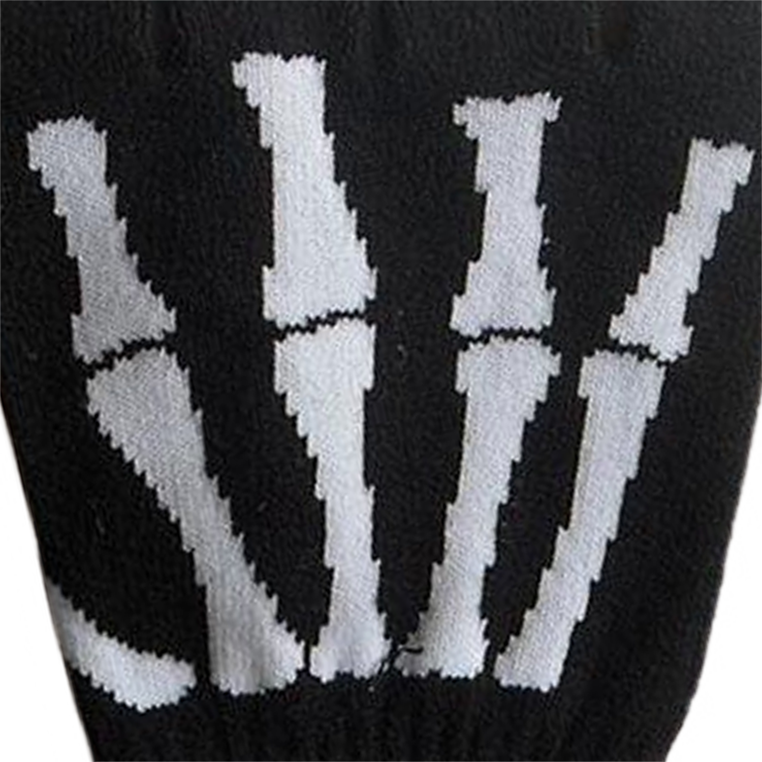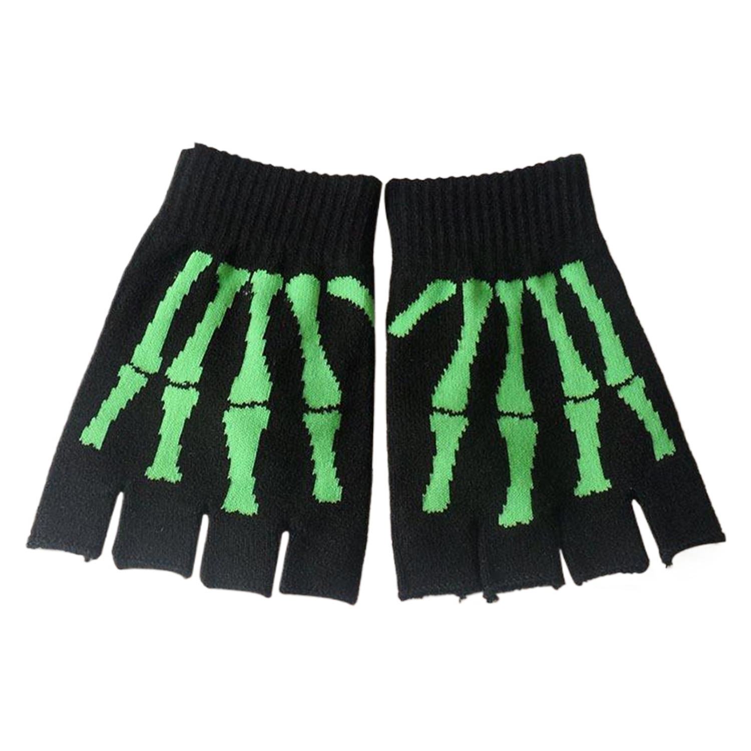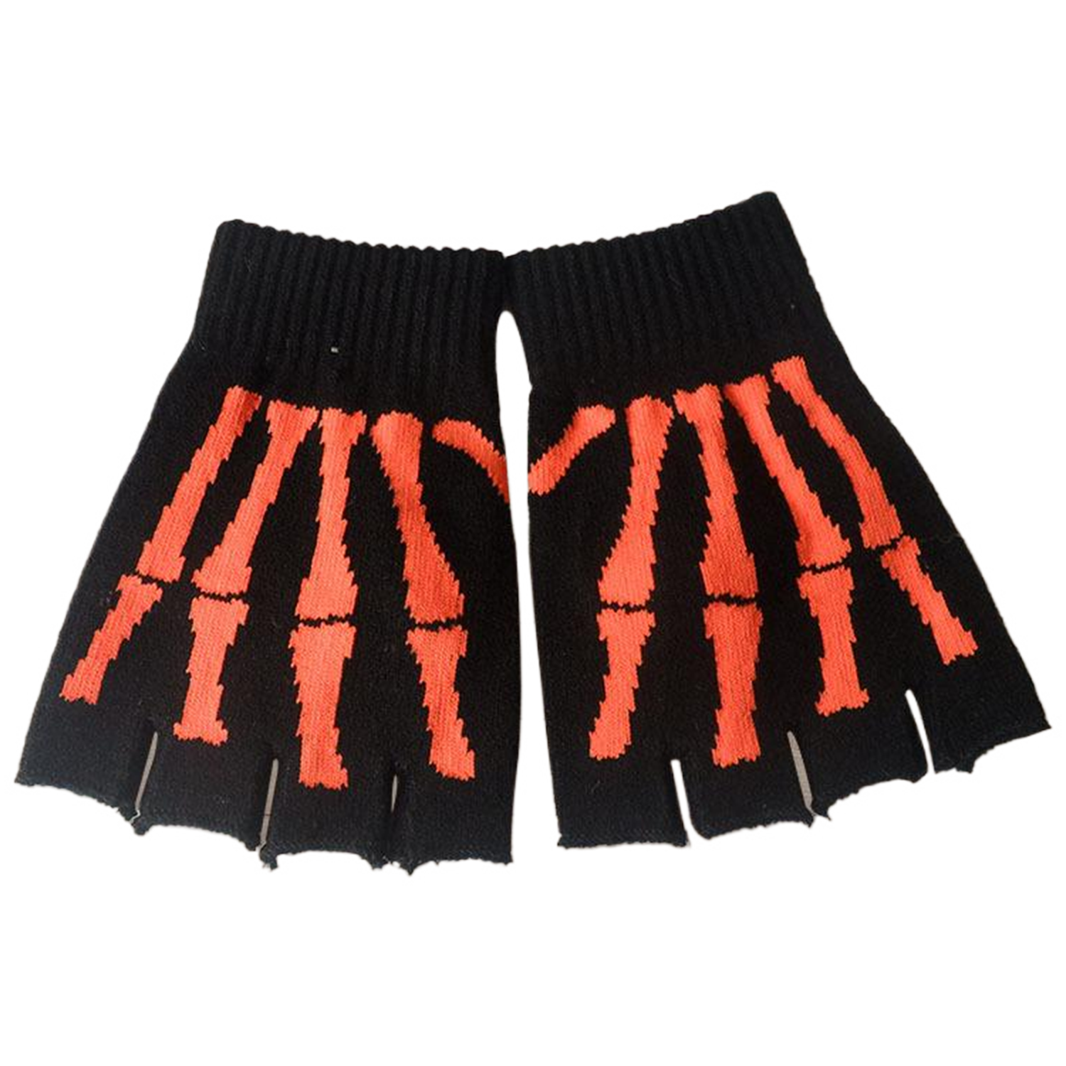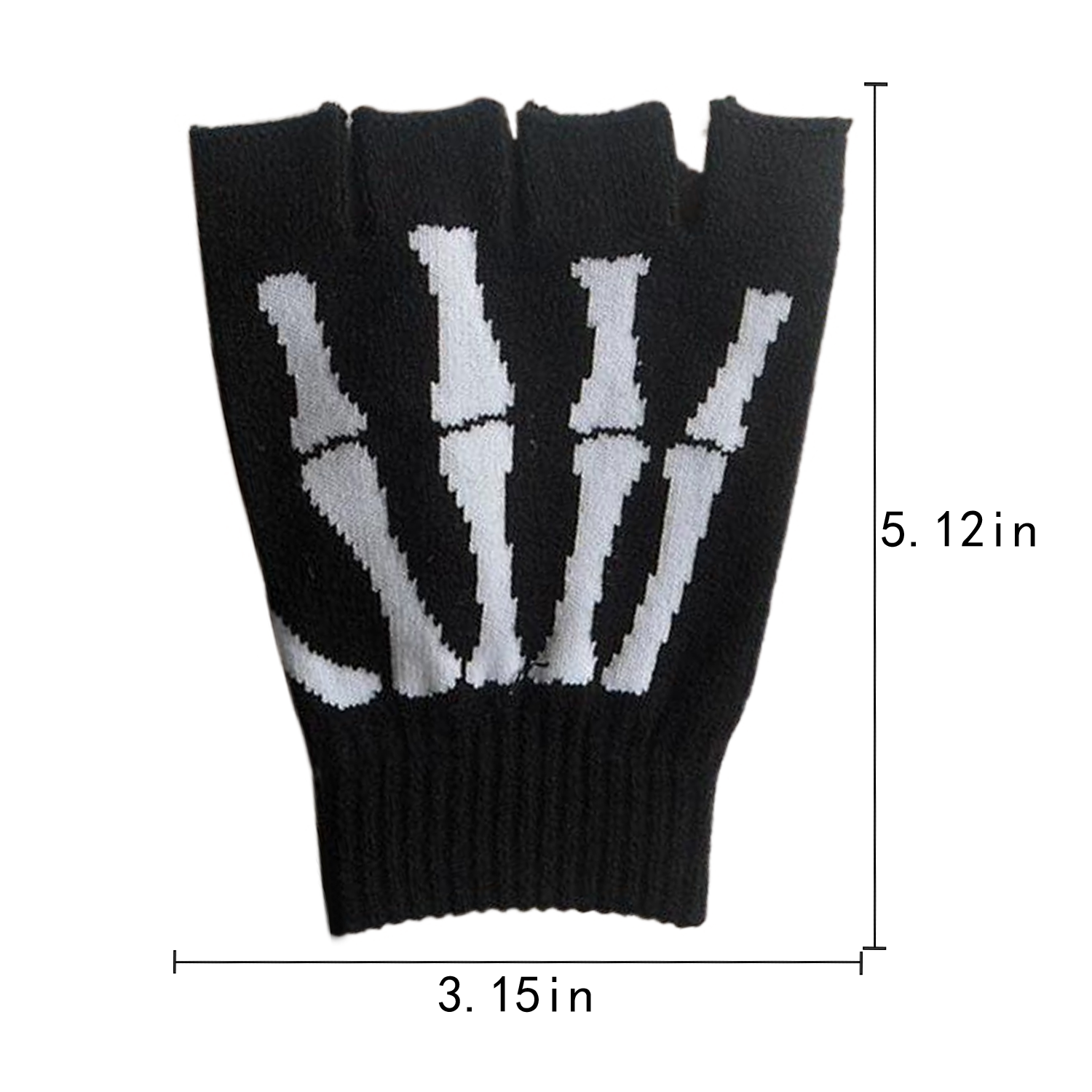 These fingerless gloves feature a detailed skeleton bone pattern on a knit fabric base. The design covers the back of the hand creating a visual effect. Made from a stretchy knit material the gloves offer a comfortable and flexible fit for various hand sizes. The fingerless design allows for unrestricted movement and touch sensitivity. The knit construction provides light warmth while maintaining dexterity. These gloves are ideal for Halloween costumes themed parties cosplay events.