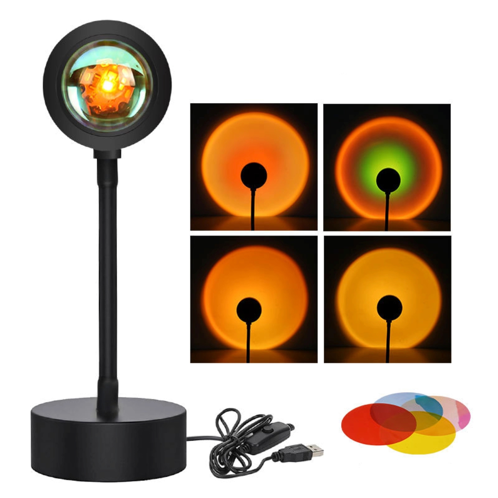 This LED ambient light head is made of plastic-coated aluminum and ABS shell, the hose is made of metal and black silicone sleeve, and the base is made of ABS. Four effects of rainbow, sun, sunset and sunset red can be projected through the remote control switch. The metal hose can be flexibly adjusted 360 degrees, illuminating different lights at different angles. We offer another four-color clear film, you can change the film with different colors to get two different colors, open the lampshade, take out the crystal lens, and change the light film.