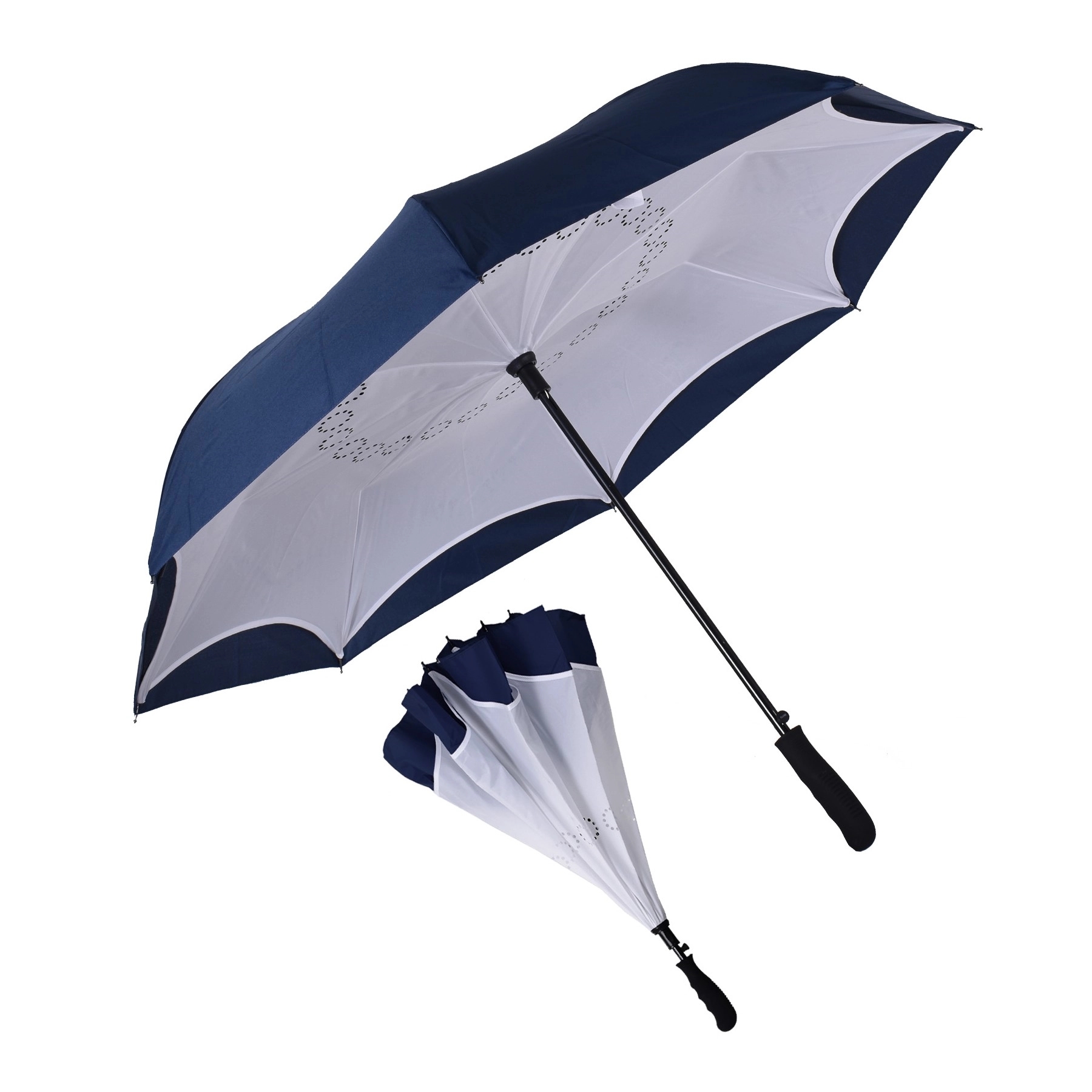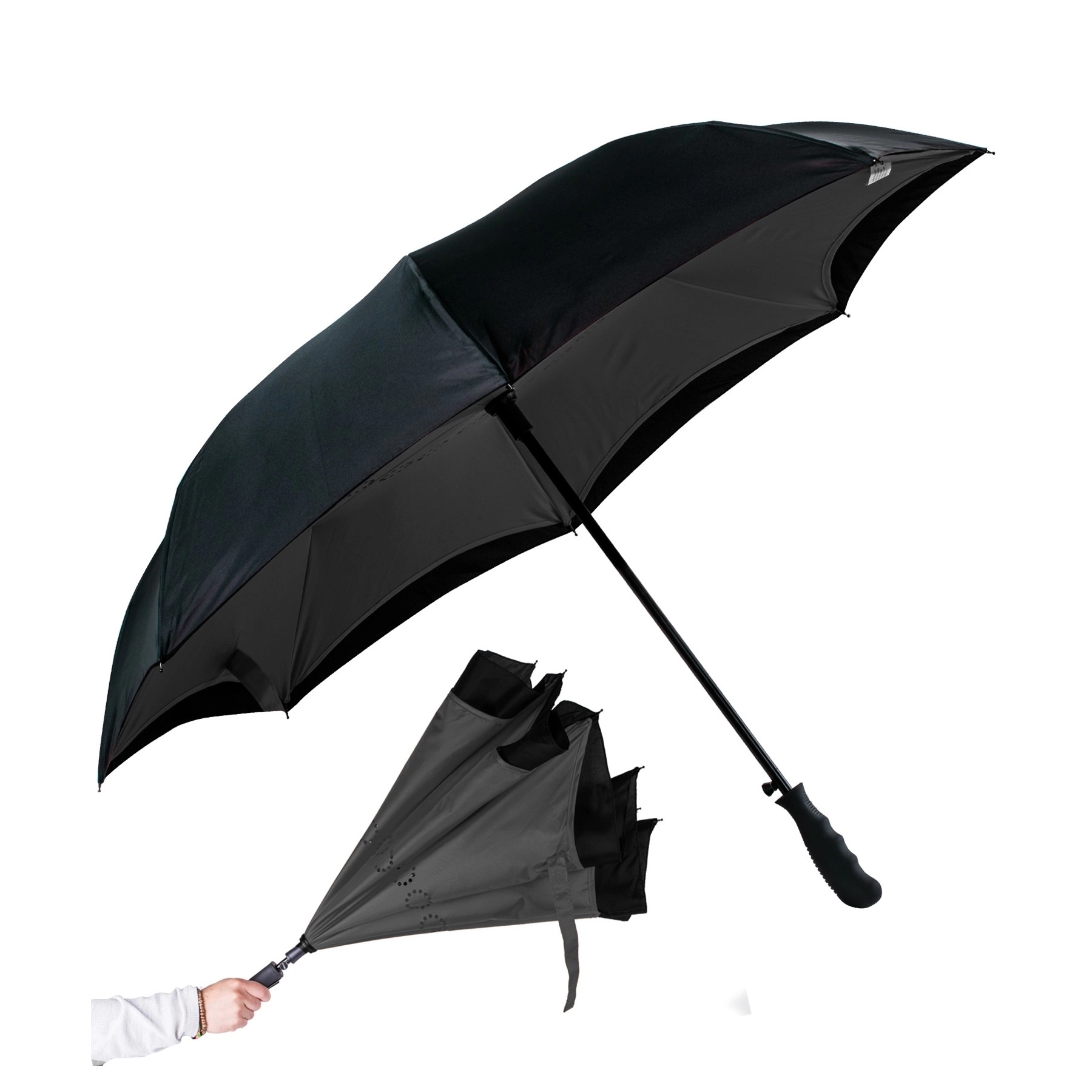 The Rebel is an umbrella featuring a revolutionary design that allows the water to push away when closing, making it easy when entering or leaving a car or through a door and keeping you dry in the process. Plus, the inverted closing action keeps the dry side of the umbrella on the outside when brought indoors. Specs include a 48″ arc, automatic closing mechanics, pongee fabric and a straight rubberized grip handle. Complies with Prop 65. 48″ D.