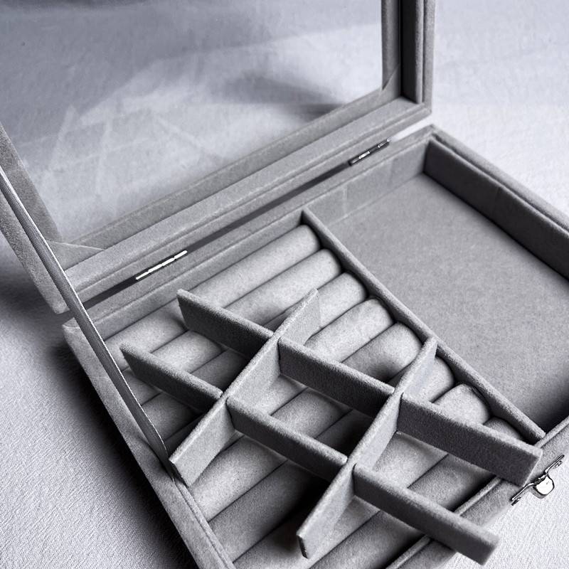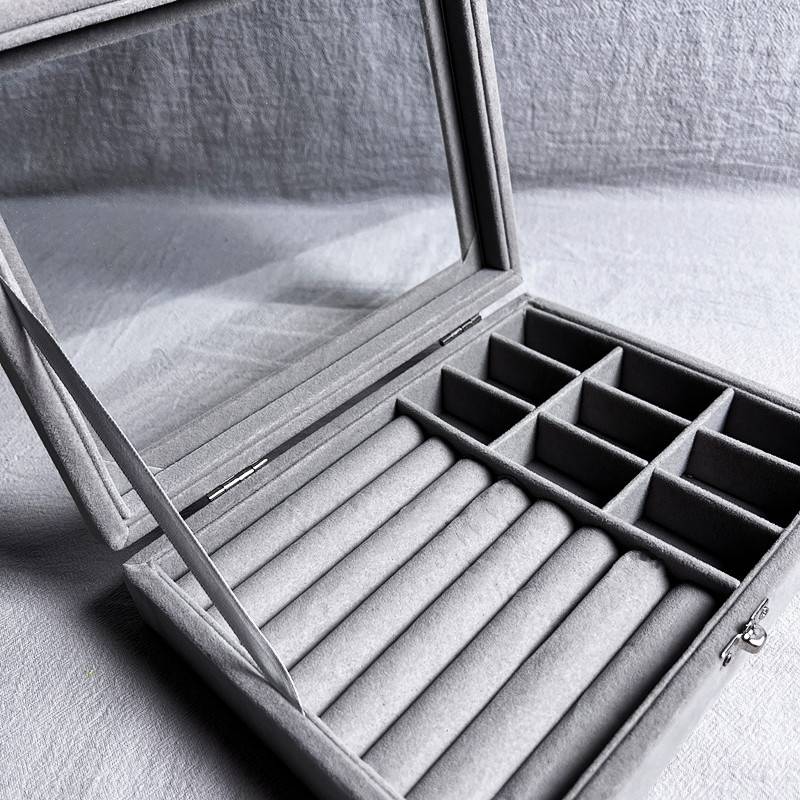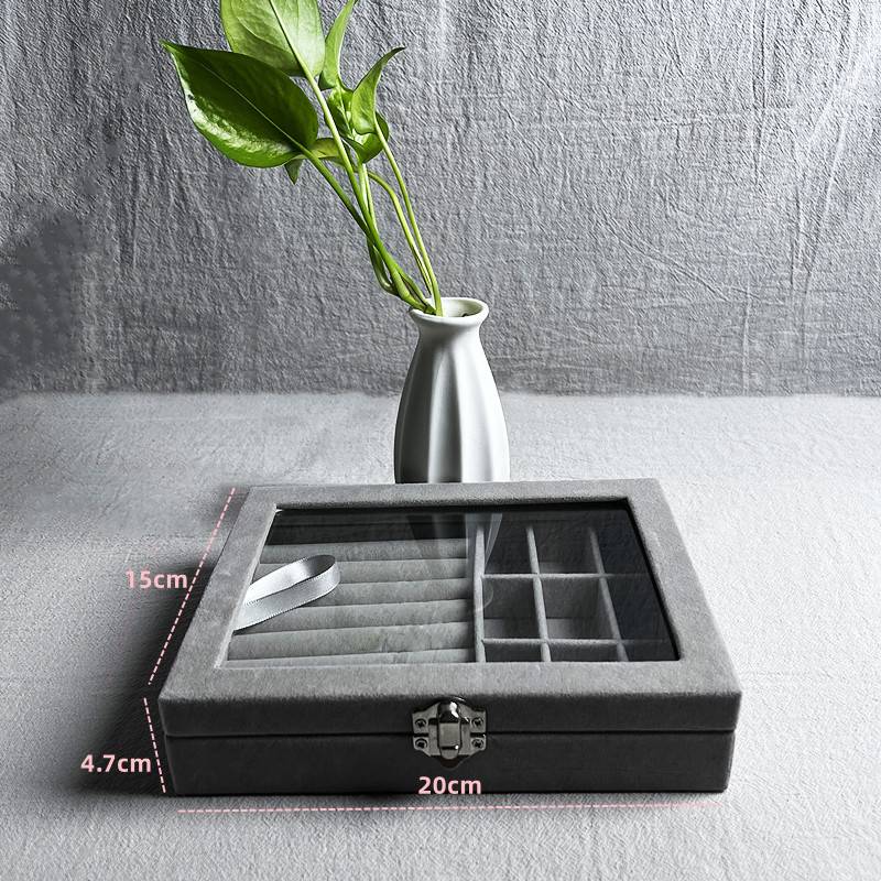 Elevate your jewelry organization with our Large Capacity Jewelry Holder. With 9 grids and 8 ring slots, it stores earrings, rings, and necklaces effortlessly. The clear glass lid keeps your jewelry dust-free and easily visible. Crafted from high-quality composite board and soft ice velvet, it ensures jewelry protection. The convenient one-clasp design keeps your treasures neatly organized. Make gifting a breeze with this ideal choice for birthdays, Christmas, Valentine’s Day, Mother’s Day, etc.