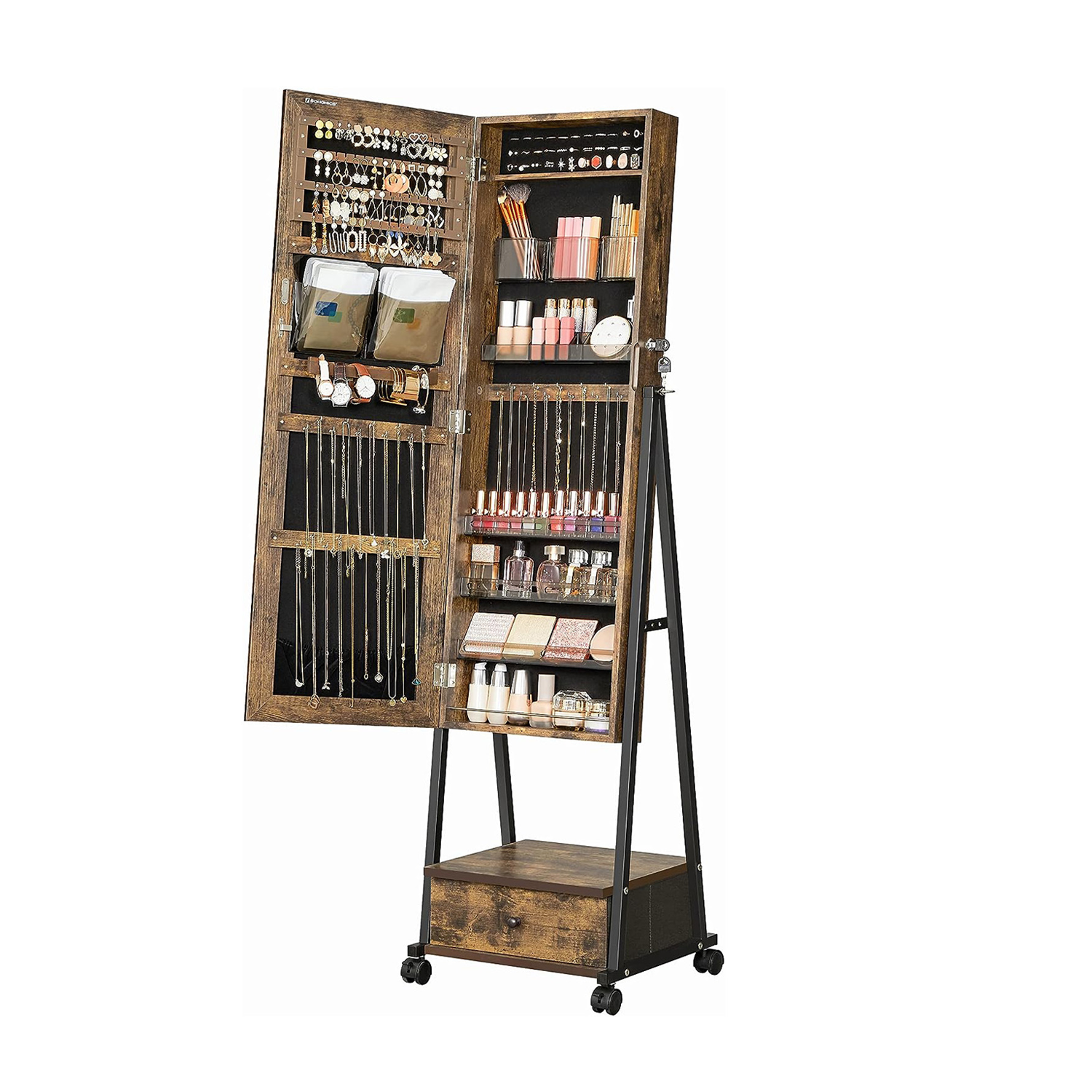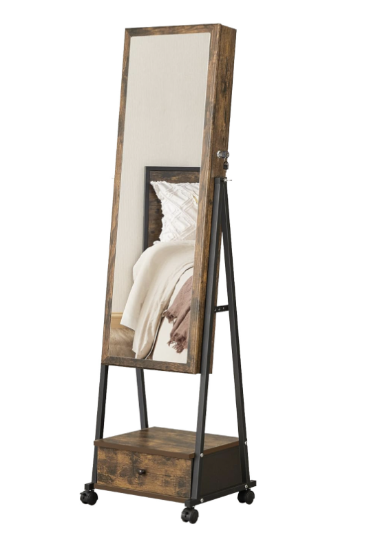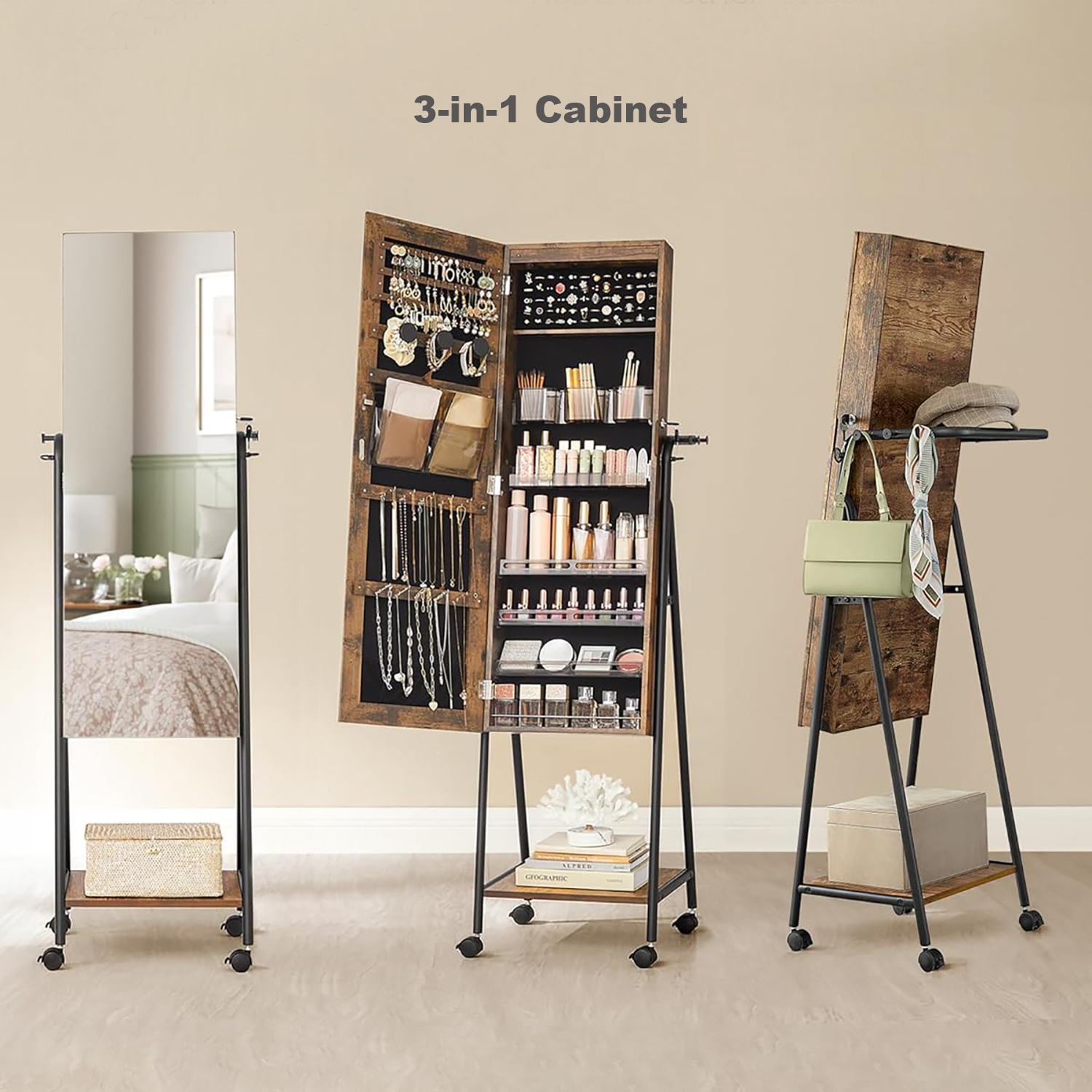 3-in-1 Storage Solution, A cabinet for your jewelry, a full-length frameless mirror for your daily outfit checks, a coat rack with a bottom shelf for your clothes, purses, hats, and shoes. Everything you need to start your day is now in one place,With 45 earring slots, 24 stud earring holes, 20 necklace hooks, 60 ring slots, and 3 bracelet rods, this jewelry cabinet provides ample space to organize your collection by type,Equipped with 4 lockable 360° swivel casters.