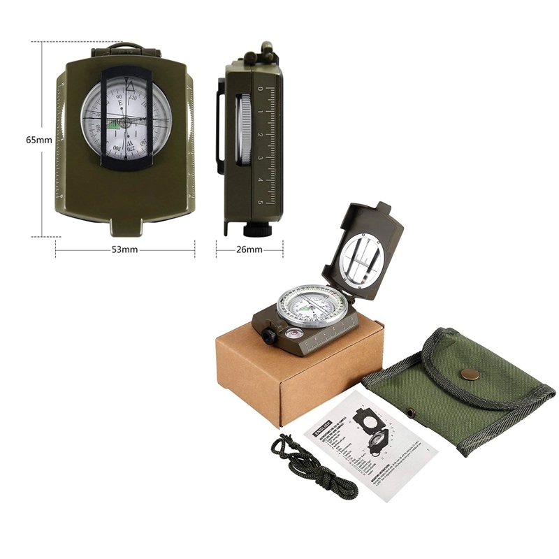 Durable metal compass with floating dial, made of high strength engineering metal and covered by army green paint, which is capable of working under extreme weather condition. Refers to north, orientation, positioning, ranging, slope measurement (pitch Angle), azimuth measurement, surveying ruler, magnifying glass, etc. Waterproof and shakeproof, suitable for motoring, boating, camping, mountaineering, exploring, hunting and other outdoor activities.