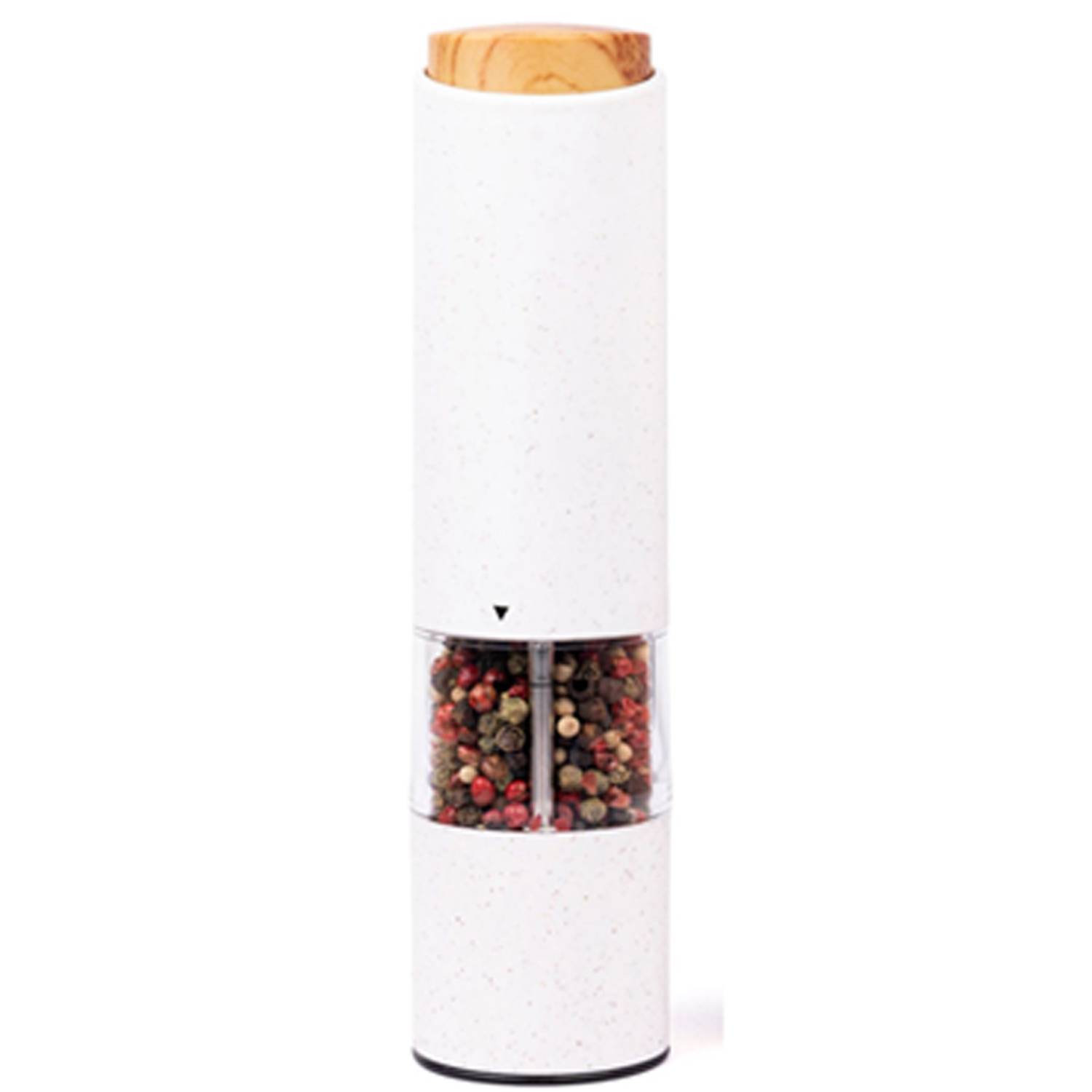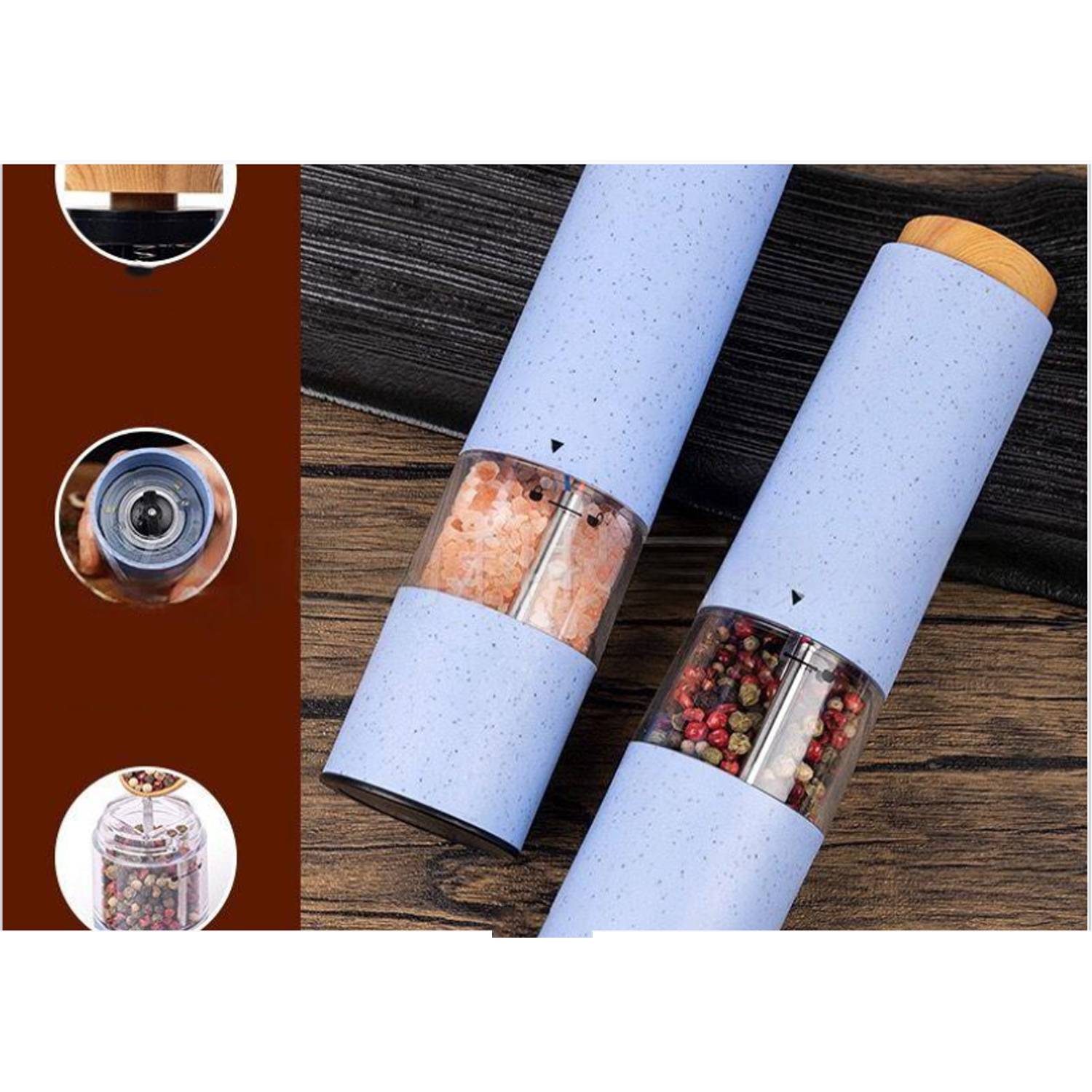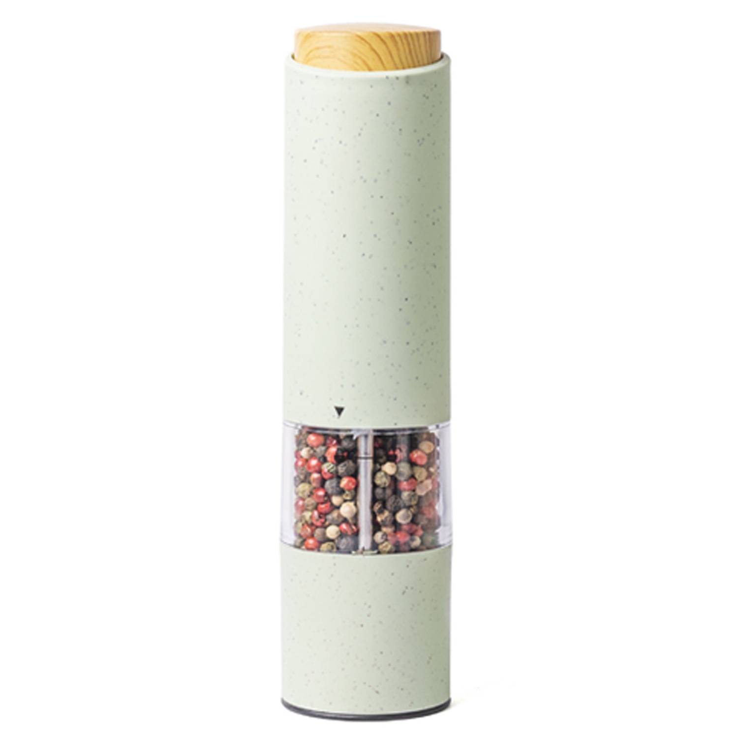 Electric pepper grinder: 8.1”x2”, eco wheat straw/ABS/PC. Ceramic grinder, one-touch, LED light, adjustable grind,for kitchens.