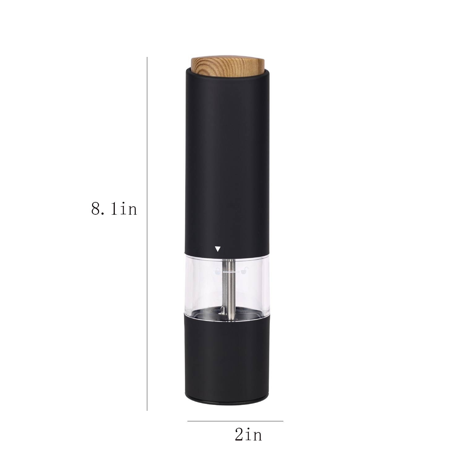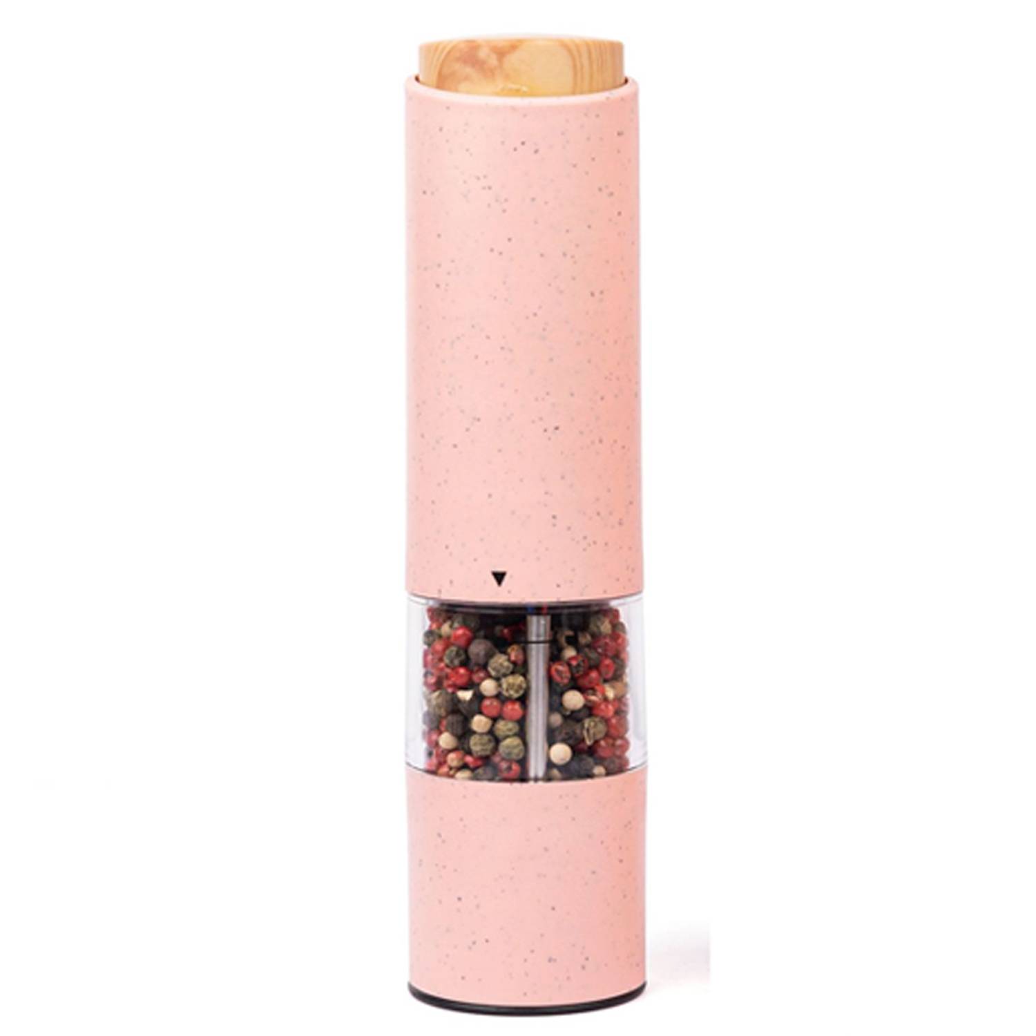 This electric pepper grinder is a must-have for home kitchens.Compact 8.1”x2” size crafted from eco-friendly wheat straw blend with ABS and PC it features a sleek wood-patterned button for a look. The high-strength ceramic grinder ensures durable odor-free grinding.With one-touch operation built-in LED light illuminates spices while adjustable grind settings (from fine to coarse) meet diverse needs. Its large transparent chamber lets you check levels easily avoiding frequent refills.