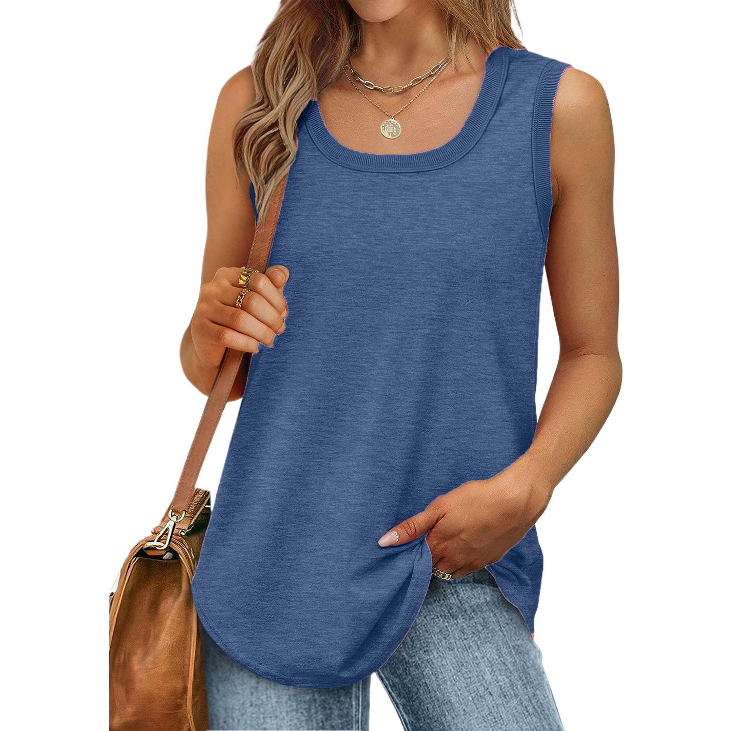 Crafted from a soft and breathable polyester-cotton blend, this women’s sleeveless solid tank top features a classic crew neck and relaxed fit for all-day comfort. Available in eight inclusive sizesand nine versatile colors including white, black, purple, light blue, blue, green, gray, khaki, and brown, it offers a minimalist yet functional design ideal for layering, gym workouts, casual daily wear, or as an undershirt. Lightweight, moisture-wicking, and easy to care for.