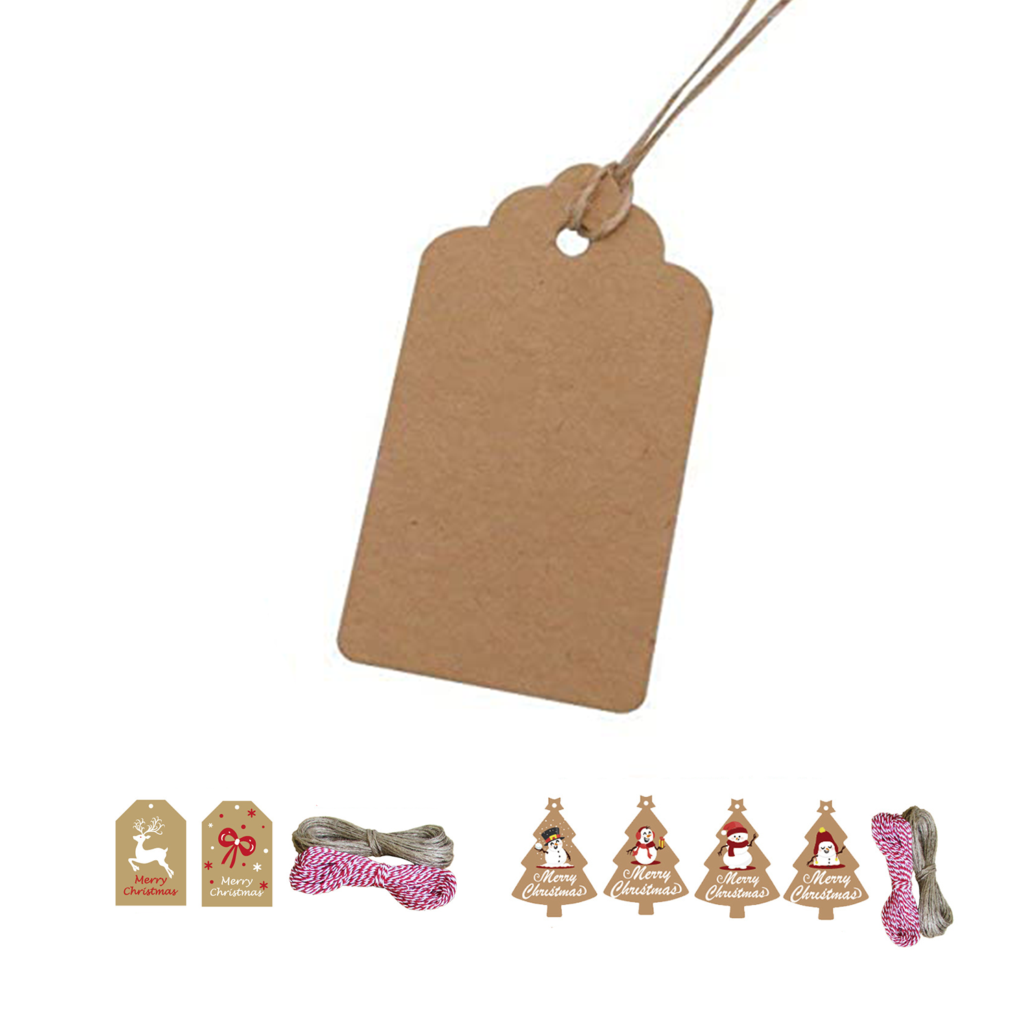 Theme Kraft Tags (come with hollow hearts and a wide variety of Christmas-related patterns), paired with twines.