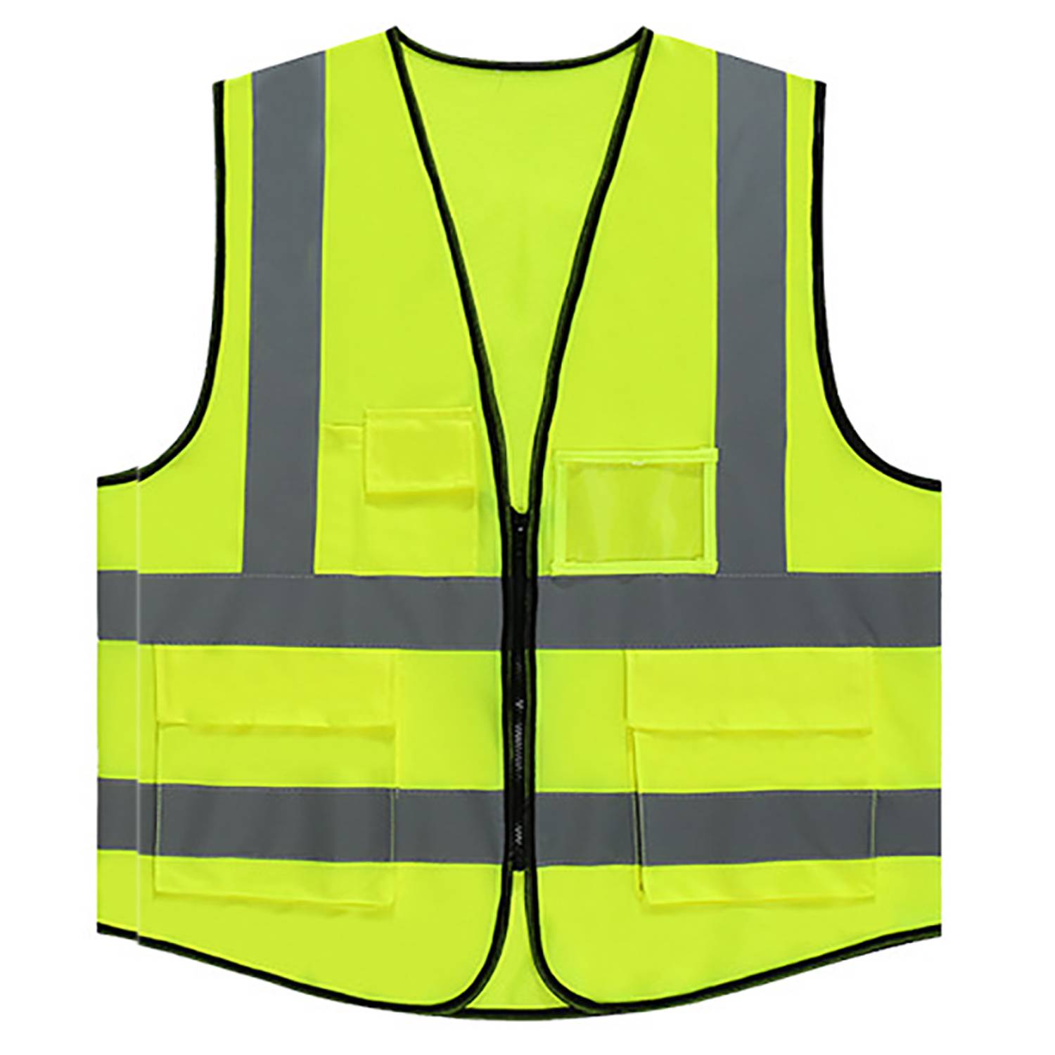 Lightweight polyester safety vest with 360° reflective strips, 4 front pockets, zipper closure. Ideal for running and cycling.